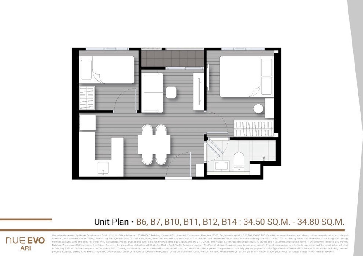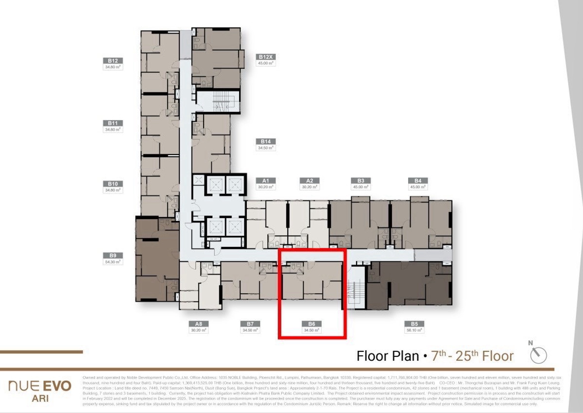 Selling down payment NUE EVO ARI 34.5 sq m, 25th floor, position B6 Pre-sale price 5.99 million - Plus room can be made into 2 bedrooms or an office next to the fire escape, has privacy - View facing