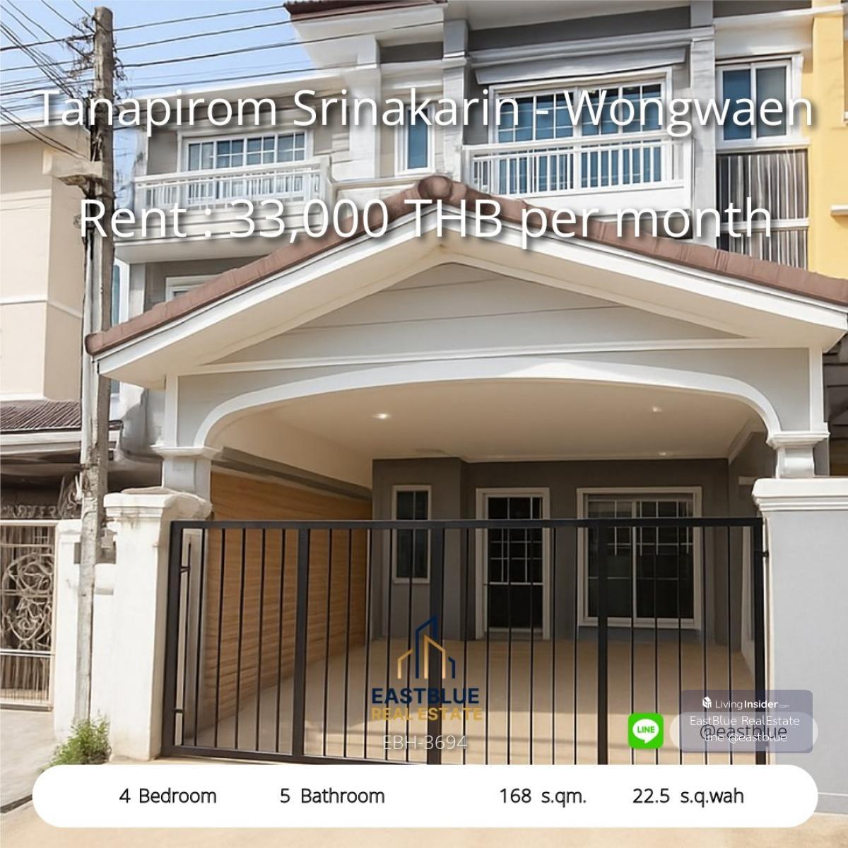 Project : Tanapirom Srinakarin - Wongwaen ID : EBH-3694 4 Bed 5 Baht House Area :168 sqm Land Area :22.5 sq.wah Rental Price : 33,000 THB per month Selling Price : THB . ิติดต่อ Contact, Appointment f