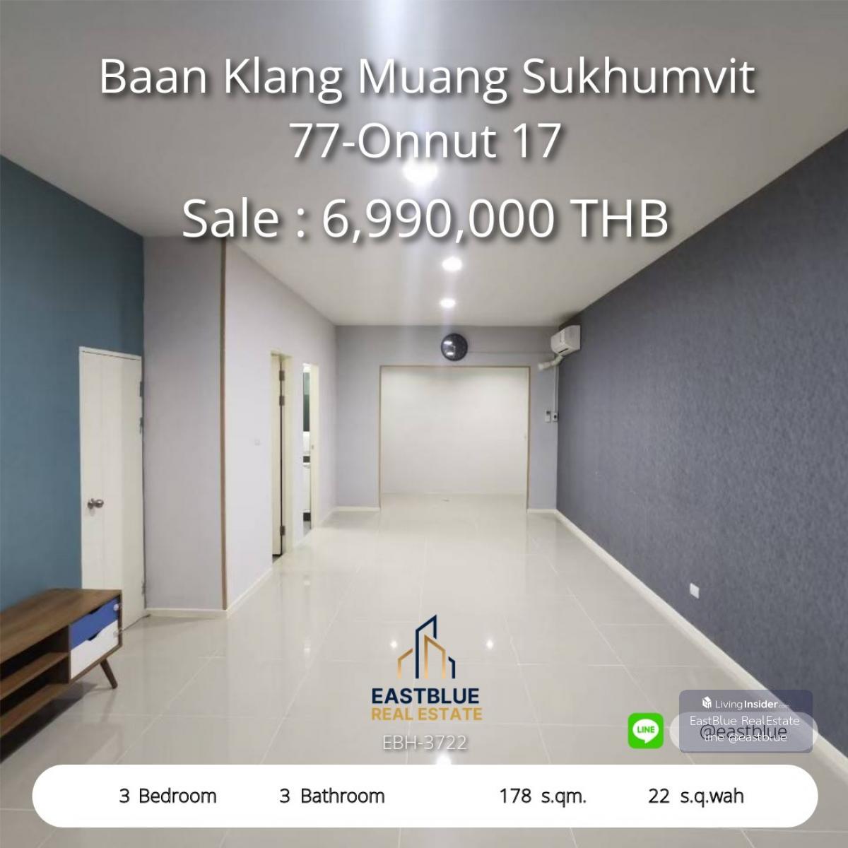 Project : Baan Klang Muang Sukhumvit 77-Onnut 17 ID : EBH-3722 3 Bed 3 Baht House Area :178 sqm Land Area :22 sq.wah Rental Price : THB per month Selling Price : 6,990,000 THB . ิติดต่อ Contact, Appoi