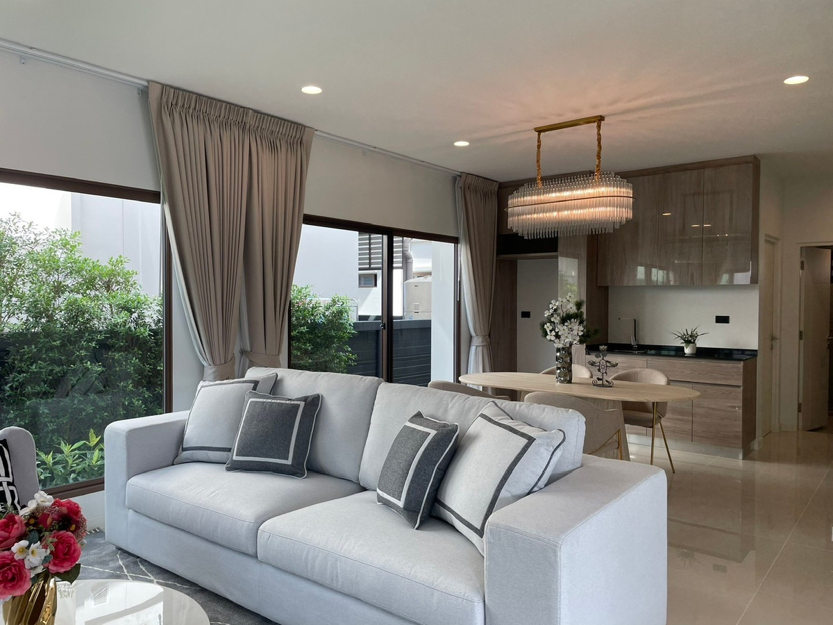 Burasiri Krungthep Kreetha: Land area: 65.2 sqwah Usable area: 238 sqm. 4bed 4bath Thai and Western kitchen 3 parking with EV charger Solar Roof Rent: 160,000/mth. -900 meter from Brighton College -Ne