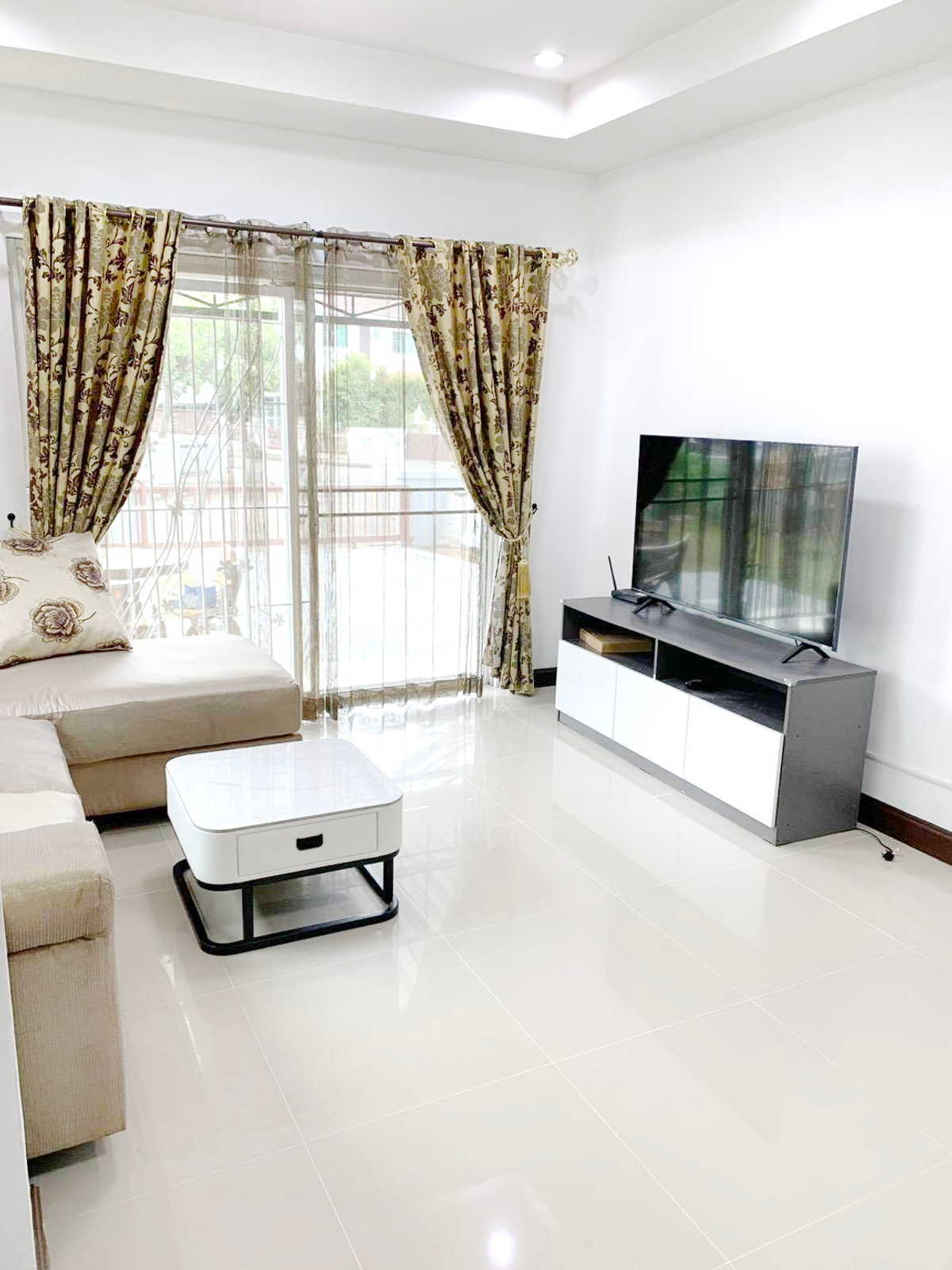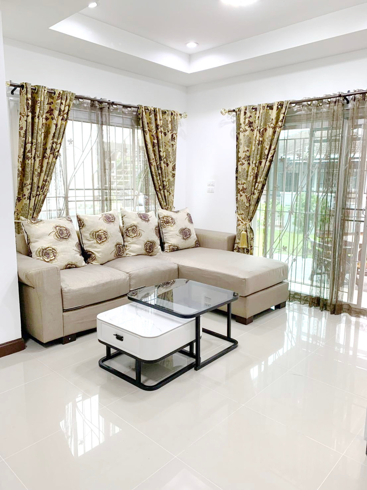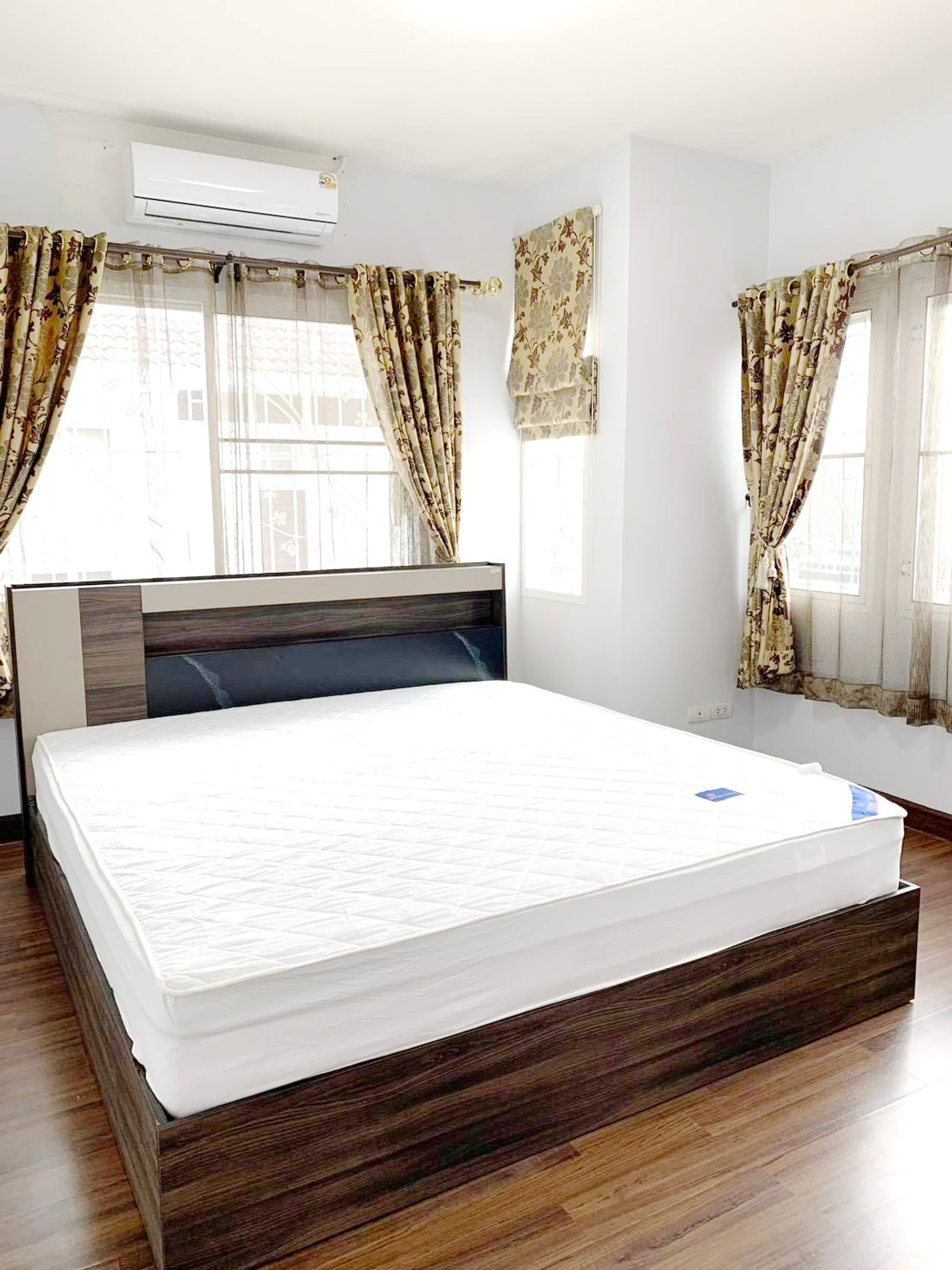 Rental price: 25,000 THB/month 1-year contract (2-month deposit + 1-month advance) • Land size: 85.5 sq.w. | Usable area: 120 sq.m • 3 bedrooms, 3 bathrooms • Fully furnished with new furniture & appliances • Free common area fee • Free home internet • Free lawn care every 2 months Project Facilities • 24-hour security & CCTV • Swimming pool • Fitness • Garden and relaxation area Nearby Places • Tha Rua Market – 2 min • Ui Ta Market – 9 min • Charoen Charoen Market – 12 min • Mill Hill International School – 6 min • Central Festival – 15 min