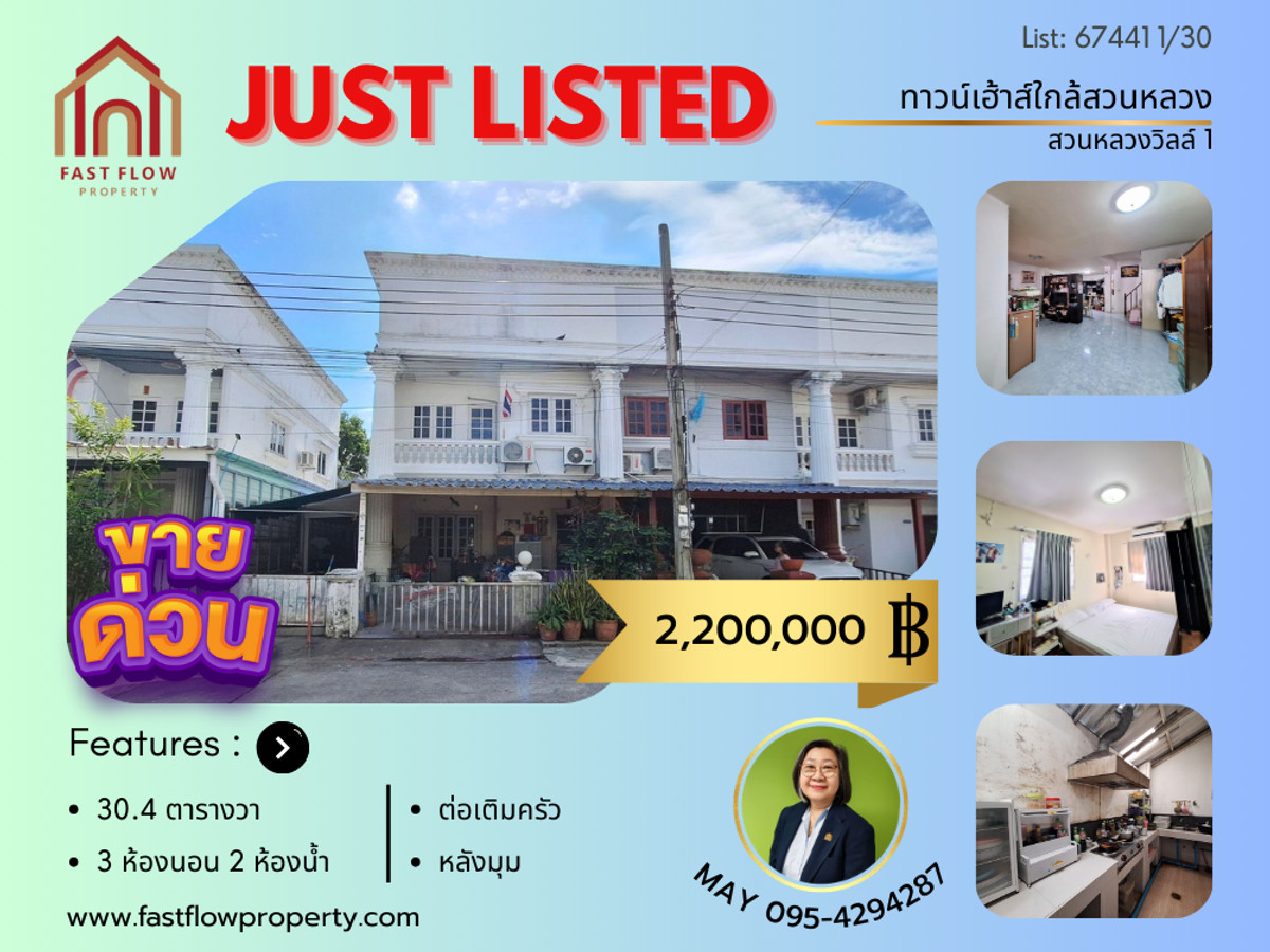 Townhouse for sale in Suan Luang Ville 1 Village. Corner house near Suan Luang Rama IX Park, Chaloem Prakiat Rama IX Road, Soi 28, Intersection 3. Lowest price in the project. Near Ramkhamhaeng University, Bangna, and URA. Contact Uraiwan Fast Flow Property at Contact number Line ID: Contact number Listing No.: 67441 Property Details: - 2-story corner townhouse for sale in Suan Luang Ville 1 Village. - 30.4 square wah land area, approximately 130 square meters of usable space. - The front of the house faces northeast, which helps the house stay cool due to less sunlight and cool breezes during the winter. - 3 bedrooms, 2 bathrooms, and 1 kitchen. - Tiled throughout. - Sold with 3 air conditioners. Project and Facilities: - Suan Luang Ville is developed by Suan Luang House and Land Company. A member of the Wuttichai Group. - Common area fee: 500 baht per unit per year. - 24-hour security. Nearby locations: - Suan Luang Rama IX Park - Mega Bangna, Seacon Square, Paradise Park, Central Bangna - Ramkhamhaeng University 2, Rajavinit Bangkaew School, Ramkhamhaeng University Demonstration School 2 - Thai Nakarin Hospital Location: https://maps.app.goo.gl/ANFjvaDoRtGm7SVu7 Price: 2,200,000 baht Free bank loan assistance! Visits are available daily. Price negotiable. Contact Ms. Uraiwan (May) of Fast Flow Property at Contact number Line ID: Contact number Contact Fast Flow Property: Office Tel: Contact number Line ID: @fastflow FB page: facebook.com/fastflowproperty www.fastflowproperty.com Real estate listing services for all types. Free advertising.