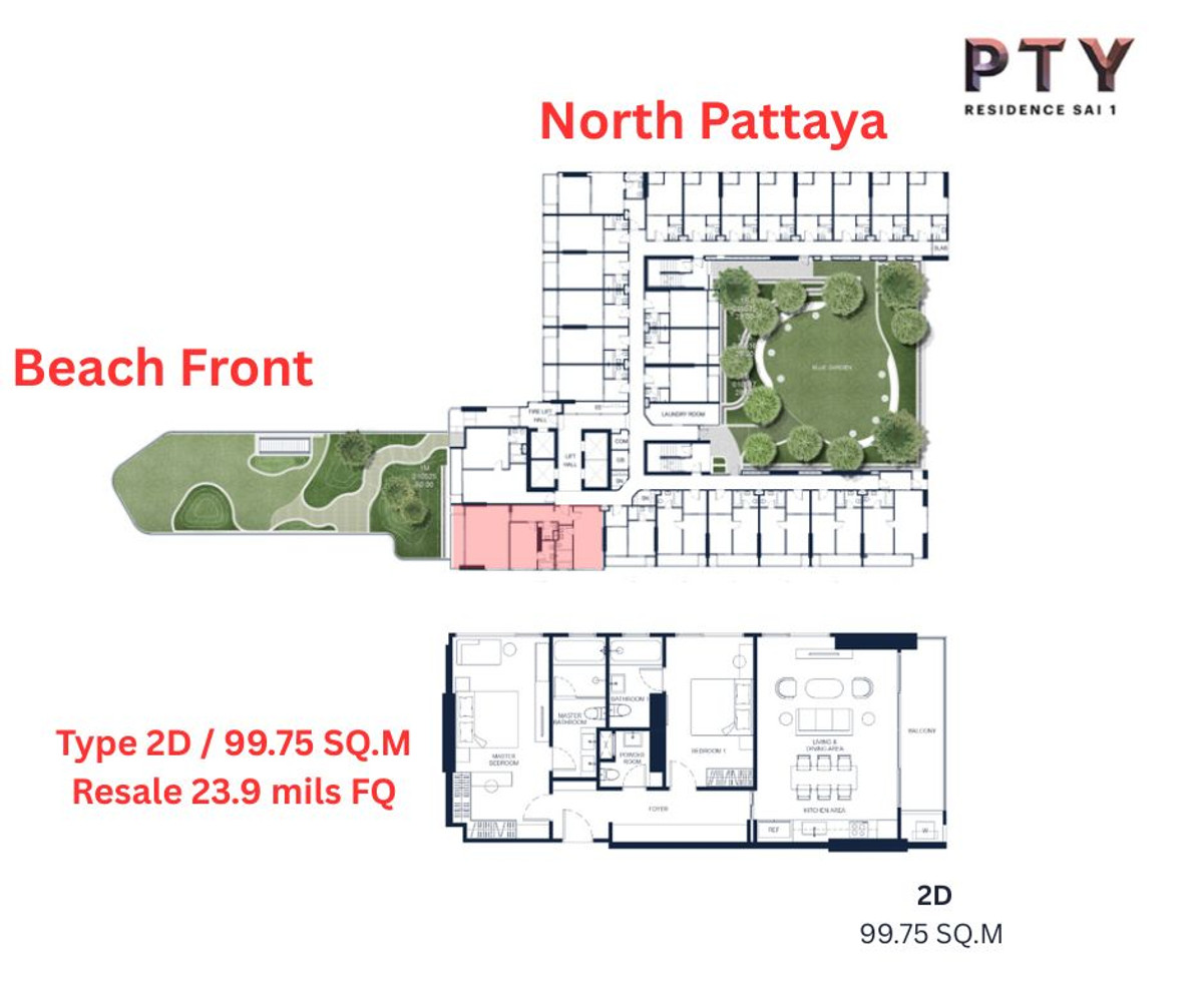 Beachfront Luxury Condo – PTY Residence Sai 1 Pattaya Conner unit with Sea and Garden views 2 Bedrooms | 2 Bathrooms | 99.75 SQM | Beachfront View 💰 23.9 Million THB | Foreign Quota – ✨ Highlights: Pr
