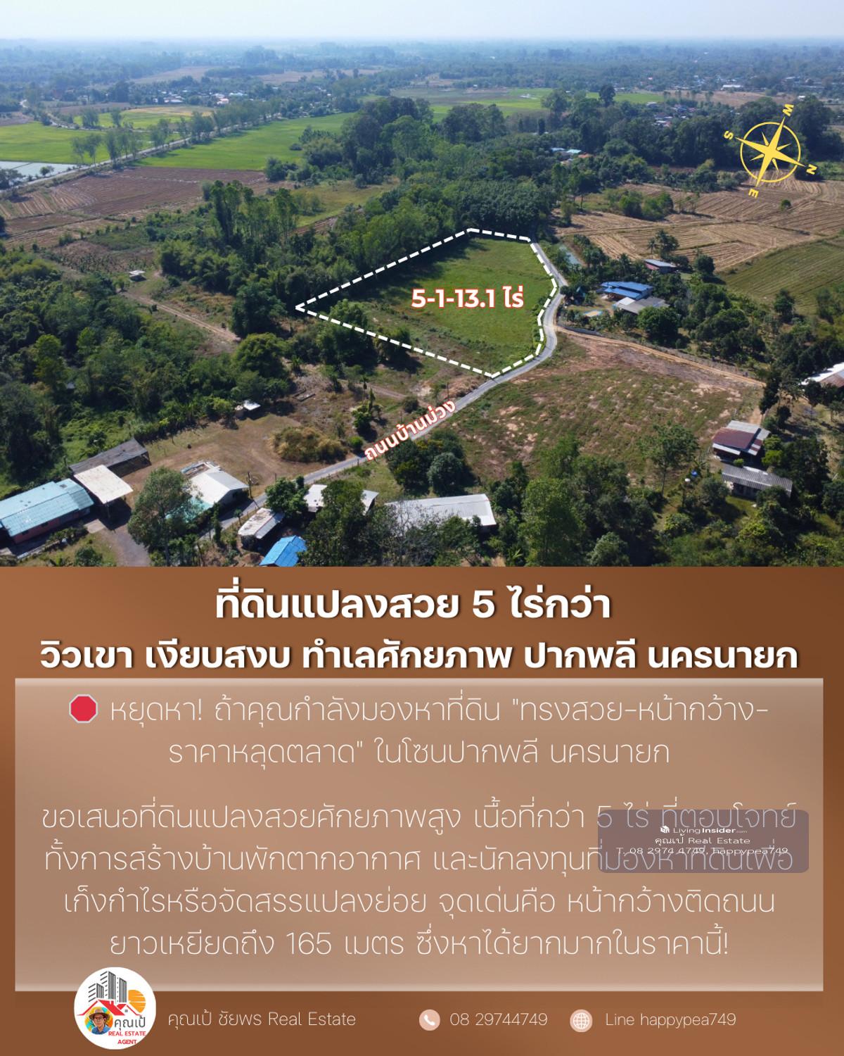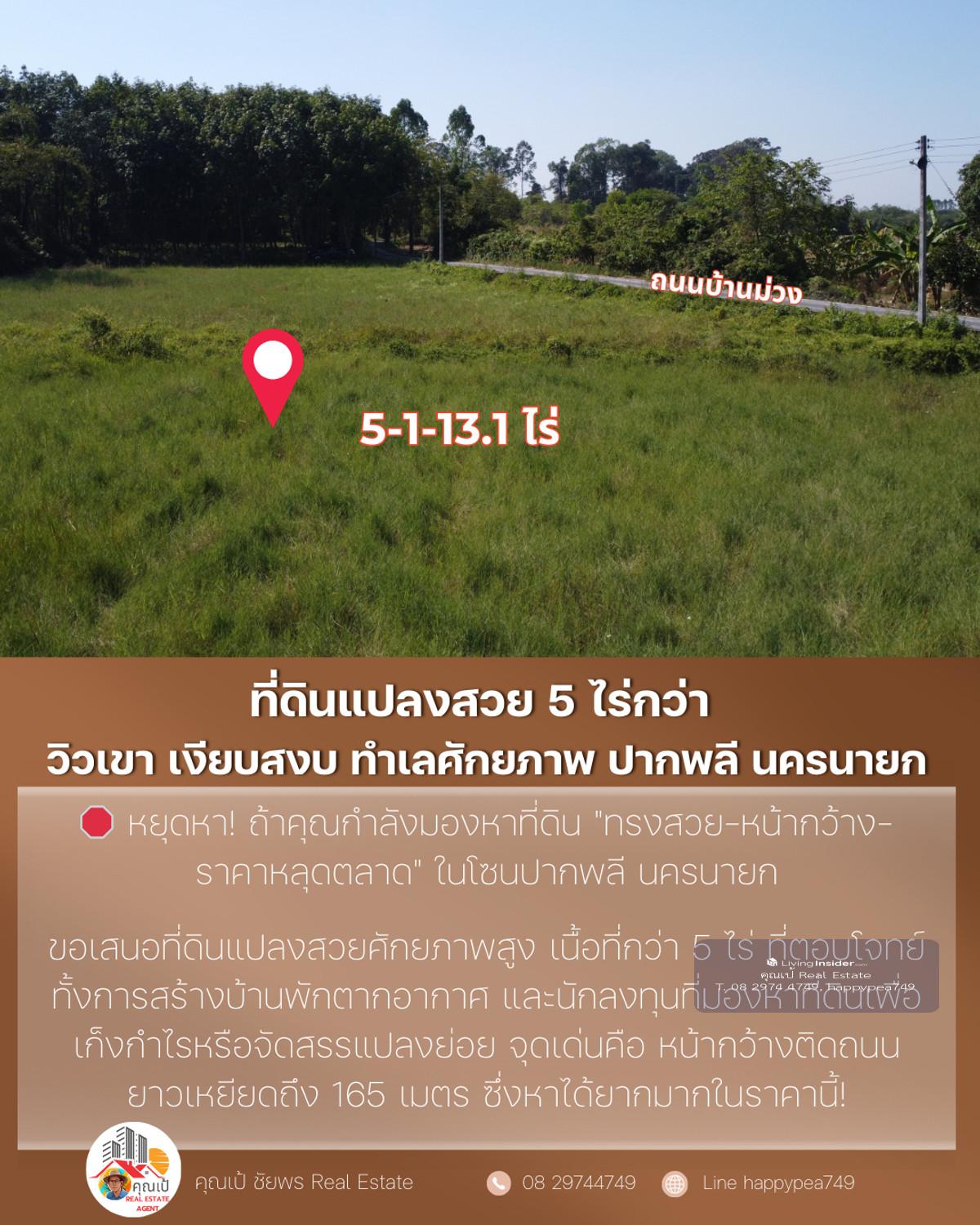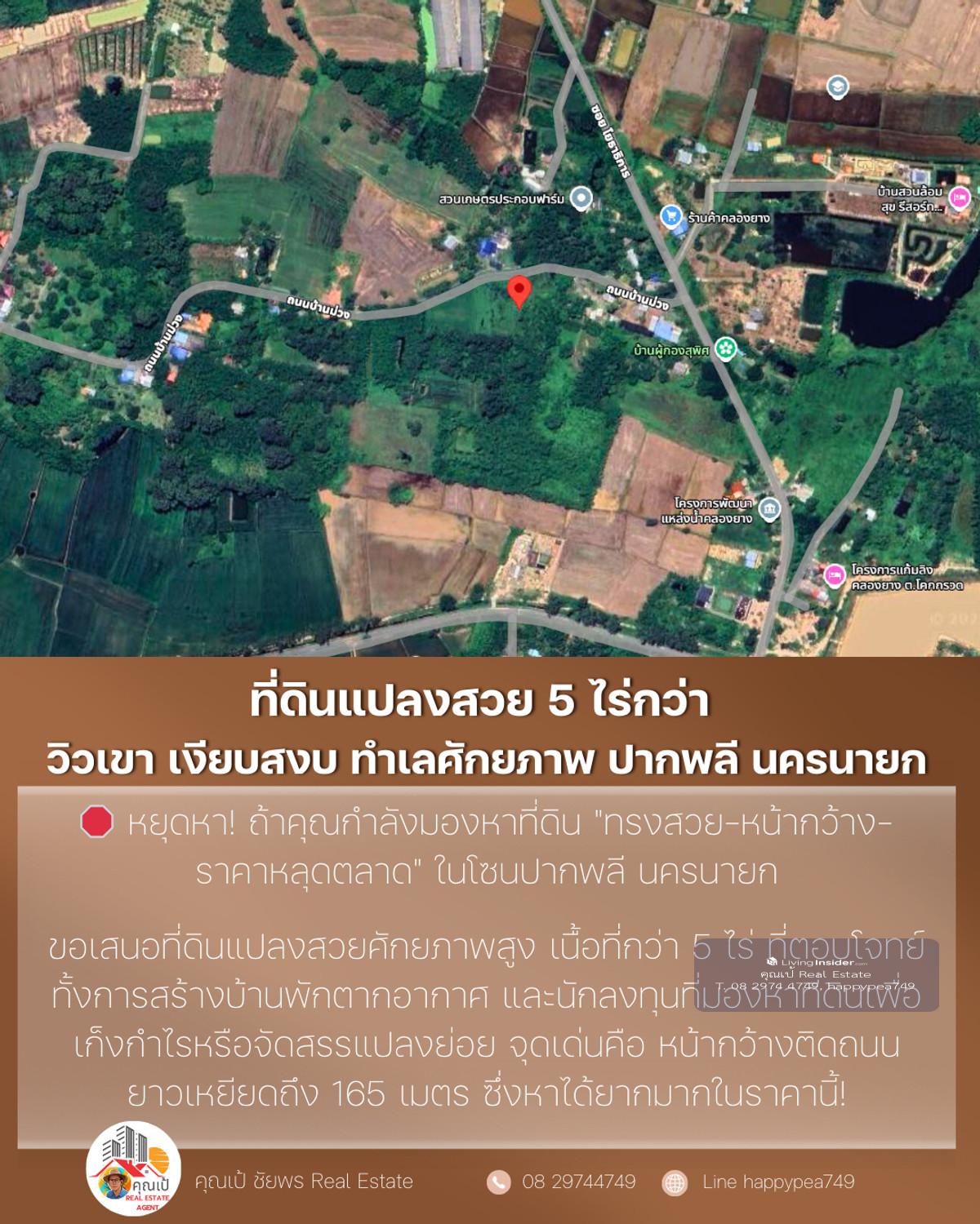 🔥 Best price in this zone. Suitable for building a house, building a resort and investing immediately! 🌟 A location like this...very hard to find! Land next to a paved road. Width over 165 meters with mountain views and surrounding nature , suitable for both "Build your dream house" and "make an investment project" without having to fill in more 📌 Property information (One-Stop Information) 🏷 Property type: Empty land next to a paved road (beautiful plot, good shape) 📐 Land size: 5-1-13.1 rai (total 2,113.1 sq m) 📏 Width - Depth: Width next to road approximately 165 meters, average depth 52 meters 📍 Location: Kok Kruat Subdistrict, Pak Phli District, Nakhon Nayok Province Coordinates: https://maps.app.goo.gl/1D9VhbzjDvhSn8vu5 (14.1834797, 101.3241487) 🗺 Urban planning / Land use: Green — Rural and agriculture (various types can be developed) 🌱 Suitable for: Building a garden house / vacation home Resort / Guesthouse Warehouse Product storage work Small allocation project Investment speculation Very good future land in Pak Phli zone 💰 Offering price: 4,490,337.50 baht (average only 850,000 baht per rai) — The best value in this area! 🌄 Overall location (Location Visioning) The highlight of the plot is "High privacy but very convenient travel" The area is surrounded by mountains, large trees and a community of garden houses. Good atmosphere like a resort Near the main road 3288, just a few minutes , near Rajamangala University of Technology , convenient entry into Nakhon Nayok city , not far from Wang Takrai Waterfall, Khao Chong Lom This zone has very good weather. The wind blows cool all year Suitable for people who want Private space, beautiful views and 100% natural peace 📊 Technical information for investors Productive development shape — width and length, suitable for building multiple housing units or allocating 5–10 plots next to a paved road + with electricity + access to tap water. Reduce development costs Green city plan, able to work on farms, homestays, resorts, houses Most of the area is flat. Reduce land filling costs Price per square wah is 15–25% lower than the market. Suitable for land bank speculation ⭐ 5 outstanding points that strike the hearts of real buyers ✅ Very wide frontage, 165 meters - not often found in this zone ✅ Beautiful mountain view, peaceful, suitable for building a house or resort ✅ Next to a paved public road. Very rare in large plots ✅ The cheapest price in the Pak Phli District zone at present ✅ Surrounded by nature, good water, good soil, good weather 📞 If interested in this plot, contact us immediately before anyone makes a reservation! Khun Pae Chaiphon 📲 Tel: Contact number 📩 Line: happypea749 Press https://line.me/ti/p/WbmkWfUuvu #Land for sale #Land for sale in Nakhon Nayok #Land in Nakhon Nayok #Land for investment #Pak Phli land #Beautiful land for sale #Mountain view land # Land next to a paved road #Cheap land #landforsale #real estate investment #large plot of land