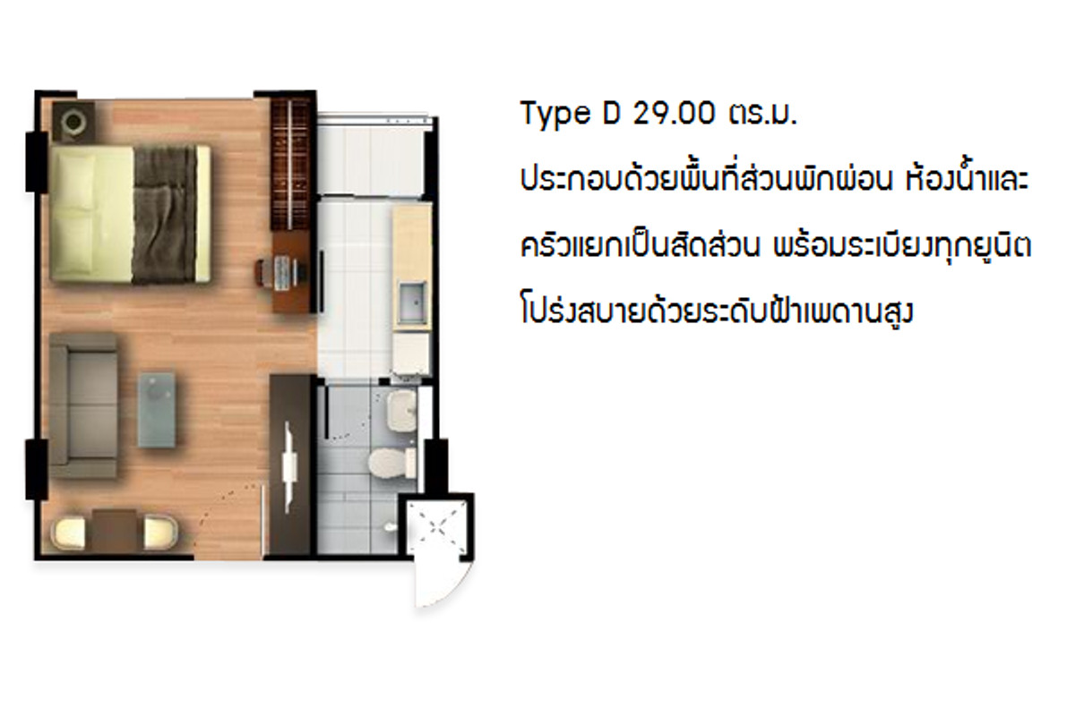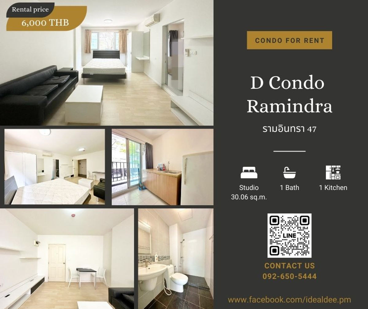 📍D Condo Ramintra from Sansiri is a low rise condominium with 4 buildings, double facility, with lobby in every building Details - Area 30.06 sq m, clean and neat room - 8-story building in Building C, 2nd floor - Balcony facing north - Studio room, separate kitchen (closed kitchen) - Laminate floor / Kitchen with tiled floor - built-in wardrobe, TV shelf, dressing table. Sink counter - Furniture, bed, sofa, coffee table, 2-seat dining table - Electrical appliances, refrigerator - Common area, about 10,000 baht/year - Room ready to transfer Location - Next to Ramindra Road. Next to the mouth of Soi Ramintra 47 Project facilities - Swimming pool, fitness – Security guard, CCTV Nearby places 1. Big C 2. Tesco Lotus 3. Foodland 4. Central Ramindra 5. Fashion Ireland ========================================== Rental price 6,000 baht/month, including common areas, including parking =========================== If interested, you can make an appointment to see the place. Call/whatsapp Contact number Line. https://lin.ee/dNJdqcT Broker under Vision Forward Real Estate Co., Ltd. and member of the Thai Real Estate Brokers Association.