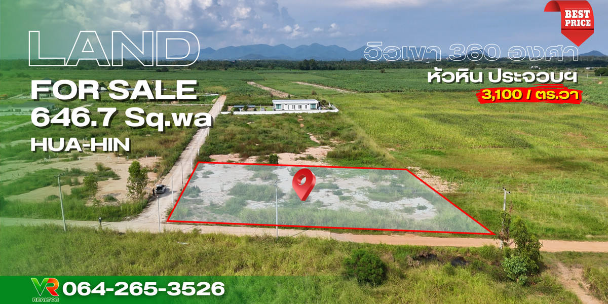 Land for sale, 360 degree mountain view, Hua Hin The life youre looking for. Perceived value A dream for those who love natural atmosphere Price in the thousands, Dream Area, land for sale, beautiful mountain view, close to the sea , close to Hua Hin tourist attractions. Prachuap Khiri Khan only 20 minutes The land is at street level, next to the road on 2 sides, facing south, 56 meters above sea level . No worries about flooding. Electricity, water, ready to go to the front of the plot. There are neighbors . Near the community market * Land 1-2-46.7 rai (646.7 sq m * Land 56 M above sea level * High condition at road level Land size is 53 * Title deed Nor Sor.4J, Red Garuda, plot: facing south (53 meters next to the road)* Public road 16 M, concrete poured 8 meters wide * Price 2,000,000 baht (3,100 baht/square wa), best value in this area * Expenses on the day of transferring ownership, everything is half a person. Future opportunities :- * Close to Bangkok, only 3 hours * 360 degree mountain view, close to the Hua Hin sea Important nearby places :-* Wat Nong Kha, Hin Lek Fai Subdistrict Administrative Organization, * Nong Chik Reservoir, * Silpakorn University Phetchaburi Campus * Hua Hin Market/Hua Hin Night Market* Banyan Golf Club Hua Hin * Huai Mongkol Temple, Hua Hin Beach, Special promotion: Book today for great value. More profitable than the previous owner of the location 📍Ban Nong Kha, Hin Lek Fai Subdistrict, Hua Hin District, Prachuap Khiri Khan 77110 Google Map : https://maps.app.goo.gl/FqMqszJUkiu5L ...──────────── Price 2 million baht -+-+-+-+-+-+-+-+-+-+-+-+-+-+- For more details and to make an appointment to visit the actual property, contact: Khun Kao: Contact number Khun Som: Contact number -+-+-+-+-+-+-+-+-+-+-+-+-+-+- Line ID ➲ : @vrrealtorhttps://lin.ee/hczlz0XQO -+-+-+-+-+-+-+-+-+-+-+-+-+-+- YouTube :https://www.youtube.com/@VRREALTORTHAI -+-+-+-+-+-+-+-+-+-+-+-+-+-+- VR REALTOR CO.,LTD https://www.winnerestatesale.comProfessional real estate broker, free marketing , free advertising, free loan service 4289 6395 -+-+-+-+-+-+-+-+-+-+-+-+-+-+- #Worth it since you made the decision. #Profit from purchase #Land Hua Hin #Cheap mountain view land #Seaside land #winnerestatesale #vrrealtor #land above sea level, #buy land for profit, #Hua Hin location near the sea, #investment real estate #4289 #6395