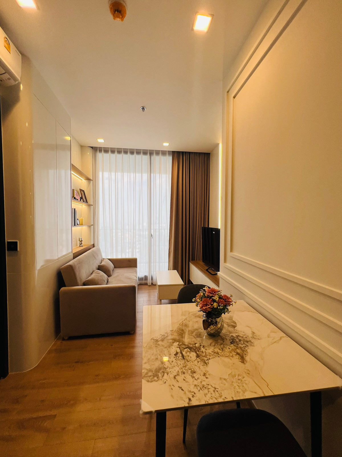 Room details 1 bedroom / 1 bathroom Area size 34.87 sq m 38th floor (top floor, panoramic city view) Fully furnished and electrical appliances Smart TV, washing machine Separate kitchen (refrigerator, microwave, electric stove, range hood) Water heater, Digital Door Lock Amenities Rooftop salt swimming pool 360° Fitness, Sky Lounge, Library, Co-kitchen Relaxation garden, Parking 24 hour security system 💎 Price 28,500 baht/month (minimum 1 year contract) 🔑 Room insurance 2 months, rent 1 month in advance, total 3 months If interested contact Contact number LINE&PHONE