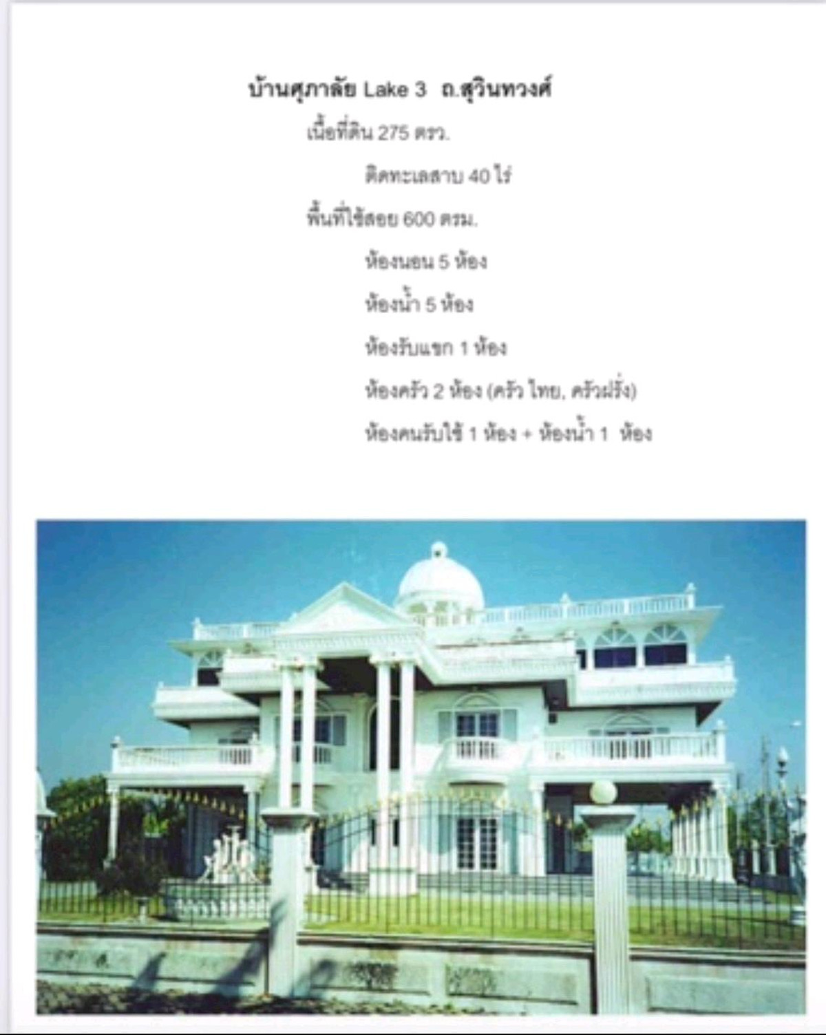 For sale: 3-story detached house next to the lake - Supalai Lake 2 Village (Suphalai Lake 2), Khum Klao 5, Lat Krabang, Suwinthawong - according to Feng Shui principles. The front of the house faces the lake. Get a full view of the lake - Built on 275 sq m of land - More than 1100 sq m of usable space - 5 bedrooms, 5 bathrooms, 1 living room, 1 living room, 2 kitchens, 1 servant room, en-suite bathroom - Parking for 10+ cars - Empty house, Roman style structure, stucco pillars, very strong structure - The area around the house is quiet, peaceful, shady - suitable for business owners who need accommodation in Bangkok. and also has a view of the lake, renovated into an office/office, Nearby places - Suvarnabhumi Airport (25 minutes) - Motorway (20 minutes) - Lat Krabang Industrial Estate (15 minutes)- Minburi Market (15 minutes) - Airport Link Lat Krabang (20 minutes) 📍Location: https://maps.app.goo.gl/g6NGzVivmB9VwJjv5 Price 20,000,000 Baht 📍Submit a banknote for free, no cost