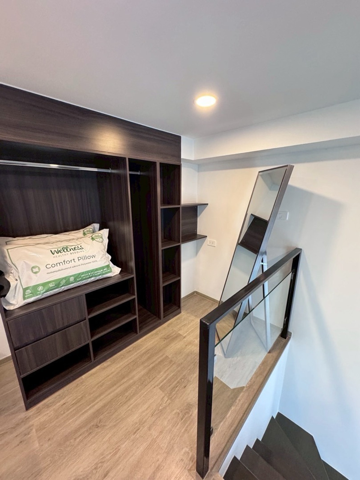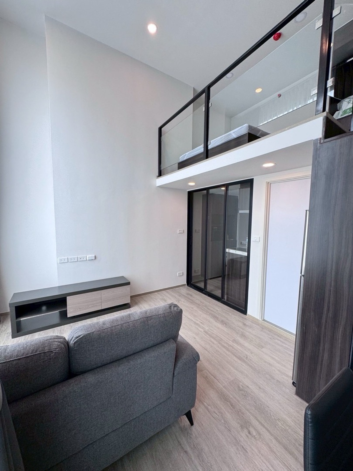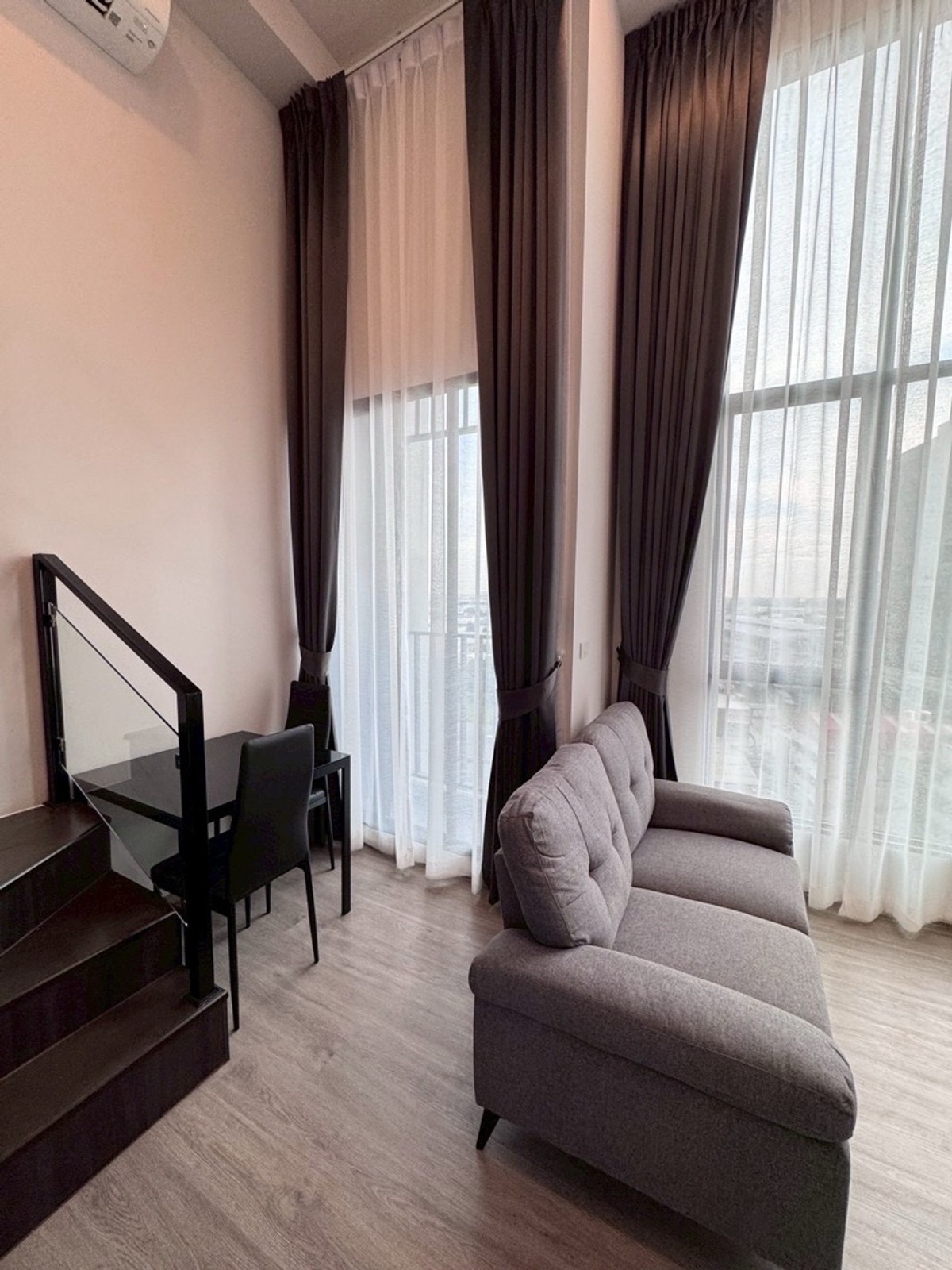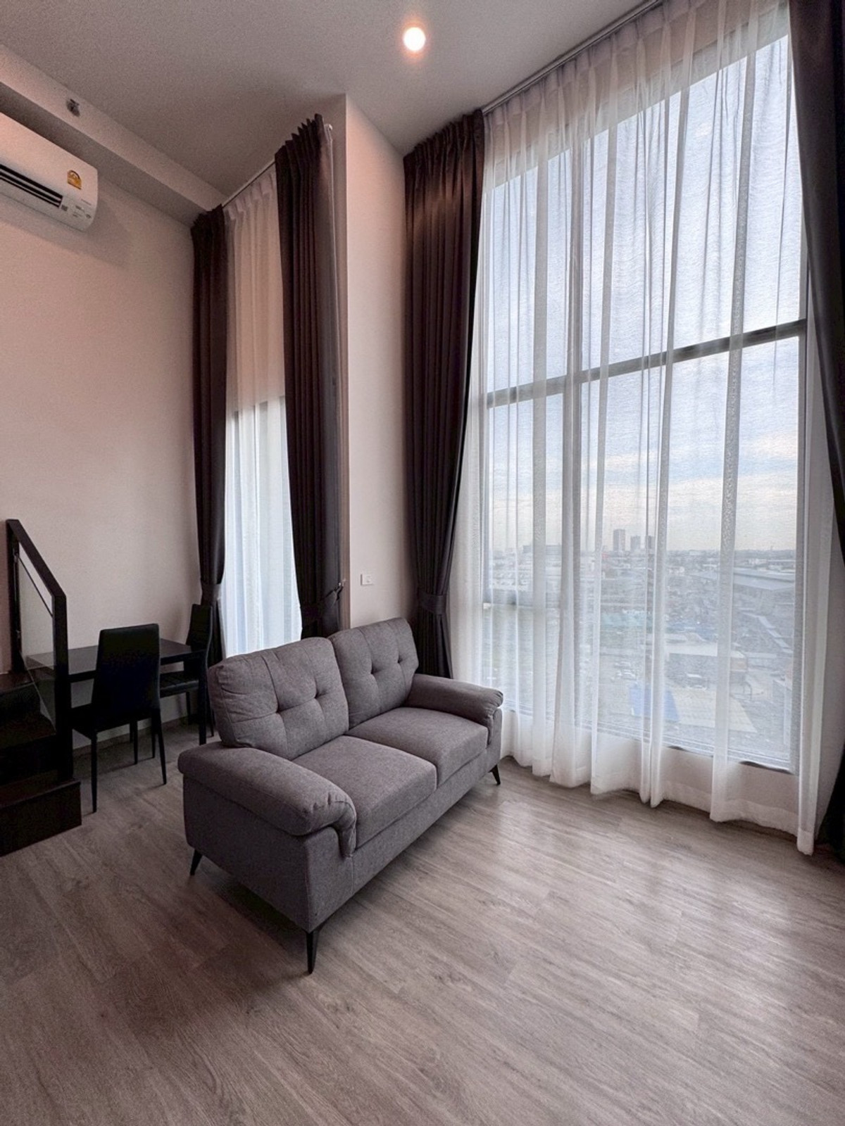 New condo for sale! Ceiling height 4.2 m. DUO SPACE next to the BTS Pink Line Origin Plug & Play Ramintra Corner room, facing out, city view, Building A, 9th floor, area 21.67 sq m. Comes with another 10 sq m mezzanine, new original room. Ready to move in yourself and can be rented out With a good location - near 2 expressways, easy travel to the airport. Both Suvarnabhumi and Don Mueang - near Fashion Island Department Store - near Synphaet Hospital Ramintra - Near Mingmit Market, Ramintra KM.9 - Near The Alley Ramintra - Near KFC open 24 Hrs Ready to move in!! With various amenities - 29000BTU air conditioner - Refrigerator - Washing machine - Water heater - Microwave - Range hood - Electric stove - Kitchen apron wall - Curtain - Sofa - Table, chairs - TV shelf - 5 foot bed with 6 inch thick rubber mattress, Protective cover, 2 pillows