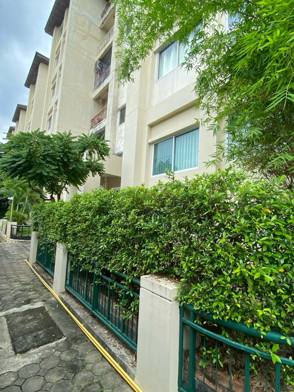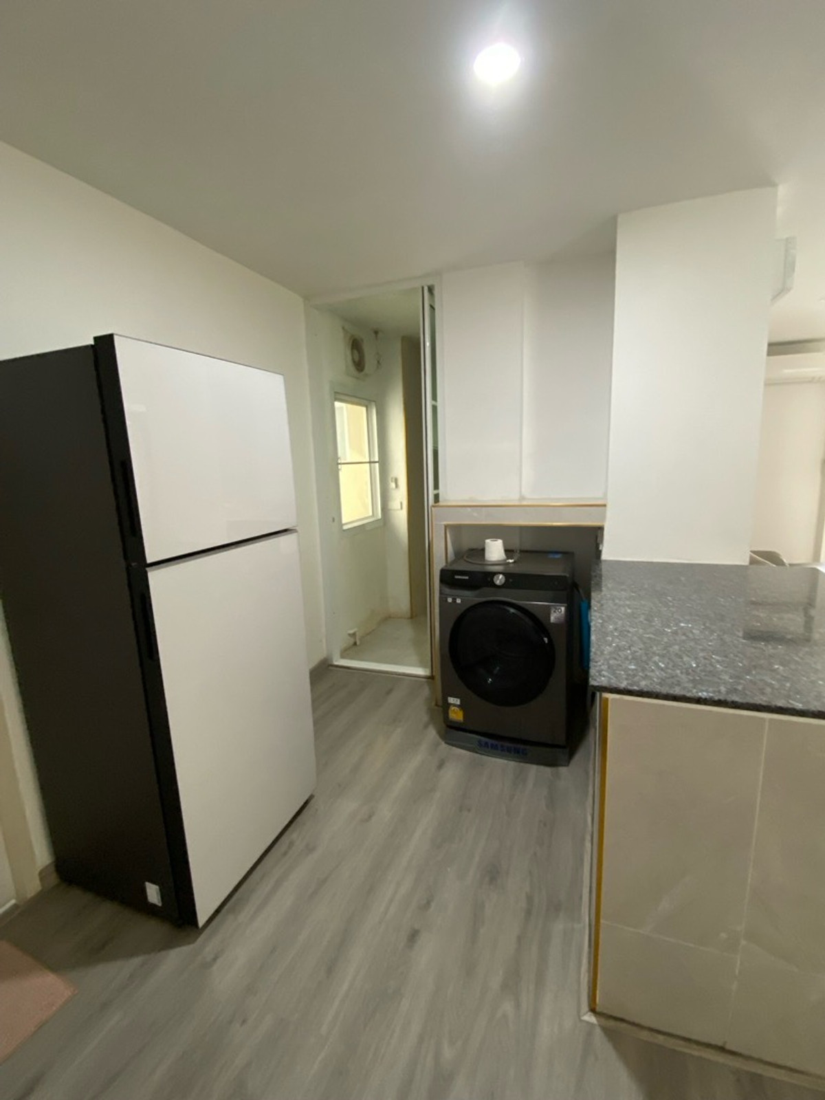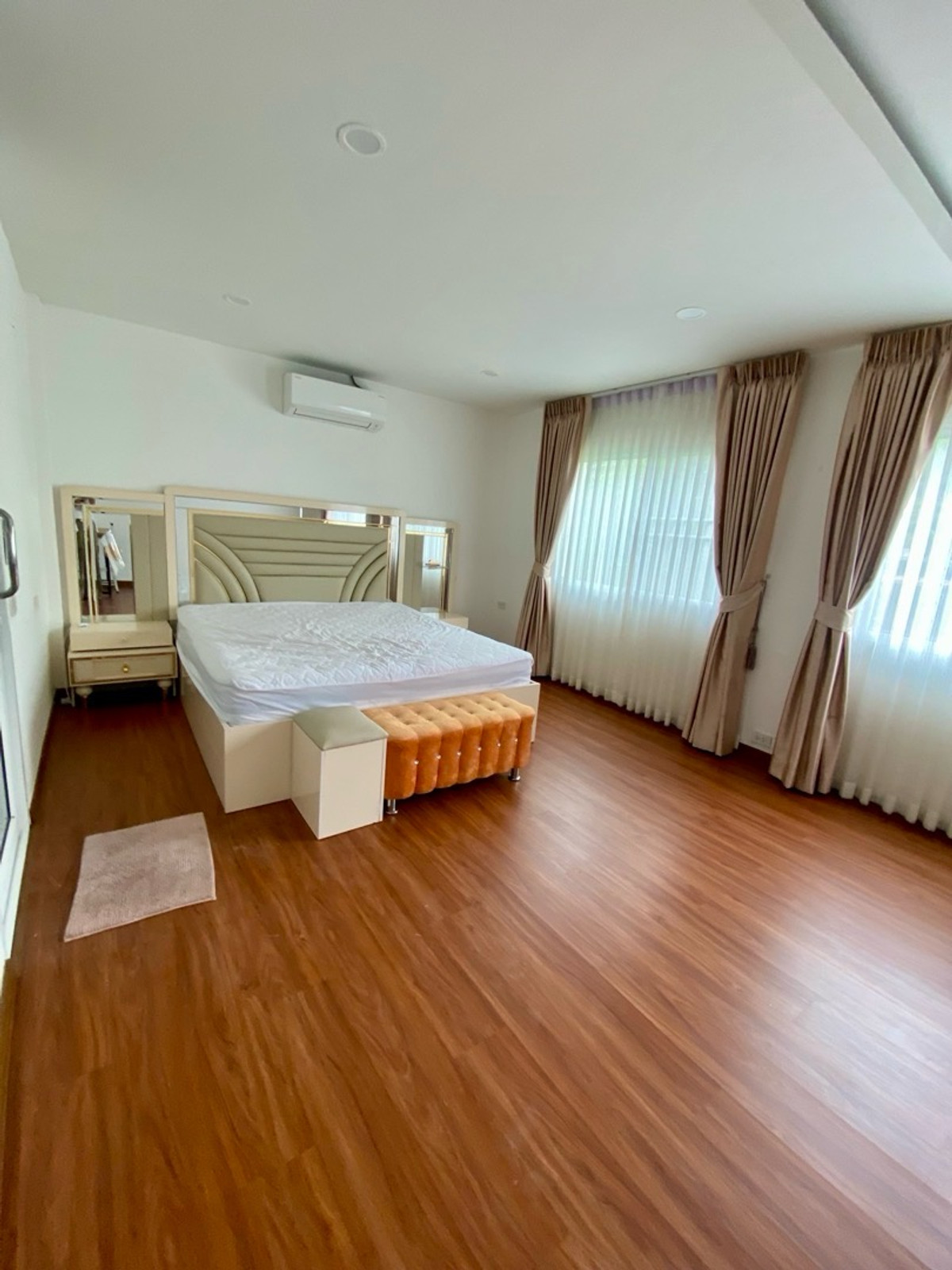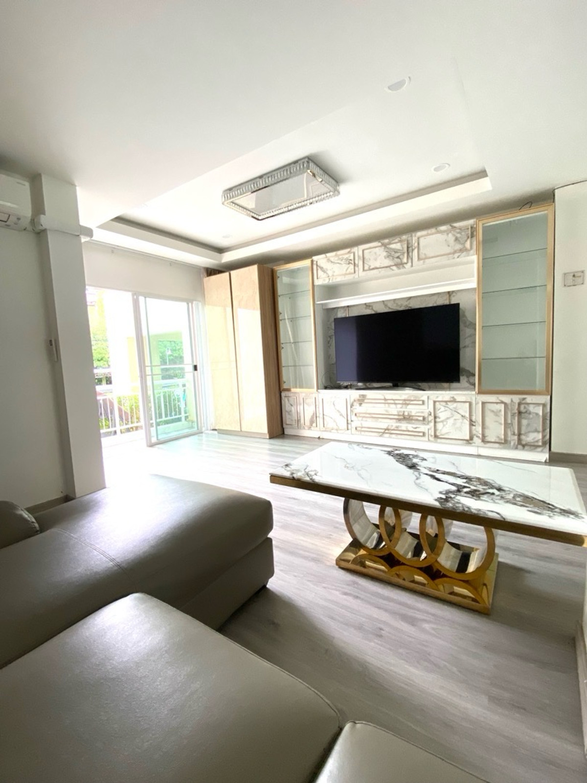 120 sq m condo near a shopping mall, 20 minutes from Suvarnabhumi Airport. Details: First floor condo with 3 bedrooms, 2 bathrooms, balcony and garden, and EV charging support. furniture included. Master bedroom bed and mattress Sofa Wardrobe 60-inch TV Washing machine and dryer system. Kitchen with stove and hood Refrigerator Air conditioning in all rooms Water heater Bathroom: Master bedroom has bathtub and shower Second bathroom with shower Pets friendly 4 parking is included