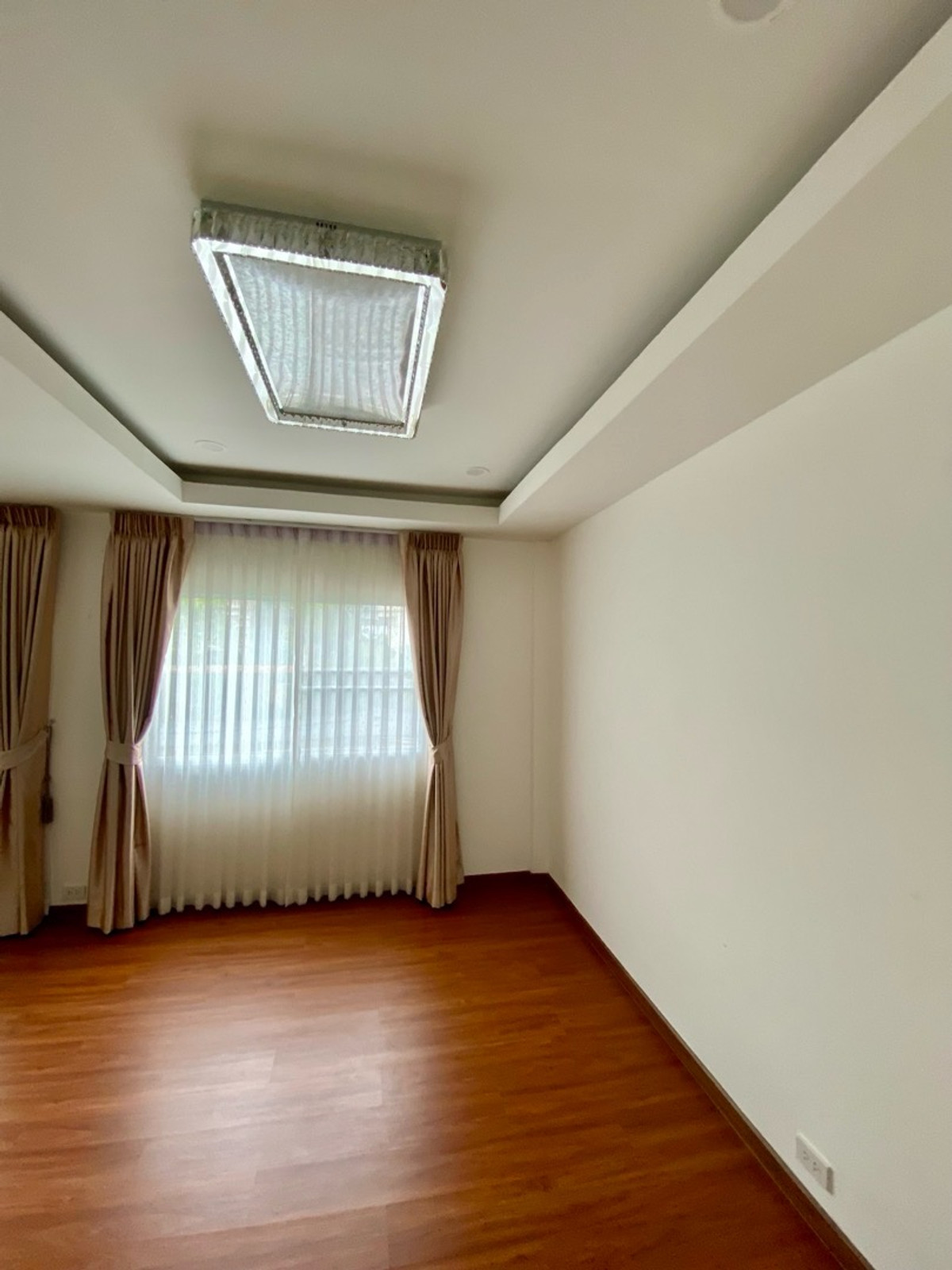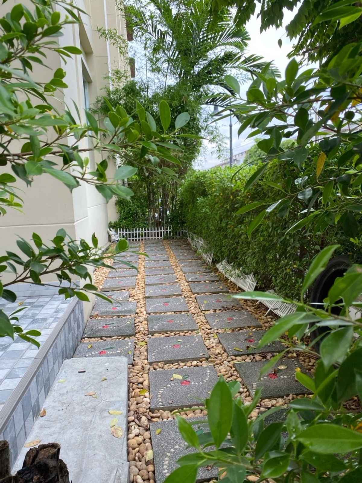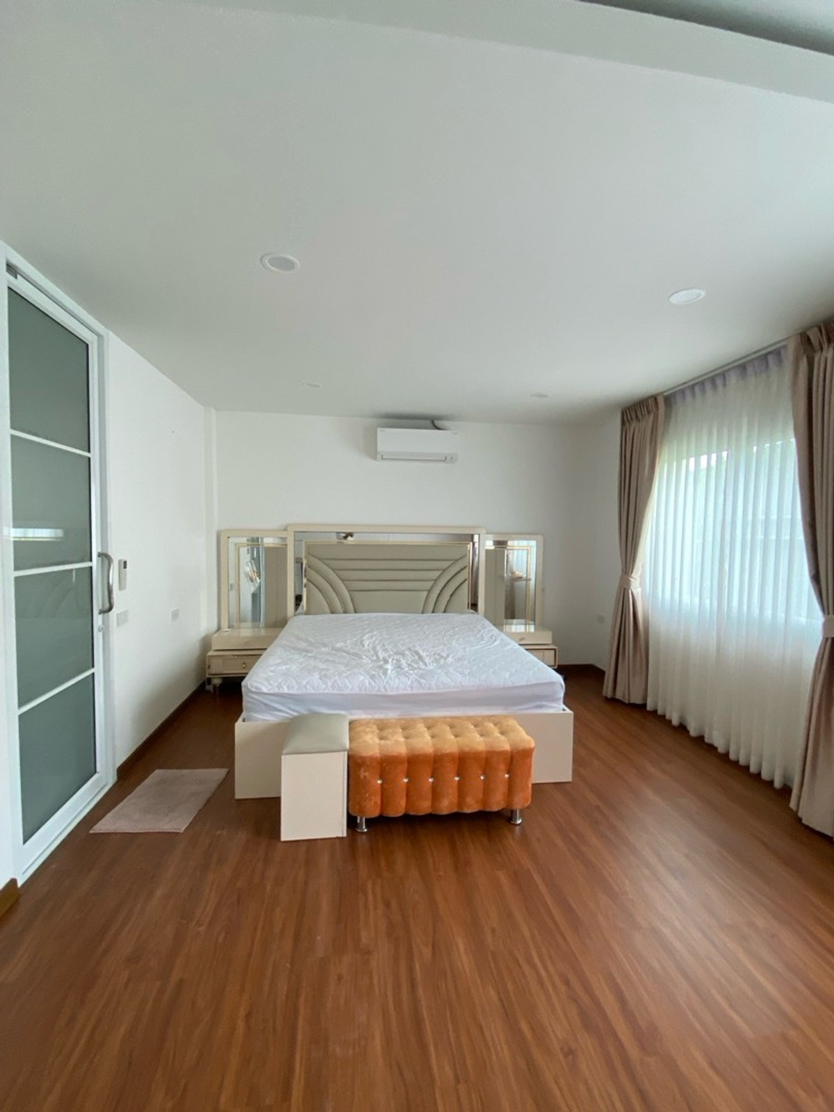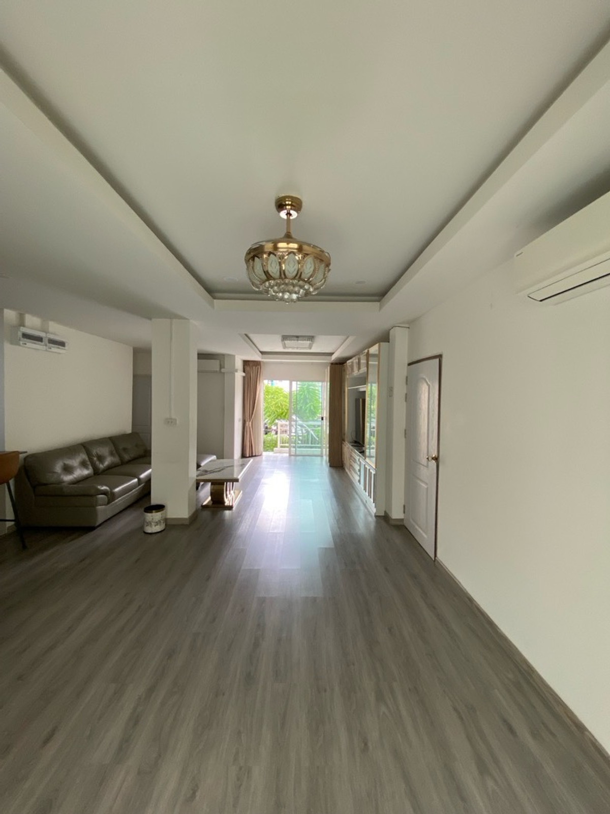 120 sq m condo near a shopping mall, 20 minutes from Suvarnabhumi Airport. Details: First floor condo with 3 bedrooms, 2 bathrooms, balcony and garden, and EV charging support. furniture included. Master bedroom bed and mattress Sofa Wardrobe 60-inch TV Washing machine and dryer system. Kitchen with stove and hood Refrigerator Air conditioning in all rooms Water heater Bathroom: Master bedroom has bathtub and shower Second bathroom with shower Pets friendly 4 parking is included