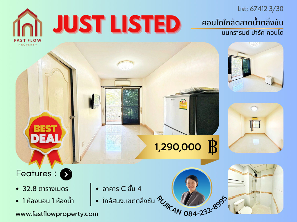 For Sale - Lowest Price in the Project! Nontharom Condo Park, 4th Floor, Building C. Convenient location near Taling Chan District Office, Chak Phra Road, Chim Phli Road, Bang Khun Non Road, and Chaiyaphruek Road. RUJ Contact: Rujikarn, Fast Flow Property Contact number Line id: omg0272 Listing no: 67412 Room Detail: - Condo for sale, Nontharom Condo Park project - Located in Building C, 4th floor - Usable area 32.80 square meters - 1 bedroom, 1 bathroom - 1 air conditioner Project and Facilities: - Nontharom Condo Park project developed by Nontharom Co., Ltd. - Common area fee: 23 baht per square meter per month - CCTV and 24-hour security Nearby Places: - MRT Bang Khun Non - Siriraj Hospital - Taling Chan District Office - Taling Chan Floating Market - Central Pinklao, Central WestVille Location: https://maps.app.goo.gl/HqPu9ATEiUPWheft5 Price: 1,290,000 THB Free bank loan assistance service! Viewing available daily. Price negotiable. Contact: Rujikarn (A) Contact number Line ID: omg0272 Contact Fast Flow Property Office Tel: Contact number Line ID: @fastflow FB page: facebook.com/fastflowproperty www.fastflowproperty.com Real estate sales service for all types of properties. Free advertising.
