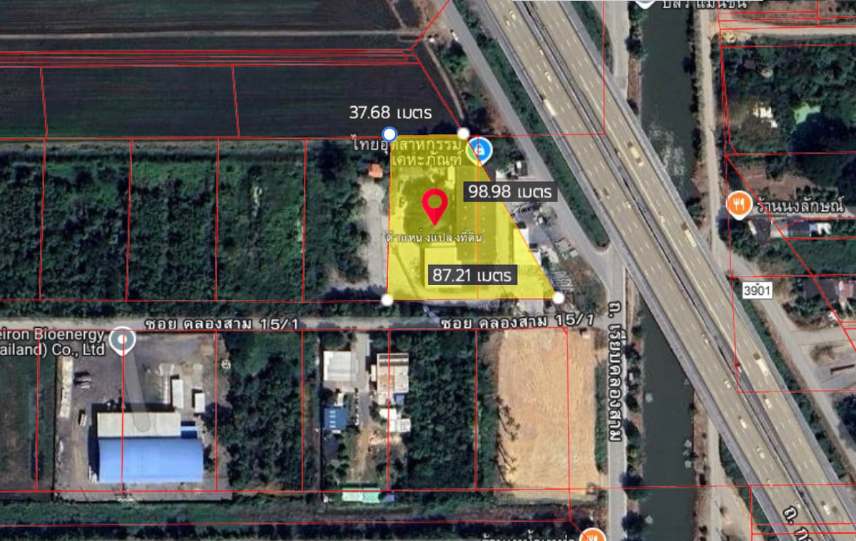 3 rai of land along Kanchanaphisek Khlong Sam, has a warehouse of 900 sq m. ready for use - Land is located in Khlong Sam, Khlong Luang, Pathum Thani Province - It is land with buildings. Land area 3 rai 2 ngan 40 square wa - Steel structure warehouse. tile roof Usable area 900 square meters - is already filled in land. The land plan is a trapezoid, the front is 98 meters wide, the back is 85 meters wide, the left side is 87 meters deep, the right side is 37 meters deep - in front of the land is a public road. Outbound Kanchanaphisek Road From Khlong Luang to Bang Pa-in - there is a telephone signal tower on the land. Its rented by True and AIS. Total annual income of two hundred thousand baht - The land is used as a warehouse and building materials store Nearby important places - Near Phra Dhammakaya Temple - Near Thai Market - Near the district office and police station - Near Thammasat Hospital, Rangsit Center - Near the Kanchanaphisek Bang Pa-in Expressway. Thammasat Expressway Chaengwattana