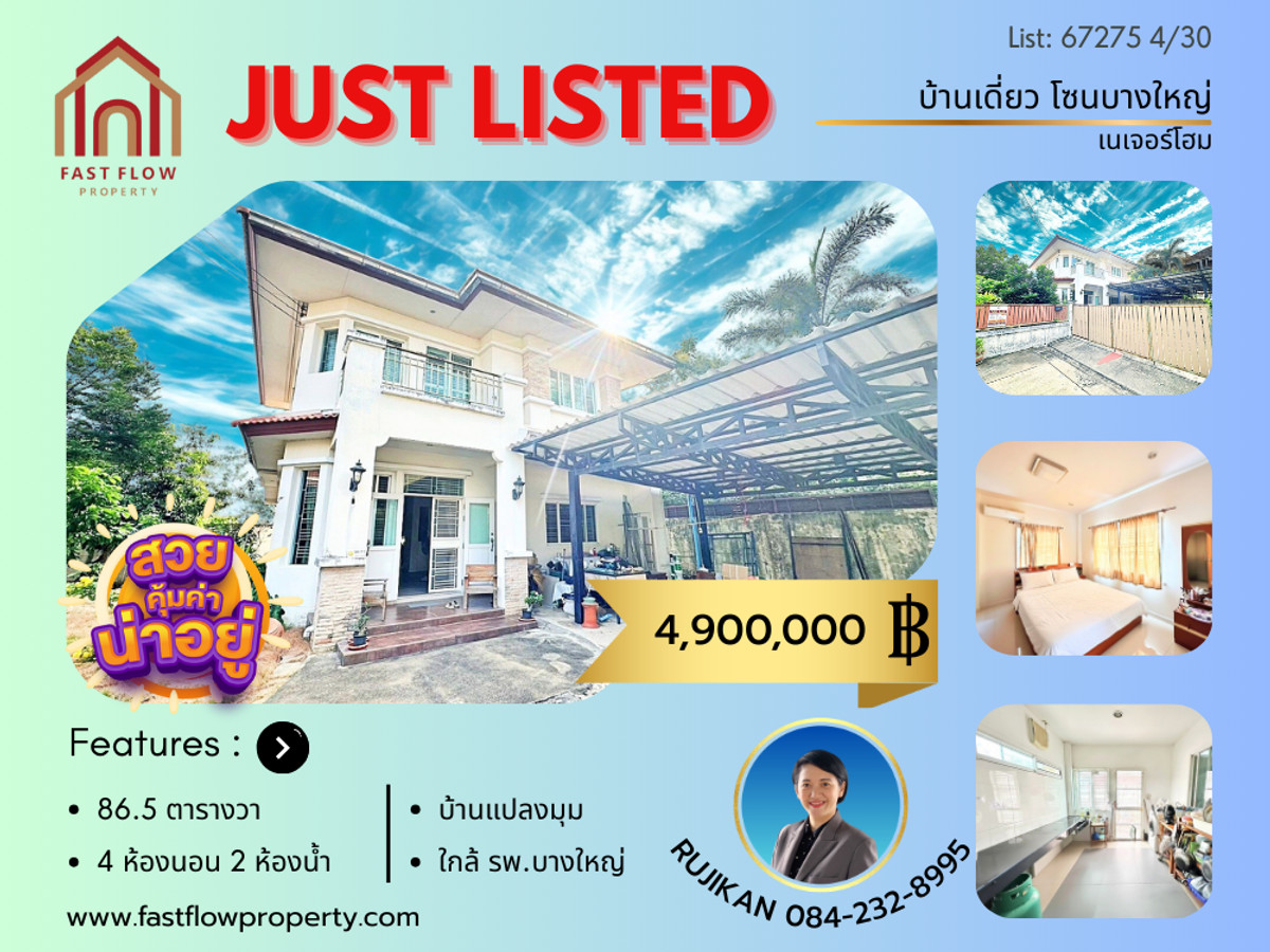 For Sale: 2-story detached house, corner unit, Nature Home Wongwaen-Rama 5 Village, Kanchanaphisek Road, Wat Sangworapimolpaiboon Road, near Lotus Bang Yai, Bang Yai-Bang Koolad Road. Rawanich Business Administration Technological College. Contact: Rujikarn, Fast Flow Property, Contact number Listing no. 67275A Property Details: - For sale: 2-story detached house, corner unit, Nature Home Wongwaen-Rama 5 Village, Wat Sangworapimolpaiboon Road. - Land area: 86.50 square wa (approximately 324.4 square meters) - Usable area: 180 square meters - 4 bedrooms, 2 bathrooms, 1 storage room, 1 living room, 1 kitchen - North-facing, minimal direct sunlight, cool and comfortable. - Extended Thai kitchen at the back of the house, full area, with high-quality concrete kitchen counter and range hood. - Extended carport with tiled floor. - Covered parking for 2 cars. - Corner house, quiet and peaceful. - The front of the house faces a side without power poles, keeping it clean and safe. - Includes 1 air conditioner. - Ground floor bedroom with en-suite bathroom, ideal for the elderly. Project and Facilities: - Nature Home project developed by Meena Housing Co., Ltd. - Garden area. - Common area fee: 15 baht per square wa per month (1,298 baht per month). - CCTV and 24-hour security. Nearby Places: - Central WestVille/Westgate - Denla Kindergarten Rama 5 - Bang Yai Hospital/Kasemrad International Hospital Rattanathibet - Thepsirin Nonthaburi School Location: https://maps.app.goo.gl/Liqc8RP4AjZSgpSb6 ***Selling Price: 4,900,000 baht*** Free assistance with bank loan arrangement! Viewing appointments are available every day. Prices are negotiable. Contact: Rujikarn, Fast Flow Property, Contact number Office Tel: Contact number Line id: @fastflow FB page: facebook.com/fastflowproperty www.fastflowproperty.com We offer free advertising for all types of real estate sales and listings.