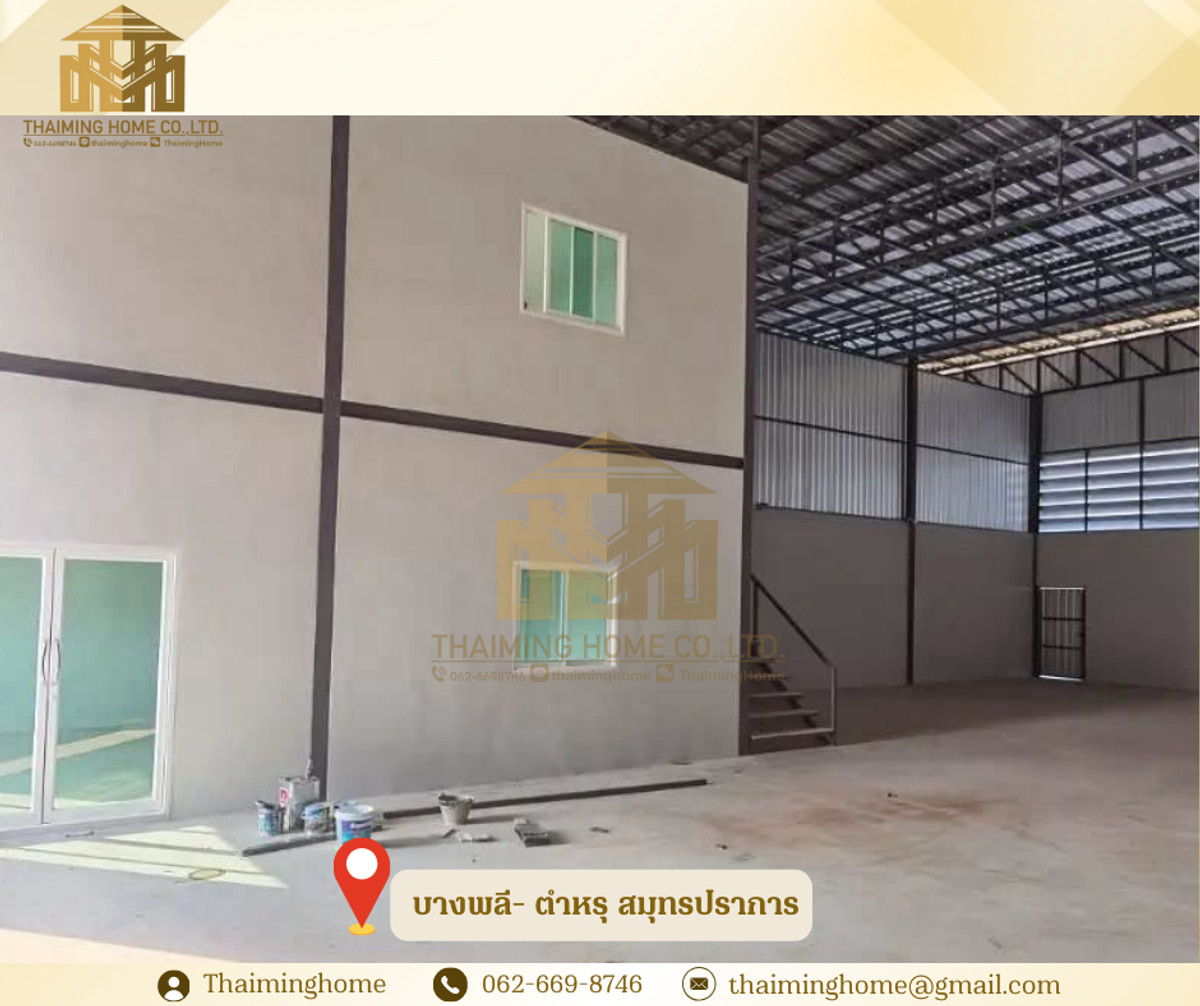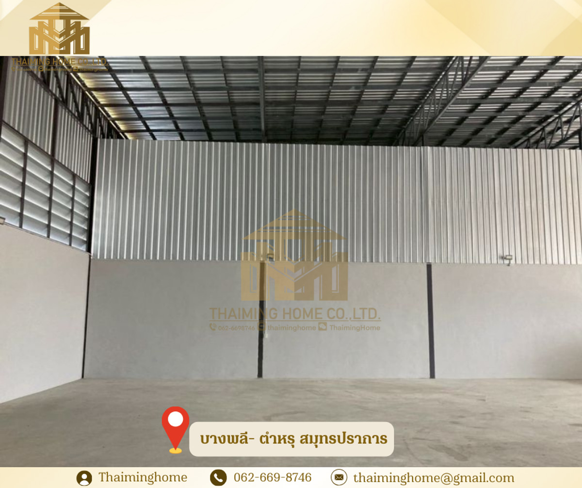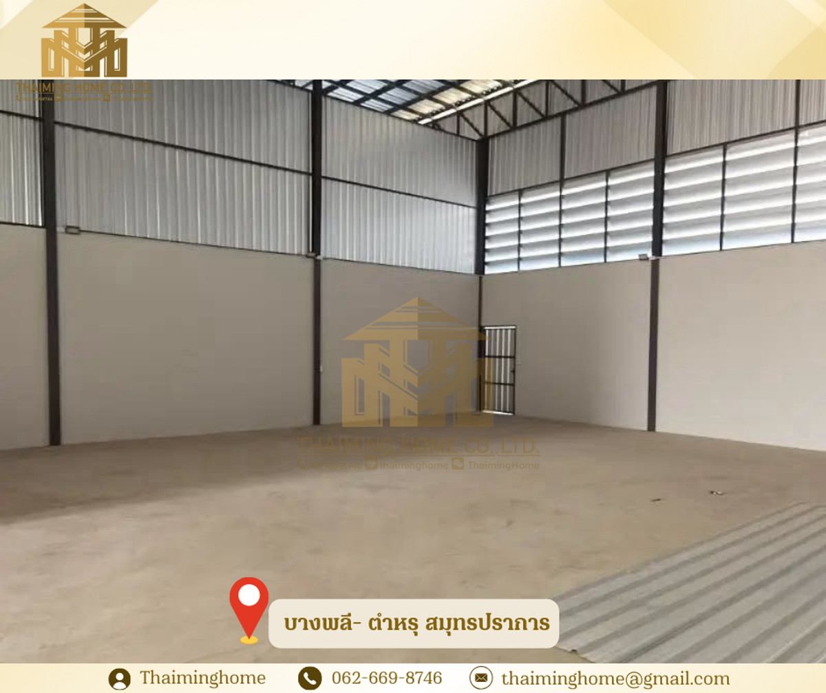 Warehouse for Rent, Bang Phli - Tamru, Samut Prakan (Property Code TW4-1041225) Details: - Area size: 500 sq.m. - Usable area: 405 sq.m. - Warehouse height: 8 m. - Load capacity: 2 tons/sq.m. - Adjacent to an 8m wide public road. - 3m wide area at the rear. - Warehouse size: 15m x 24m. - Office size: 5m x 9m, 2 floors. - 2 bathrooms. 3-phase electricity and running water available. - Electricity bill: Paid to the electricity authority. - Water bill: Paid to the warehouse owner. - Garbage fee: 400 baht per month. - Land and building tax: 1000 baht per month. Nearby Locations: - Near Lotus Bang Pu - Near Bang Pu Beach Resort - Near Bang Pu North Industrial Estate Rental Conditions: - 3-year contract - 2 months security deposit - 1 month advance payment - Rental price: 45,000 baht ---------------------------------------- บริษัท ไทยหมิง โฮม จำกัด Thaiming Home Co.,Ltd. 泰明房园 房产公司 ----------------------- Contact ติดต่อ : Contact number Contact : Contact number คุณหมิง(中文) Line ID: thaiminghome Line ID: @thaiminghome https://lin.ee/PkkHwYv Wechat : ThaimingHome E-mail : Contact email -----------------------