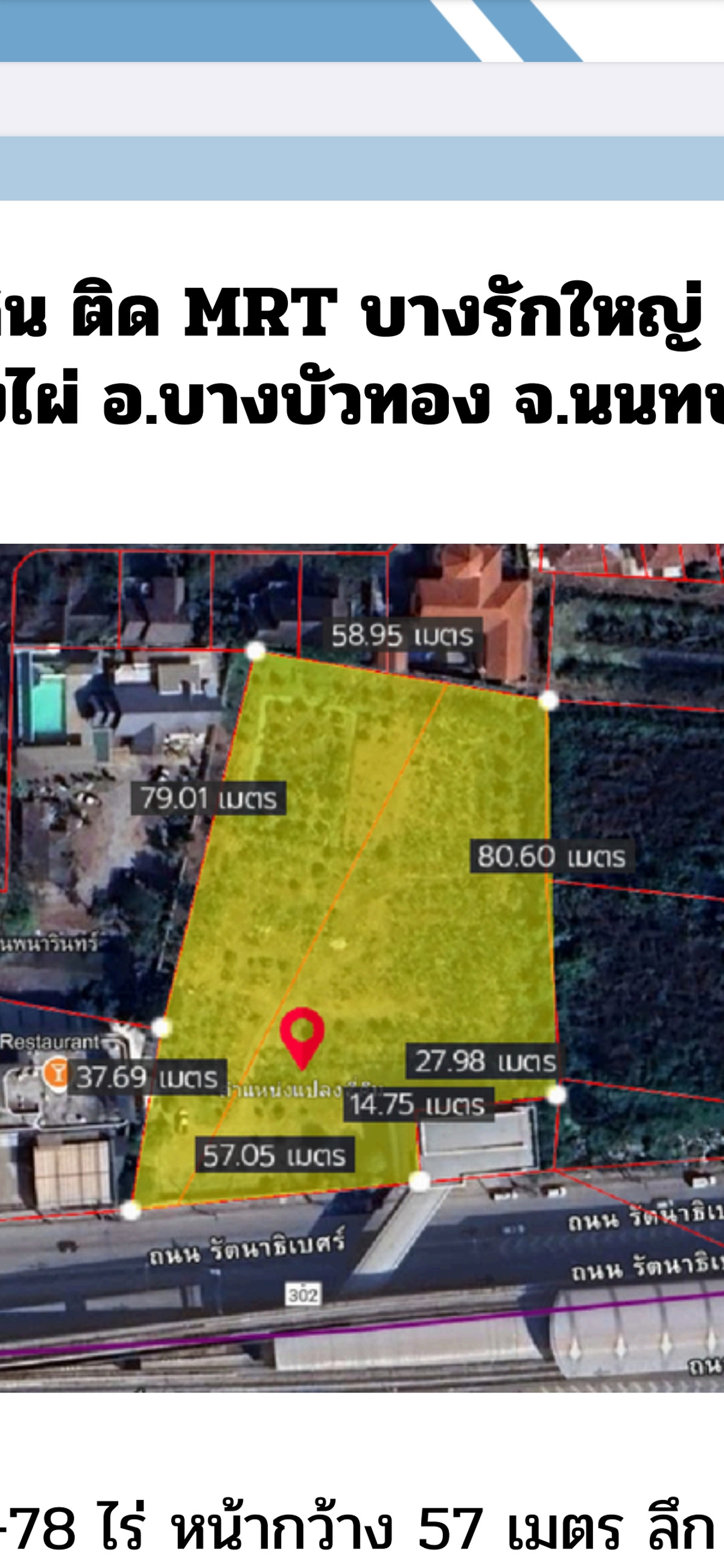 BKG 1017 ขายที่ดินติด MRT บางรักใหญ่ ขนาด 4-1-78 ไร่ ผังสีน้ำตาล (ชุมชนหนาแน่นมาก) ถนนรัตนาธิเบศร์ ต.บางไผ่ อ.บางบัวทอง นนทบุรี ที่ตั้ง ติดสถานี MRT บางรักใหญ่ ฝั่งเข้า กทม. ถนนรัตนาธิเบศร์ ต.บางไผ่ อ.บางบัวทอง จ.นนทบุรี รายละเอียด ที่ดิน 4-1-78 ไร่ -หน้ากว้าง 57 เมตร -ลึก 116 เมตร -ติด MRT บางรักใหญ่ เหมาะทำ -คอนโดมิเนียม -อาคารสำนักงาน -ศูนย์บริการรถยนต์ -โครงการบ้านจัดสรร -ศูนย์สุขภาพ Wellness center. สถานที่ใกล้เคียง -เซ็นทรัลเวสเกต -ตลาดแยกบางพลู นนทบุรี -รพ.เกษมราฏร์ รัตนาธิเบศร์ -วัดบางรักใหญ่ -หมู่บ้านวงชัย 9 ราคา 533,400,000 บาท (ค่าธรรมเนียมผู้ซื้อชำระค่าโอน) ติดต่อ หนิง. Contact number Prime Land for Sale – Next to MRT Bang Rak Yai Location: Rattanathibet Road, Bang Phai, Bang Bua Thong, Nonthaburi Directly adjacent to MRT Bang Rak Yai Station (Inbound to Bangkok) Land Size: 4-1-78 Rai (1,778 sq.wah) Brown Zone – High Density Area Width: 57 m | Depth: 116 m Key Highlights: Rare land plot next to MRT station Excellent frontage on Rattanathibet Road High development potential Suitable for large-scale projects Ideal for Development: Condominium Office building Mixed-use project Residential housing estate Wellness / Medical Center Nearby Amenities: Central WestGate Bang Yai Market Kasemrad Rattanathibet Hospital Established residential communities Price: THB 533,400,000 (Transfer fee paid by buyer) Contact: Ning 📞 Contact number 📍 Google Maps: 13.87720400, 100.44381624