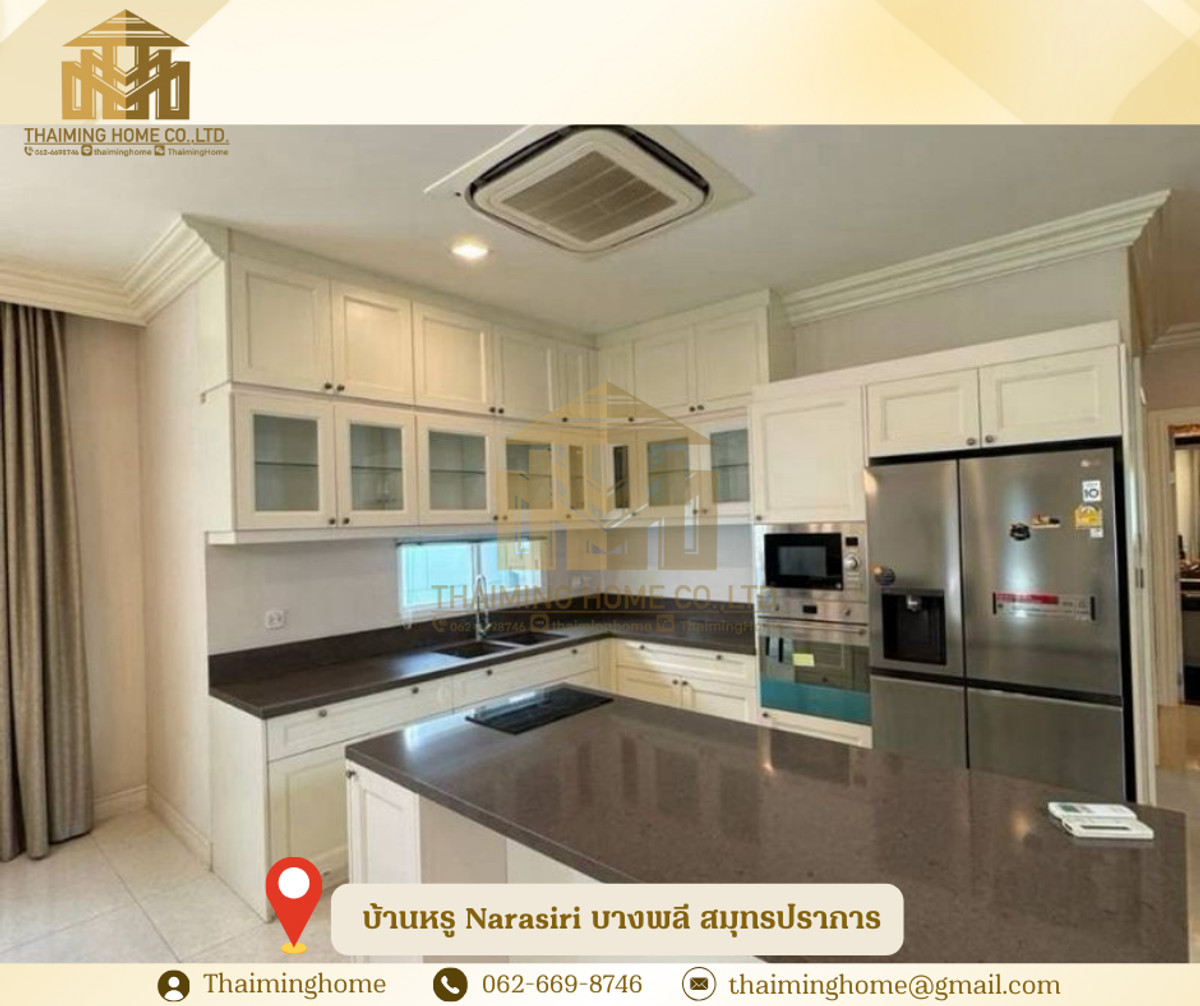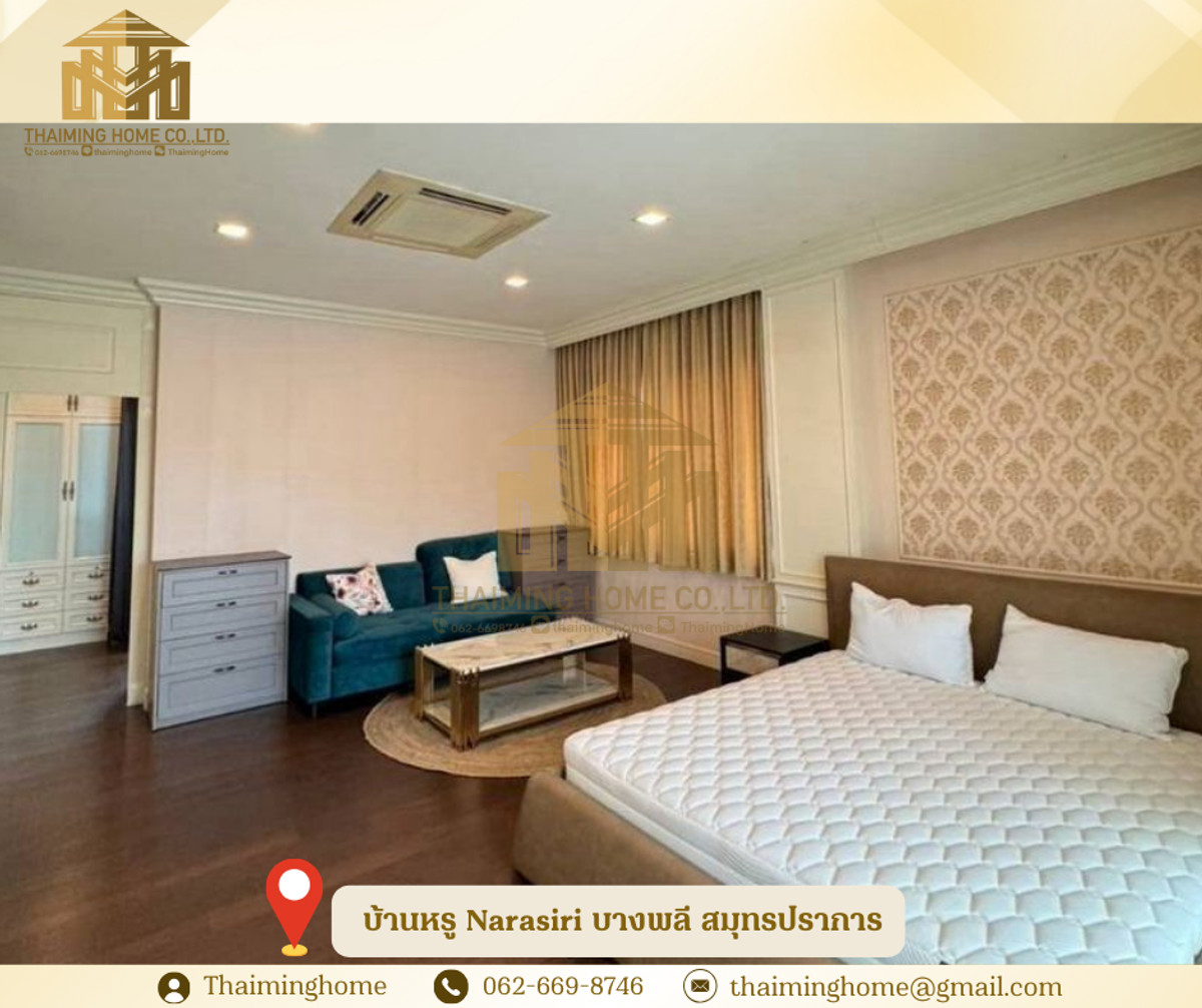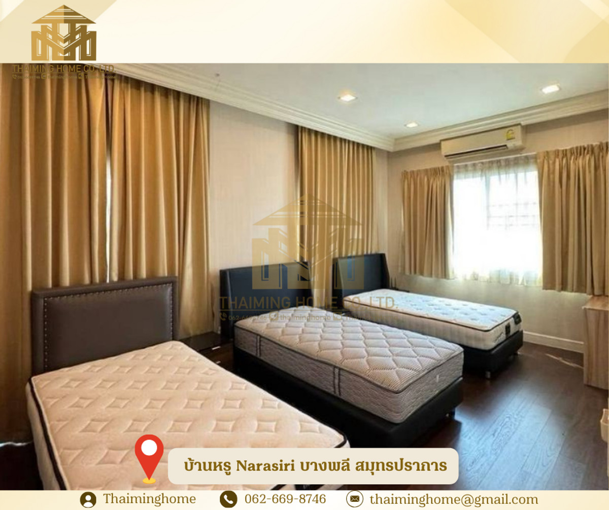 Luxury house for rent/sale, Narasiri Bang Phli, Samut Prakan (Property Code TH4-151225) Details - Land area: 124 sq.wah - Usable area: 375 sq.m - 4 bedrooms - 5 bathrooms - 1 living room - 1 family room - 1 dining room - 1 pantry - 1 Thai kitchen - 1 multipurpose room - 1 storage room - 1 maid's room - 4 parking spaces - South-facing house, fully built-in. - 1. Includes furniture - 2. Installed awnings for the carport and front and back of the house - 3. Tiled walkways around the house and tiled back yard - 4. Extended balcony outside the master bedroom - 5. Air conditioners - 6. The project installed 6 air conditioners, and the homeowner added 5 more, totaling 11 units: 1 in the wardrobe, 2 in the living room, 1 in the Thai kitchen, and 1 in the maid's room. - 6. Replaced the main front door with teak wood from Vision Glas. - 7. 65-inch TV, LG refrigerator with water dispenser, ice, and crushed ice. Nearby Locations Nearby Locations 1. Golf courses: Lake Wood, Windmill, Muang Kaew, Thana City, Green Valley, Thai Country Club 2. Shopping malls: Central Bangna, Mega Bangna, Market Village, Lotus, HomePro, Makro, Gourmet Market, and Foodland 3. Universities: Assumption University (ABAC), Verso International School, Thana City Country Club, Bangkok Patana International School, American School of Bangkok at Green Valley, Concordian International School 4. Kanchanaphisek Ring Road 5. Suvarnabhumi Airport 6. Sikarin Hospital, Sommutiwej Srinakarin Hospital Rental Conditions: - Minimum 1-year contract - 2-month security deposit - 1-month advance payment - Monthly rent: 250,000 THB - Sale price: 45 million THB (Transfer fees not included) --------------------------------- บริษัท ไทยหมิง โฮม จำกัด Thaiming Home Co.,Ltd. 泰明房园 房产公司 ----------------------- Contact ติดต่อ : Contact number Contact : Contact number คุณหมิง(中文) Line ID: thaiminghome Line ID: @thaiminghome https://lin.ee/PkkHwYv Wechat : ThaimingHome E-mail : Contact email -----------------------