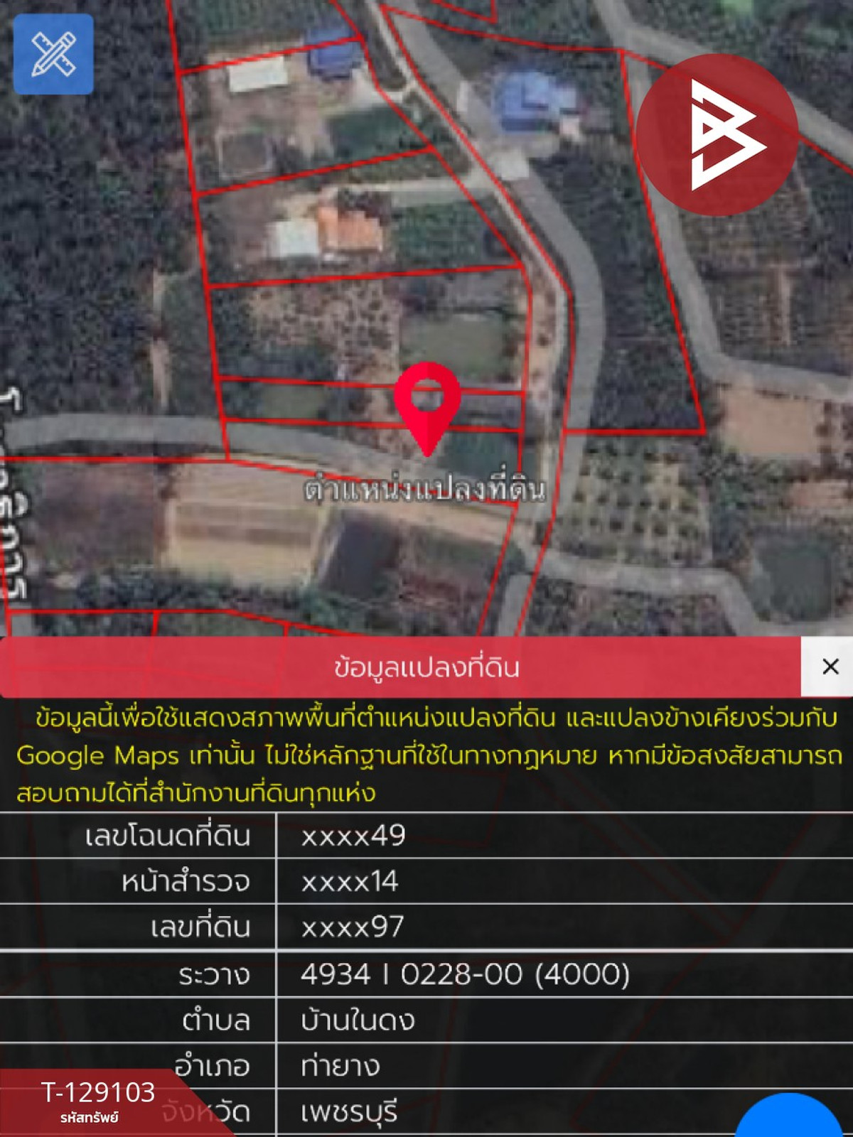 Land: Tha Yang, Phetchaburi Location: Ban Nai Dong Subdistrict, Tha Yang District, Phetchaburi Province Property code: T-129103 Type: Land Area: 1 rai 76.2 square wah Additional details: Suitable for investment. Build a house, resort, daily, monthly Price: 700,000 baht Map link: https://maps.google.com/?q=12.93227800,99.94898200 **We provide free loan arrangements. Ready to give advice Available from every bank** **with special interest rates and a maximum credit limit of 90-100% of the appraised value** If interested, ask for more information or make an appointment to see the house at Tel : Contact number Nok (agent code 7434) Line ID : nokchanok23 Callcenter : Contact number Interested in looking at other properties More than 3,000 items www.tb.co.th The Best Property Agent CO,.LTD. Leader in the brokerage business Full service real estate agent With professionalism, use of technology and creative innovation. To deliver the best service for you Providing services in buying, selling, and renting real estate.