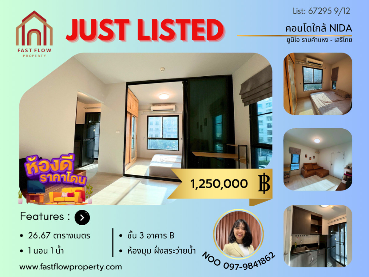 Bargain! Corner unit, 3rd floor, 26.67 sq m, pool view, Building B, Unio Serithai Ramkhamhaeng Condo. Fully furnished, ready to move in. 1 bedroom, Serithai Road, near NIDA and the Orange Line MRT, Sriburapha Station. NOO Interested, please contact: Phatnarin Kittichochaisiri (Nong Noo) Fast Flow Property Tel: Contact number Line id: Phatnarin 28 Listing no: 67295 Room Detail: - Condo for sale, Unio Ramkhamhaeng-Serithai project - Located in Building B, 3rd floor, corner unit - Balcony facing the swimming pool and landscaped gardens within the project. - Usable area 26.67 square meters - 1 bedroom, 1 bathroom - Separate kitchen area - 1 parking space - 1 air conditioner, 1 water heater - Room in good condition, beautiful, ready to move in - Sold with some furniture Project and Facilities: - Developed by Helix Co., Ltd., a subsidiary of Ananda Development Public Company Limited. - Swimming pool / Fitness center / Playground / Co-Working Space / Convenience store - Common area fee 45 baht per square meter per month - CCTV and 24-hour security - Key card access to each floor in the elevator Nearby Places: - Prime location Ramkhamhaeng–Seri Thai–Bang Kapi - Close to the motorway And the Outer Ring Road Expressway - The Paseo Town Ramkhamhaeng, The Mall Lifestyle Bangkapi - Bangkapi Market - ​​National Institute of Development Administration (NIDA), Bangkapi School, Prommitr Pittaya School, Interkids Serithai School - Kasemrad Ramkhamhaeng Hospital, Ramkhamhaeng Hospital Location: https://maps.app.goo.gl/ZSnpQ1744ZhNUoXD7 Price: 1,250,000 THB Free bank loan assistance service! Viewing available daily. Price negotiable. Contact: Ms. Pattarin Kittichok Chaiyasiri (Nong Nu) Tel: Contact number Line ID: Phatnarin28 Contact Fast Flow Property Office Tel: Contact number Line ID: @fastflow FB page: facebook.com/fastflowproperty www.fastflowproperty.com Real estate sales and rental services for all types of properties. Free advertising.