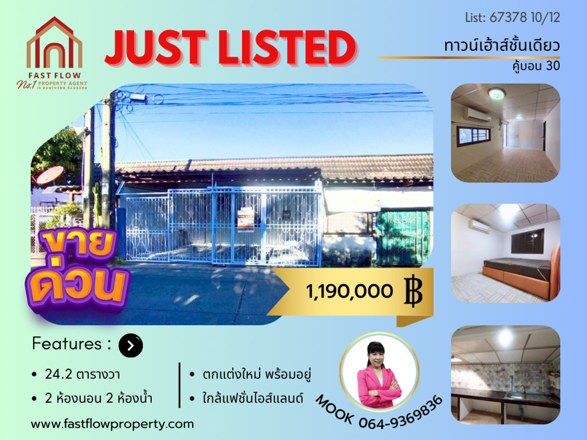 Bargain! Townhouse for sale, Ramintra, Khu Bon, Poon Village Community, Soi Khu Bon 30. Newly renovated, extended kitchen, parking space. Townhome near Fashion Island and Kanchanaphisek Road. MKD Interested, please contact Mukda, Fast Flow Property Contact number Line id: mukda9369 Listing no: 67378 Property Detail: - For sale: Single-story townhouse in Poon Village Community, Soi Khu Bon 30 (near the intersection of Kanchanaphisek Road and Khu Bon Road) - The house is at the end of the soi, quiet and private. - Land area: 24.2 square wa - Usable area: - Total area including garage and kitchen is approximately 96 square meters. - Unfurnished house, simple decoration. - Facing southwest. - 2 bedrooms, 2 bathrooms. - Extended Thai kitchen at the back of the house, full area, with a good quality concrete kitchen counter. - Extended garage, covering parking for 2 cars. - Tiled floors throughout the house. - Selling with 2 air conditioners and a 6-foot bed. Nearby locations: - BTS Pink Line (Khu Bon Station) - Kanchanaphisek Expressway (Eastern Ring Road) and Hathairat Road - Chokchai Nimitmai School, Nawaminthrachuthit School, College of Tourism - Near Safari World, Legacy Golf Course, Fo Guang Xun Temple (Guan Yin Temple) - Sinpattaya Ramintra Hospital, Intrarak Hospital, Phayathai Nawamin Hospital - Fashion Island, The Promenade, Big C Hathairat, The Jazz Khubon Location: Soi Khubon 30, Bang Chan Subdistrict, Khlong San Wa District, Bangkok https://maps.app.goo.gl/MMbX3Zc97sAQW58g7 Price: 1,190,000 Baht Free bank loan assistance service! Viewing available daily. Interested? Price is negotiable. Contact: Ms. Sirilak (Mukda) Contact number Line ID: mukda9369 Contact Fast Flow Property Office Tel: Contact number Line ID: @fastflow FB page: facebook.com/fastflowproperty www.fastflowproperty.com We offer property sales services for all types of real estate. Free advertising.