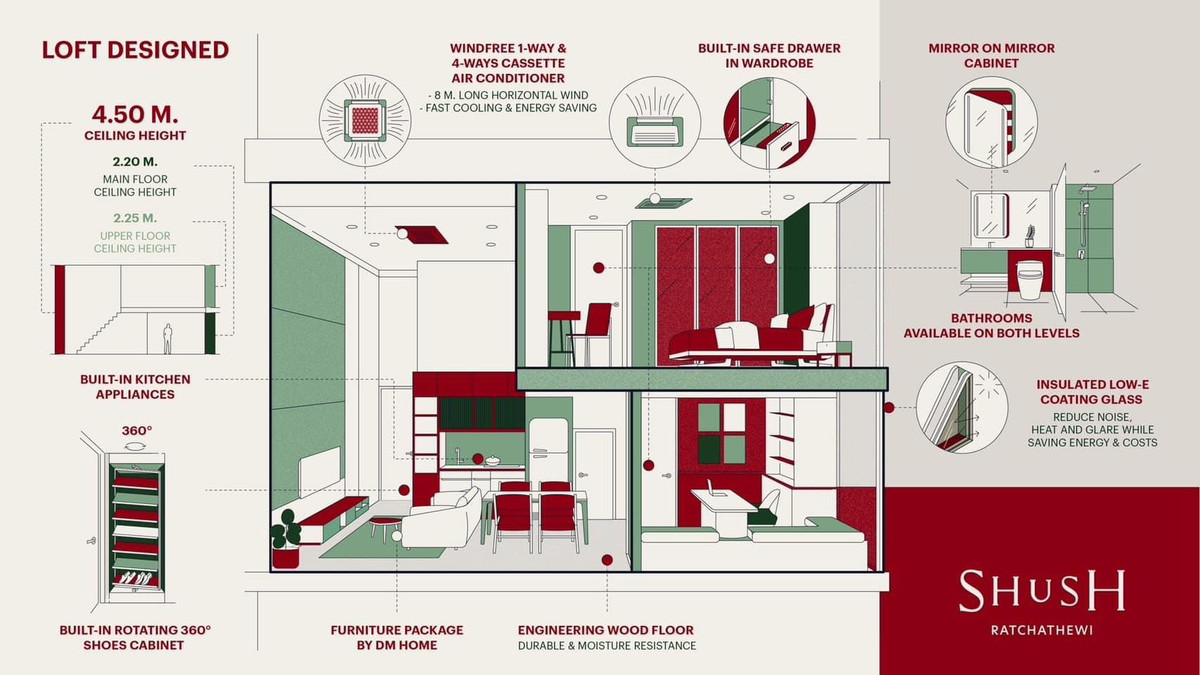 Modern Loft Residence in Ratchathewi – Compact Luxury in the Heart of Bangkok Property Code: ELITENA25073 Features SHUSH Ratchathewi offers contemporary loft-style living with a total usable area of 4