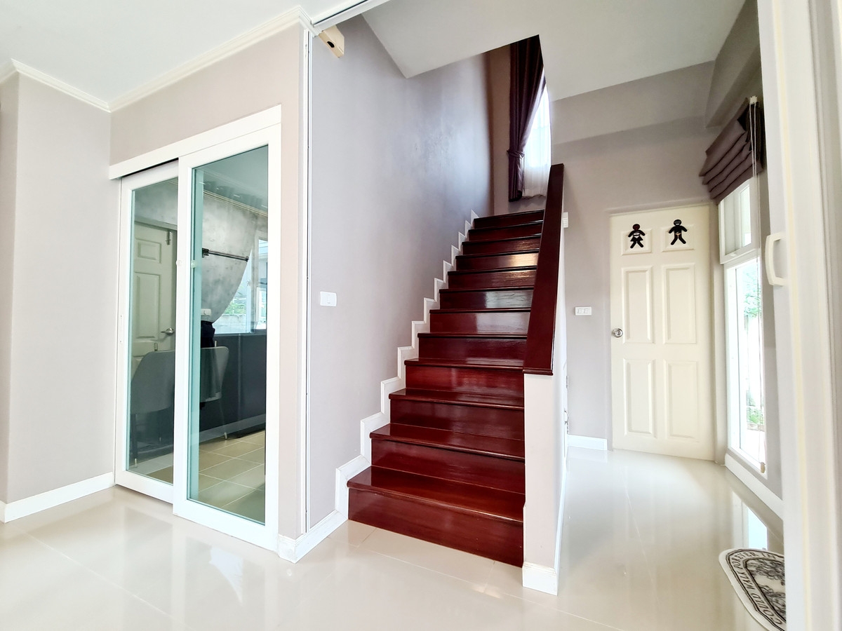 3 ห้องนอน 3 ห้องน้ำ 1 ห้องครัวห้องและ 1ห้อง รับแขก โครงการที่ติดบนถนนร่มเกล้า จอดรถได้ 2 คัน ภายในโครงการ – สโมสร – สระว่ายน้ำขนาดใหญ่ – ห้องอาบน้ำชาย-หญิง – ห้องฟิตเนส – สวนสาธารณะ สนามเด็กเล่น – รักษาความปลอดภัย 24 ชม แถม ผ้าม่านกัน ยูวี 100% ทั้งหลัง เครื่องทำน้ำอุ่น 2 ห้องในห้องน้ำชั้นบน ครัว Built-in จาก Index Living Mall Walk-in closet Built-in จาก Index Living Mall หลอดไฟเปลี่ยนเป็นใช้แบบ led ทั้งหลัง พร้อมโคมกลมแบบวินเทจ (เดิมโครงการให้เป็นหลอดนีออนกับโคมกลมพลาสติก) * วัสดุก่อสร้าง กรอบประตูหน้าต่าง UPVC ผนังก่ออิฐมวลเบา ไม่อมความร้อน ฉนวนกันความร้อน หนา 3 นิ้ว ใต้ฝ้าเพดาน ระแนงระบายอากาศใต้หลังคา กระจกเขียวตัดแสง ก๊อกน้ำและโถสุขภัณฑ์รุ่นประหยัดน้ำ * ที่ดิน: 51 ตร.ว. * พื้นที่ใช้สอย: 157 ตร.ม. * สิ่งอำนวยความสะดวก: สระว่ายน้ำ, Fitness, สวนสาธารณะ, ระบบรักษาความปลอดภัย 24 ชม. * สถานที่ใกล้เคียง: ม.เกษมบัณฑิต ร่มเกล้า, บิ๊กซี ร่มเกล้า, รร.สารสาสน์วิเทศร่มเกล้า, โรงเรียนเตรียมศึกษาพัฒนาการ สุวรรณภูมิ, ตลาดมีนบุรี, บิ๊กซี สุขาภิบาล 3, โลตัส สุขาภิบาล 3 * การเดินทาง: จาก ถ.อ่อนนุช-ลาดกระบัง : เลี้ยวซ้ายเข้า ถ.ร่มเกล้า ตรงไปประมาณ 7 กม. โครงการอยู่ซ้ายมือ จาก ถ.มอเตอร์เวย์ : ออกทาง ถ.ร่มเกล้า เจอสามแยกติด ถ.ร่มเกล้า เลี้ยวซ้าย ตรงไปผ่านแยกเคหะร่มเกล้า ตรงไปประมาณ 1.4 กม. โครงการอยู่ซ้ายมือ จาก ถ.รามคำแหง (สุขาภิบาล 3) : เลี้ยวแยกขวาแยกสุขาภิบาล 3 ตัดร่มเกล้า เข้า ถ.ร่มเกล้า มาประมาณ 3 กม. โครงการอยู่ขวามือ ต้องไปกลับรถที่แยกการเคหะร่มเกล้า * รถไฟฟ้า Airport Link สถานีลาดกระบัง BTS สายสีชมพู สถานีมีนบุรี MRT (อยู่ระหว่างการก่อสร้าง) สายสีส้มตะวันออก สถานีมีนบุรี (อยู่ระหว่างการก่อสร้าง) ** แวดล้อมด้วยสิ่งอำนวยความสะดวยครบครัน อาทิ คาร์ฟูร์, บิ๊กซี, โลตัส, รพ.เกษมราษฎร์ รามคำแหง, ร.ร.เทพศิรินทร์ ร่มเกล้า และ ร.ร.นานาชาติร่วมฤดีวิเทศศึกษา (RIS), และม.เกษมบัณฑิต – มหาวิทยาลัยเกษมบัญฑิต วิทยาเขตร่มเกล้า 2.1 กม. – บิ๊กซี ร่มเกล้า 2.7 กม. – โรงเรียนสารสาสน์วิเทศร่มเกล้า 4.2 กม. – ตลาดมีนบุรี 4.2 กม. – บิ๊กซี สุขาภิบาล 3 4.2 กม. – โลตัส สุขาภิบาล 3 4.2 กม. – โลตัส มันบุรี 4.5 กม. รายละเอียดเพิ่มเติม : เวลาเดินทาง สนามบินนานาชาติสุวรรณภูมิ 15 นาที สถานีรถไฟฟ้า BTS มีนบุรี 9 นาที มหาวิทยาลัยเกษมบัณฑิต(ร่มเกล้า) 6 นาที รร.เตรียมอุมศึกษาพัฒนาการสุวรรณภูมิ 10 นาที รร.เตรียมอุดมฯน้อมเกล้า 17 นาที โรงพยาบาลนวมินทร์9 14 นาที Lotus สุขาภิบาล 3 14 นาที Big C สุขาภิบาล 3 14 นาที ตลาดสดมีนบุรี 18 นาที