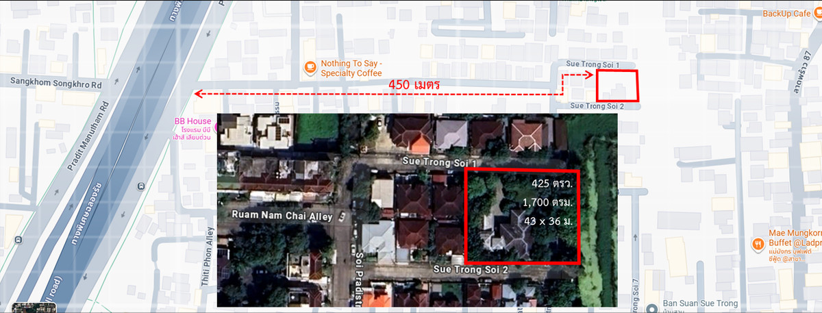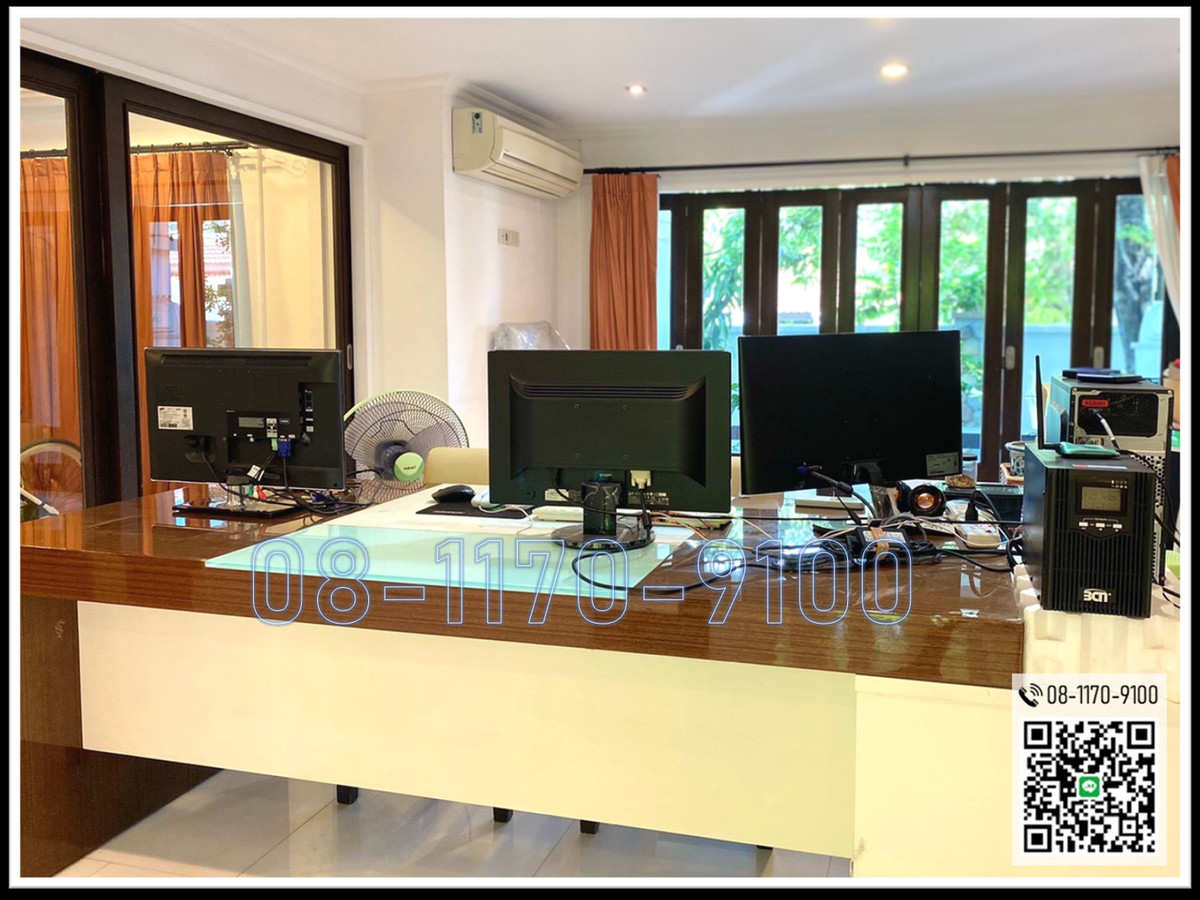 House for sale with land, Soi Praditmanutham 10 (Lat Phrao 87), 450 meters from the main road , area 1 rai 25 square wah (425 square wah / 1,700 square meters), width 43 meters, depth 36 meters , large house, 2 floors, 4 bedrooms, 6 bathrooms, living room, office room, Thai kitchen, western kitchen, maids room, 3-car garage, guardhouse. Total usable area 460 square meters, large garden area approximately 1,000 square meters Location 302/888 Ban Suan Suetrong Soi 1, Khlong Chao Khun Sing Subdistrict. Wang Thonglang District Bangkok coordinates 13.794943, 100.617067 is a potential location in the northeast of Bangkok. It is an urban area extending from Ekkamai, Rama 9, and Lat Phrao. There are department stores. and many community malls. There are many leading international schools and schools. Convenient travel Near Chalong Rat Expressway Yellow Line with a location in a community that is not crowded. Not far from the main road But surrounded by the nature of small and large trees in the area. Therefore it is suitable as a residence. or a small office Especially Nearby places 450 meters Pradit Manutham Road 500 meters HomePro Ekkamai Ramintra 650 meters Lotus Ramintra 800 meters Central Eastville Selling price 48.9 million baht If interested, contact to inquire or make an appointment to see the place Khun Kulnuch Wongmasa Contact number Line ID: kwflavia