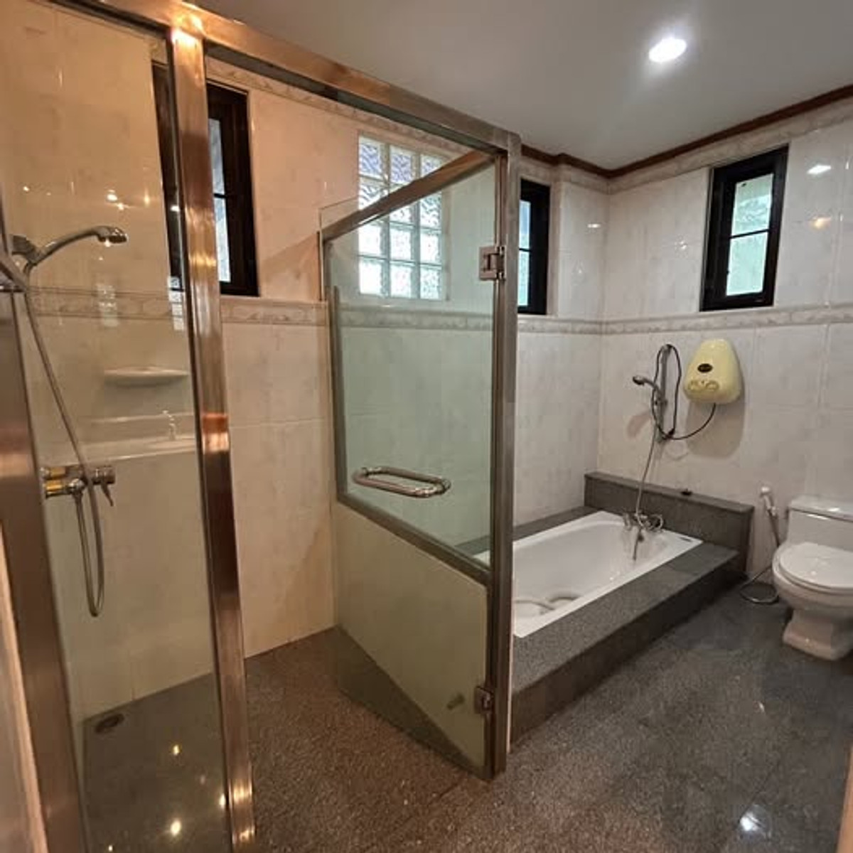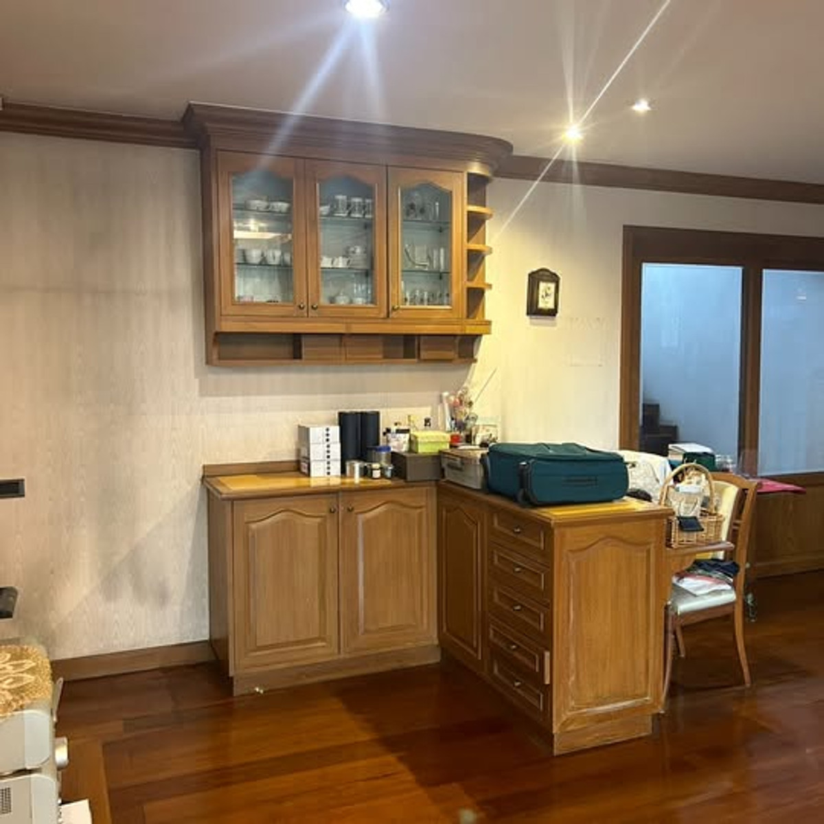 2-story detached house next to Sima Thani Hotel Built-in furniture throughout the house Teak wood floor + marble Details - 2-story house, usable area approximately 450 sq m, land 213 sq m - 3 bedrooms