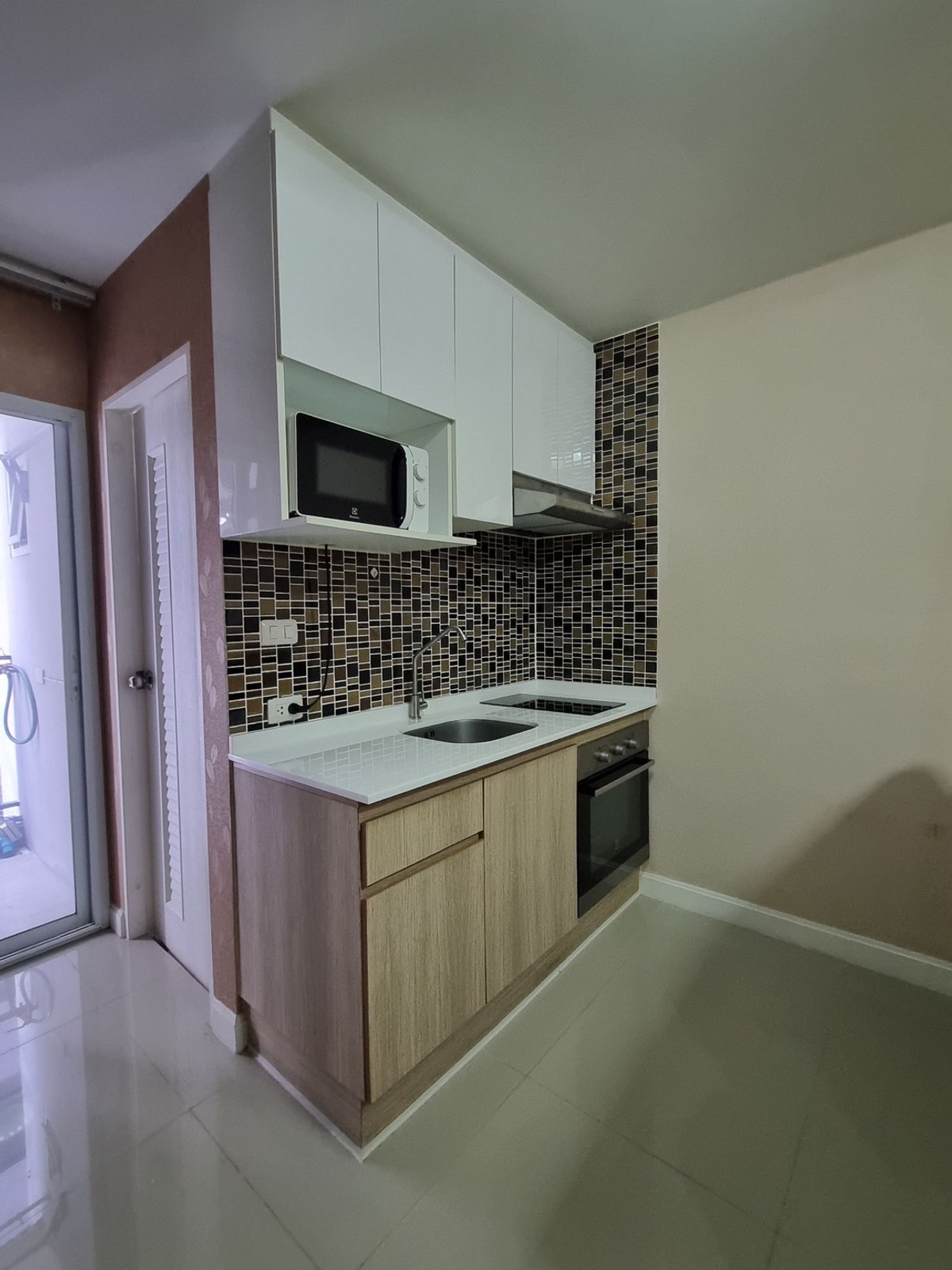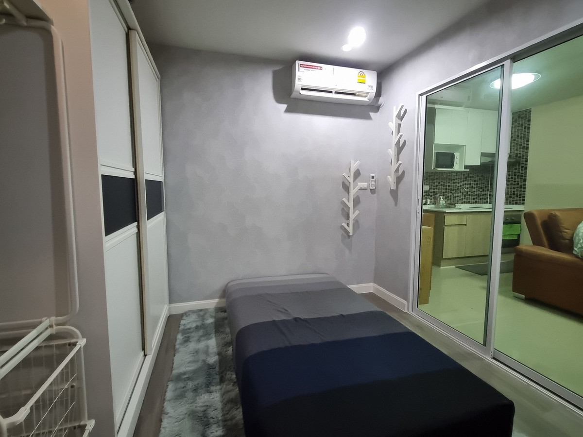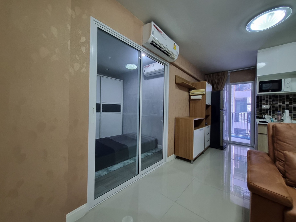 Pruksa Thani Fifth Condotel Condo Building B, 4th floor, room size 29.58 sq m Studio room / 1 bathroom / 1 living room / 1 balcony / free parking for 1 car and pets allowed Free furniture 1. 3.5 foot mattress 2. 1.6 meter wardrobe / clothes rack / clothes hanging shelf 3. Shelf With mirror 4. TV shelf, mezzanine and shelves 5. Sofa bed 6. Refrigerator 7. Water heater 8. Microwave 9. Built-in kitchen counter set (electric stove / range hood / electric oven) 10. 2 air conditioners (9,000 BTU / 12,000 BTU) Nearby important places include 1. Tesco Lotus 2. Paradise Park 3. Seacon Square 4. BTS Sri Nuch (approximately 3.1 km. - 6 minutes) Facilities - Fitness - CCTV camera - Entry-exit with Key Card system - Standard fire protection system - 24 hour security system - 1 passenger elevator (supports weight 550 kg) (The project has 2 buildings: 8 floors) Number of rooms 158 units