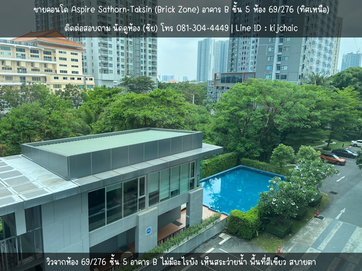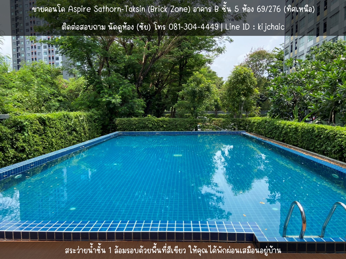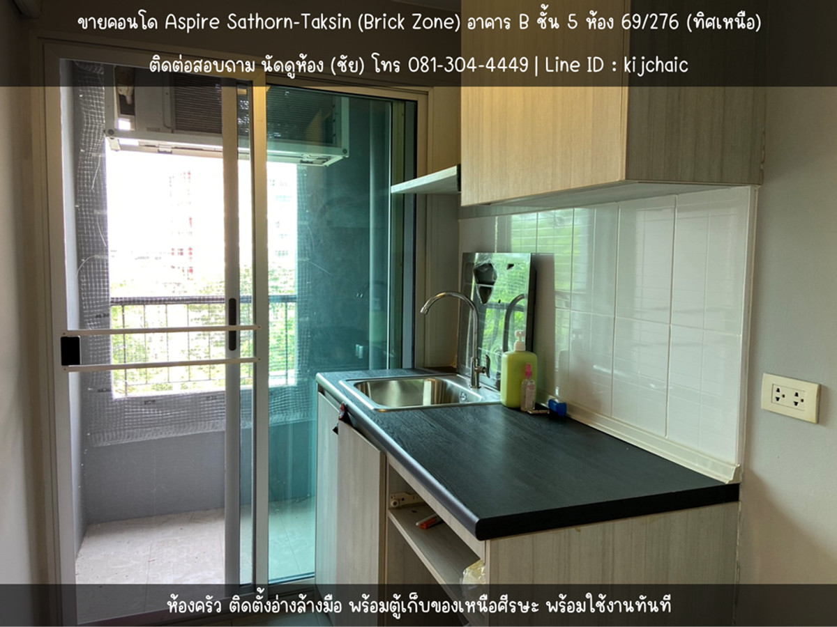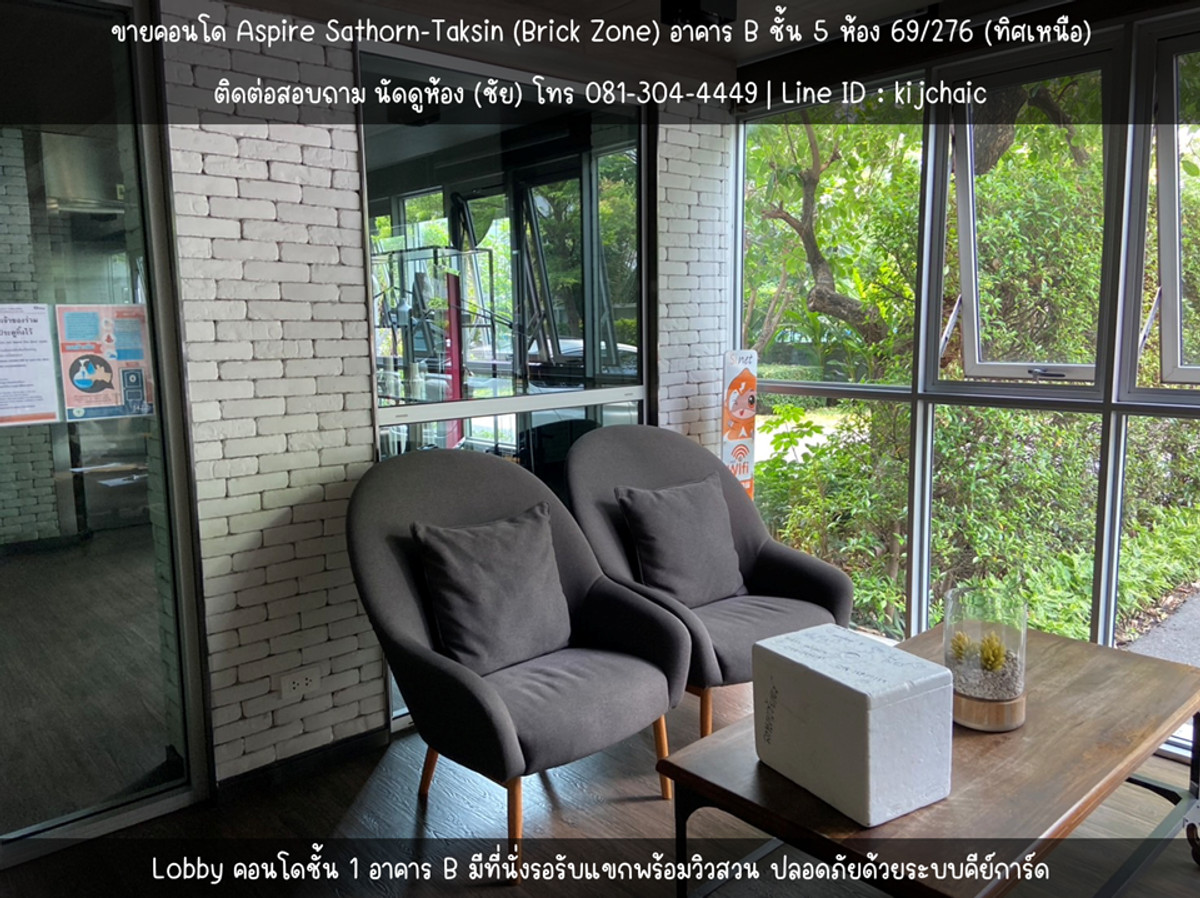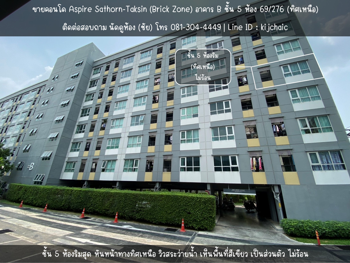 ขายคอนโดแอสปาย สาทร-ตากสิน (บริคโซน) คอนโด 8 ชั้น สงบ ร่มรืน ข้อมูลห้องคอนโด • ห้องสตูดิโอ ขนาด 28 ตารางเมตร • ห้องใหม่ สภาพสวย ไม่เคยปล่อยเช่า • ห้องเปล่า ตกแต่งได้ตามใจชอบ (ไม่ต้องรื้อใหม่) • ชั้น 5 หันหน้าทางทิศเหนือ (ไม่ร้อน) • วิวจากห้องไม่ถูกบล็อค ได้วิวสีเขียว และสระว่ายน้ำ เฟอร์นิเจอร์ภายในห้อง • ผ้าม่าน 2 ชั้น ติดตั้งเต็มความสูง • มุ้งลวดห้องนอน • มุ้งลวดห้องครัว • แอร์ Samsung 18,000 btu • อ่างล้างจานในห้องครัวพร้อมใช้ • ชั้นเก็บของในห้องครัว • กระจกนิรภัย กั้นส่วนเปียกในห้องน้ำ • เครื่องทำน้ำอุ่น Stiebel Eltron การเดินทาง • ใกล้รถไฟฟ้า BTS สถานีวุฒากาศ • มีที่จอดรถทั้งภายในและภายนอกอาคารถึง 40% สิ่งอำนวยความสะดวกโครงการ • ห้องออกกำลังกาย • ล็อบบี้แยกแต่ละอาคาร • สระว่ายน้ำระบบเกลือ • สวนสีเขียวล้อมรอบโครงการ • ร้านสะดวกซื้อ และร้านอาหารหน้าทางเข้าโครงการ • ระบบ Key Card ขึ้นลิฟท์ • ระบบ Key Card เข้าโครงการ • มี รปภ. ดูแลความปลอดภัย 24 ชั่วโมง ค่าใช้จ่ายการโอนของผู้ซื้อ • ค่าธรรมเนียมการโอน (ผู้ซื้อออก 1% และ ผู้ขายออก 1% • ค่าจดจำนอง ข้อมูลติดต่อ • โทร. Contact number (คุณชัย) • LINE : kijchaic หรือ เบอร์ Contact number