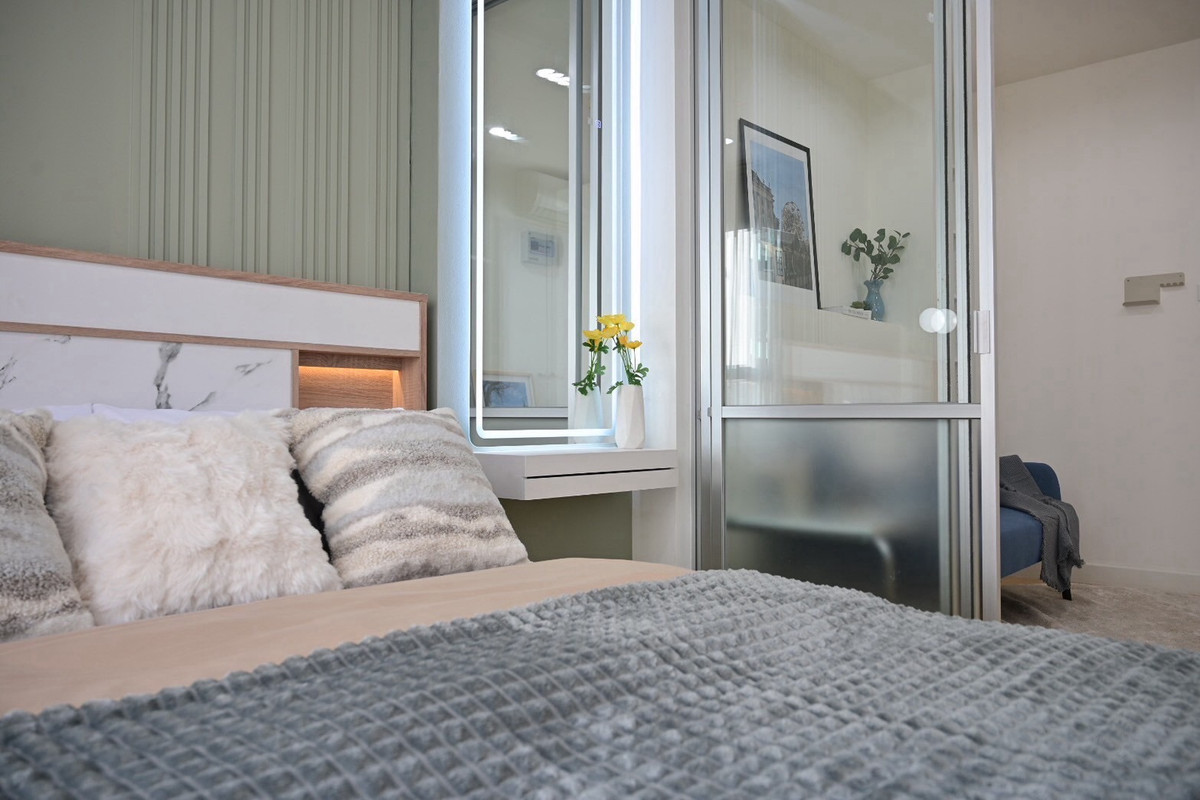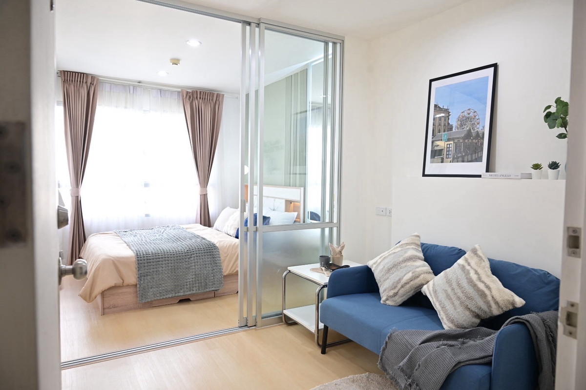 Lumpini On Nut 46 room, size 26 sq m. Price 1.45 million baht 🟢Size 26 sq m 🟢5th floor 🟢1 bedroom, 1 bathroom, 1 living room with kitchen counter zone 🟢 Air conditioner, yen cabinet, bed, wardrobe, dr