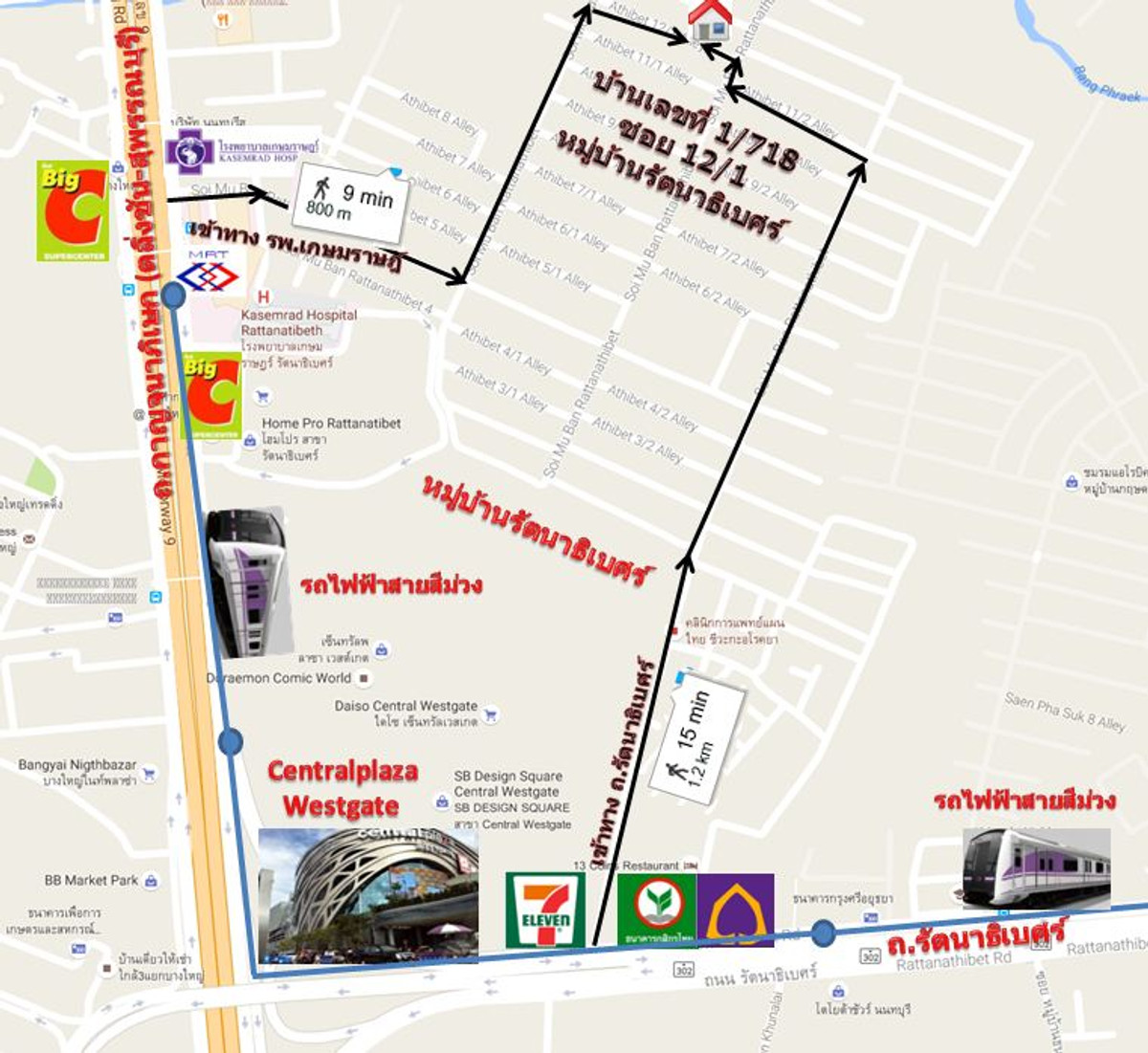 2-story townhouse for rent, Rattanathibet Village. Behind Central Westgate #Rattanathibet Village Soi 12/1 No. 1/718 Coordinates https://maps.app.goo.gl/nP2QYpDtADgwv3Kq8 Upstairs there are 2 bedrooms, 1 air conditioner, 1 bathroom downstairs. Separate the ground floor room. The kitchen has been extended. Garage can park 1 car Nearby places next to it. Central Westgate Purple Line MRT Station Get off at Bang Yai Market Station, Entrance and Exit 3 Rattanathibet Village, convenient travel, can enter and exit in 2 ways. Bang Yai, Rattanathibet Road Minimum 1 year rental contract No pets Price 7,000 baht/month Deposit 14,000 baht, pay 21,000, ready to move in Tel./LIne: Contact number