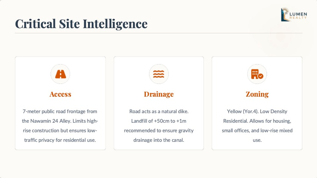 Headline: Build your dream waterfront home or creative studio in the heart of Bueng Kum. A rare opportunity to own a riverside plot at below-market prices! Description: Discover this hidden gem located in the serene Nawamin area. This 208 Sq. Wah plot (2 title deeds) offers a unique waterfront lifestyle next to the Khlong Lam Phang Phuai. With a 4-meter public road acting as a buffer between the land and the water, you enjoy permanent unblocked views, excellent wind flow, and natural privacy without the hassle of direct bank erosion. Why this land? • Unbeatable Price: At just 49,000 THB per Sq. Wah (Total 10,192,000 THB), this is significantly lower than the zone average of 60k-80k. • Riverside Lifestyle: Enjoy the cool breeze and open space. The road frontage acts as a natural dike, protecting the land from overflow (Owner states "No Flood"). • Privacy: No direct neighbors on the water side; perfect for a private luxury residence, a glass-house studio, or a boutique event venue. • Future Potential: Located near the path of the future MRT Brown Line, ensuring excellent capital appreciation. • Connectivity: Easy access to Nawamin Road, connecting you to The Mall Bangkapi, Fashion Island, and international schools. Property Details: • Size: 208 Sq. Wah • Dimensions: Approx. rectangular shape • Zoning: Yellow (Low Density Residential) • Access: 7-meter wide public road Asking Price: 10,192,000 THB (Transfer fees 50/50) Contact for Viewing: Pang Call/WhatsApp: Contact number Line ID: pangproperties