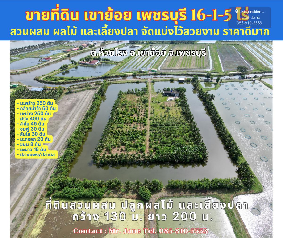 Land for sale, beautiful square shape, mixed fruit orchard and fish farming, very good view, Huai Rong Subdistrict, Khao Yoi District, Phetchaburi, 16-1-5 rai, very good price, selling for only 390,000 baht per rai (or 975 baht per square wa). Total selling price 6,342,375 baht, very cheap. . Land location: https://maps.app.goo.gl/GXBGMPyGpCMnifHr6 . ***The land is an orchard of various types of fruit. and raising sea bass and tilapia including - 250 coconut trees - 50 Namwa banana trees - 250 mango trees - 400 guava trees - 45 longan trees - 30 rose apple trees - 30 pomelo trees - 20 olive trees - 8 jackfruit trees - 15 lemon trees - There are fish in the pond. Sea bass/tilapia Natural release type . If interested, contact me, Jane, a real estate agent, call Contact number