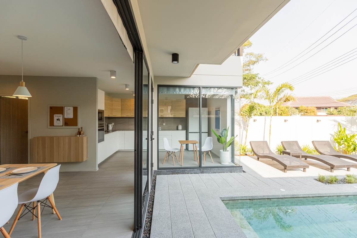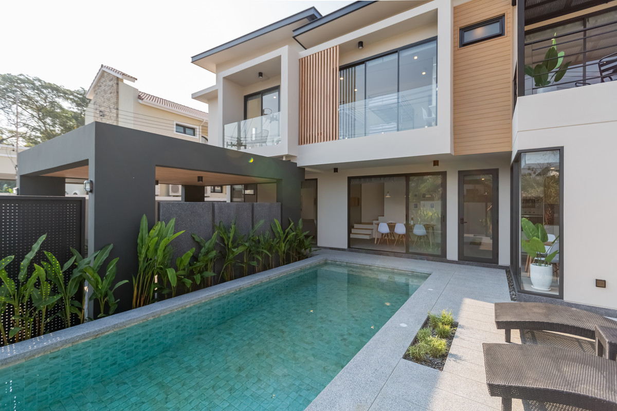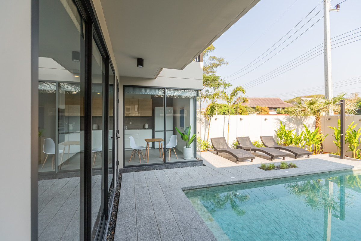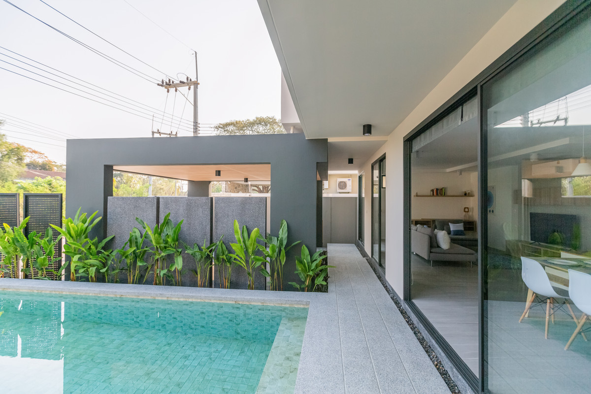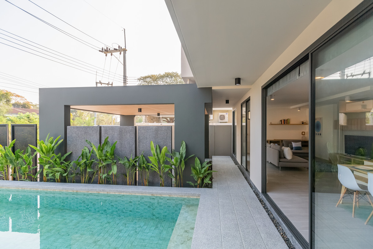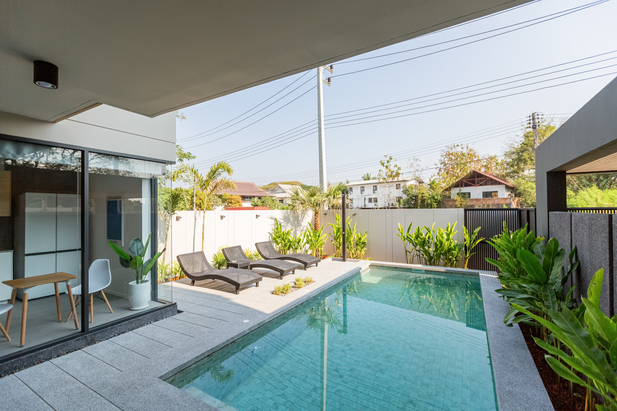 This contemporary 220-square-meter residence in Hang Dong features a functional open-plan layout comprising three bedrooms, three bathrooms, and a integrated lounge and dining area. The architectural design prioritizes modern utility, incorporating a fully equipped kitchen, a dedicated laundry room, under-stair storage, and an additional external storeroom. High-end climate control is maintained through air conditioning throughout all interior spaces, while the master bathroom includes a full-sized bathtub. The exterior grounds consist of professionally landscaped gardens and a private saltwater swimming pool, with covered parking provided for two vehicles. This property allows for pet ownership, including dogs, and the rental rate includes internet connectivity, regular pool servicing, and professional garden maintenance. Located in a quiet residential enclave directly behind Kad Farang Village, the home is a two-minute walk from Rimping Supermarket and the Premium Outlet mall. Its proximity to major educational institutions makes it highly practical for international families, situated within ten minutes of Lanna International School, SBS, Panyaden, Meritton International British School, and Grace International School. This location offers immediate access to private healthcare and shopping facilities while maintaining a peaceful environment away from main road nois