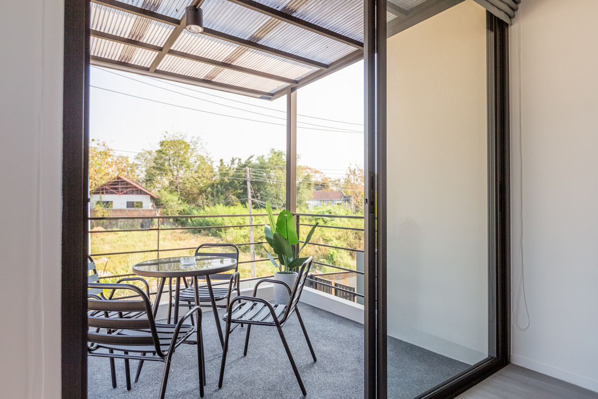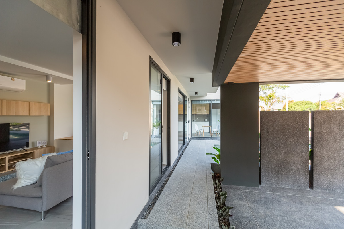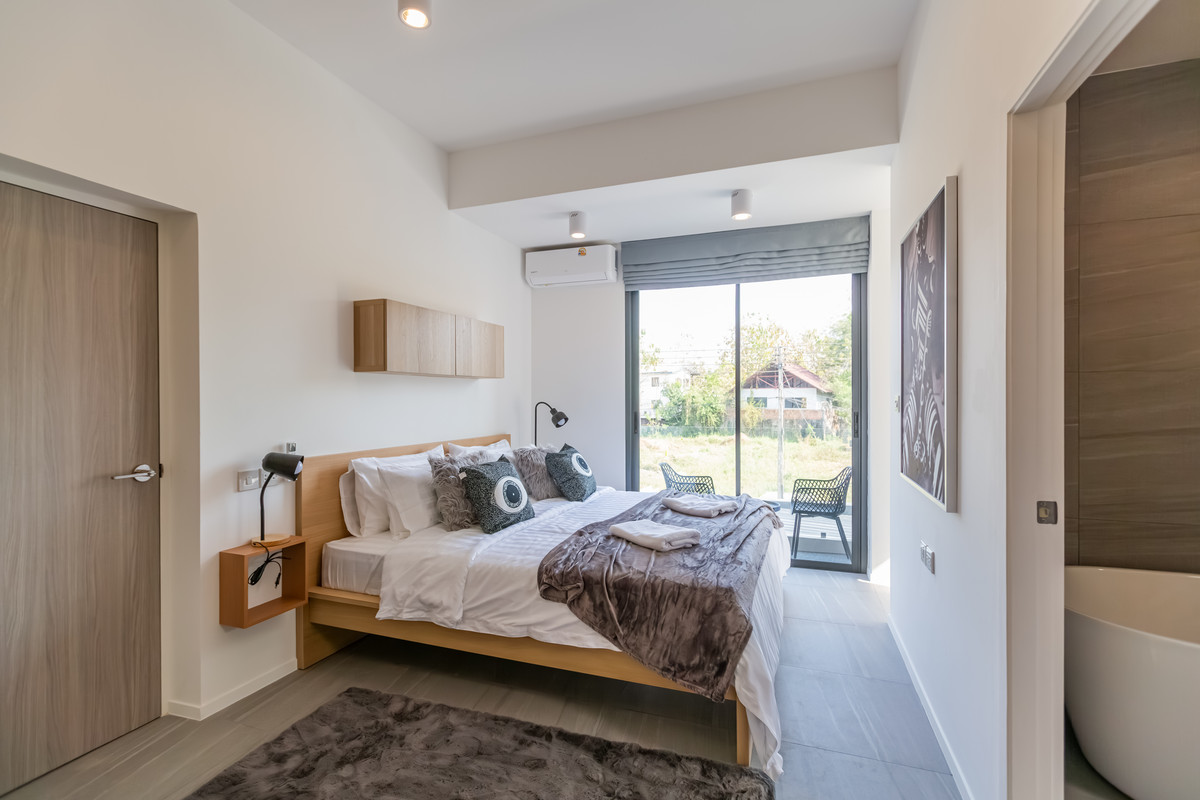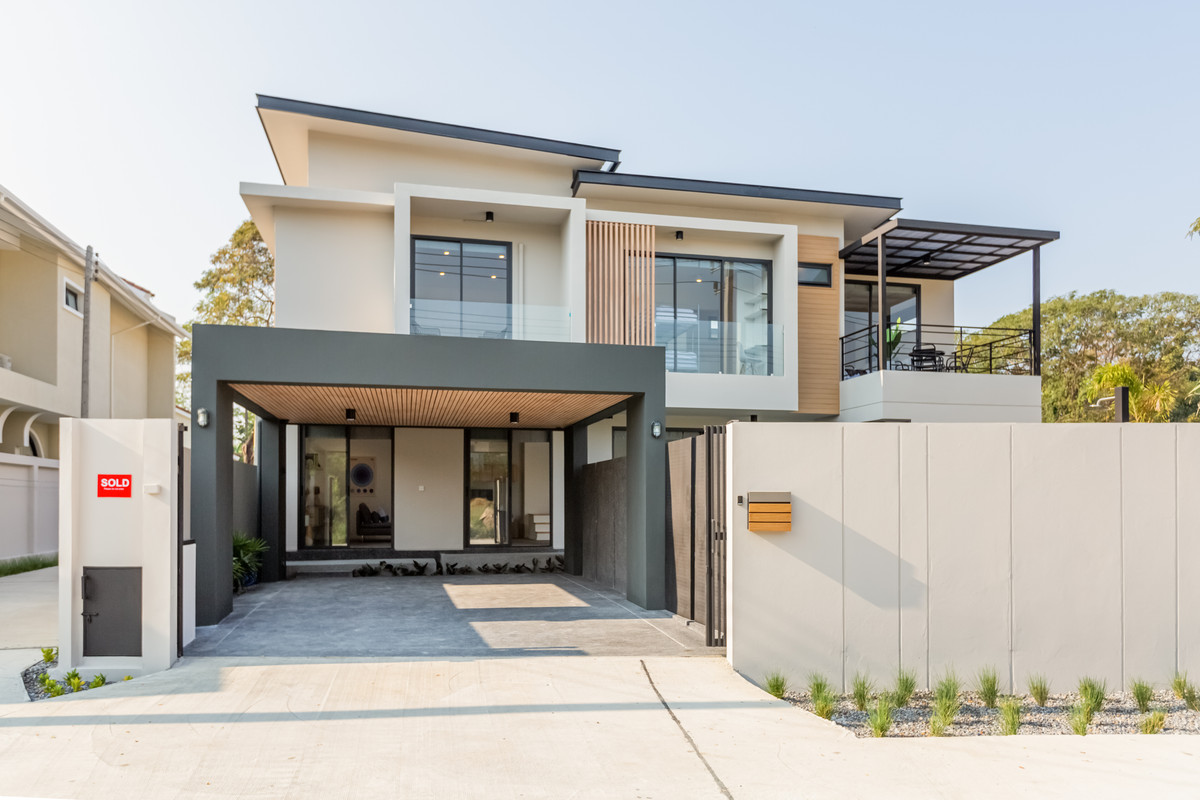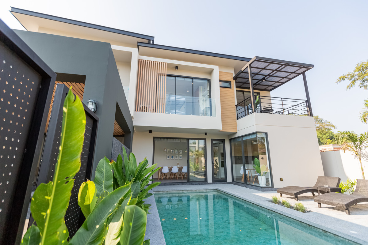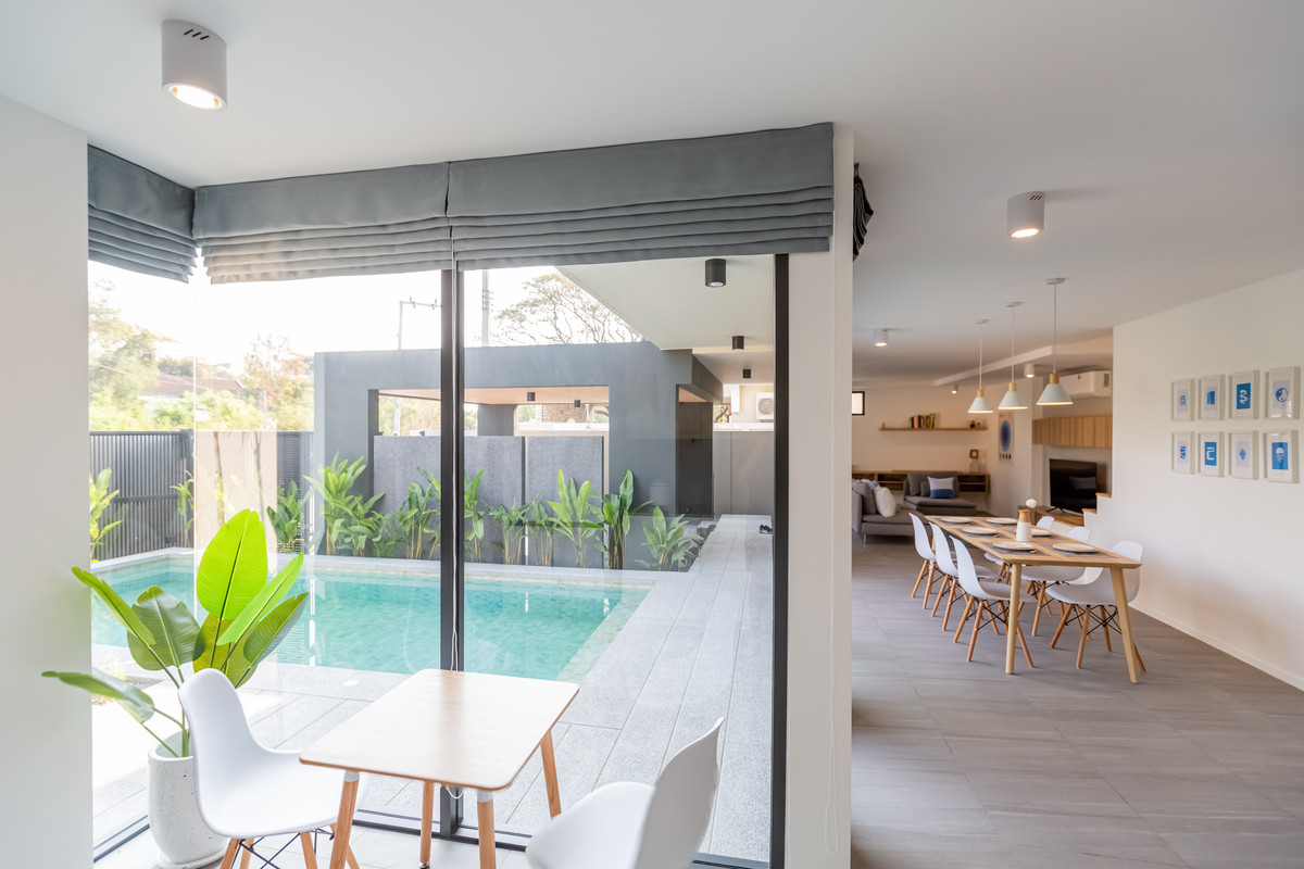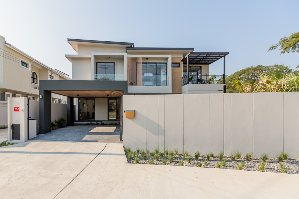 This contemporary 220-square-meter residence in Hang Dong features a functional open-plan layout comprising three bedrooms, three bathrooms, and a integrated lounge and dining area. The architectural design prioritizes modern utility, incorporating a fully equipped kitchen, a dedicated laundry room, under-stair storage, and an additional external storeroom. High-end climate control is maintained through air conditioning throughout all interior spaces, while the master bathroom includes a full-sized bathtub. The exterior grounds consist of professionally landscaped gardens and a private saltwater swimming pool, with covered parking provided for two vehicles. This property allows for pet ownership, including dogs, and the rental rate includes internet connectivity, regular pool servicing, and professional garden maintenance. Located in a quiet residential enclave directly behind Kad Farang Village, the home is a two-minute walk from Rimping Supermarket and the Premium Outlet mall. Its proximity to major educational institutions makes it highly practical for international families, situated within ten minutes of Lanna International School, SBS, Panyaden, Meritton International British School, and Grace International School. This location offers immediate access to private healthcare and shopping facilities while maintaining a peaceful environment away from main road nois