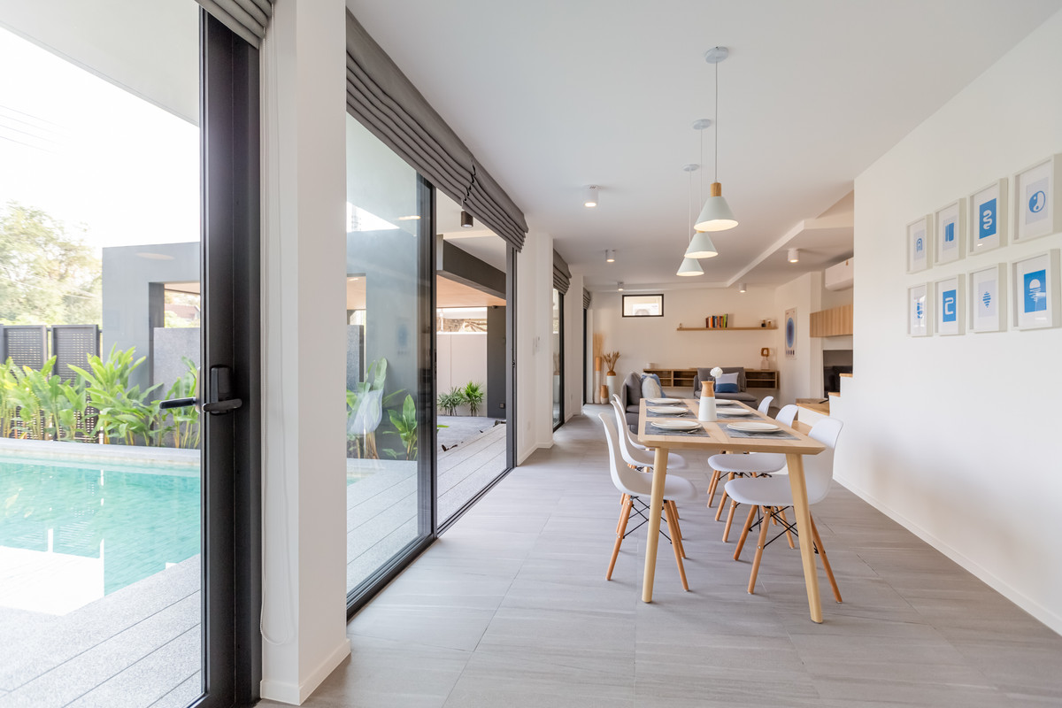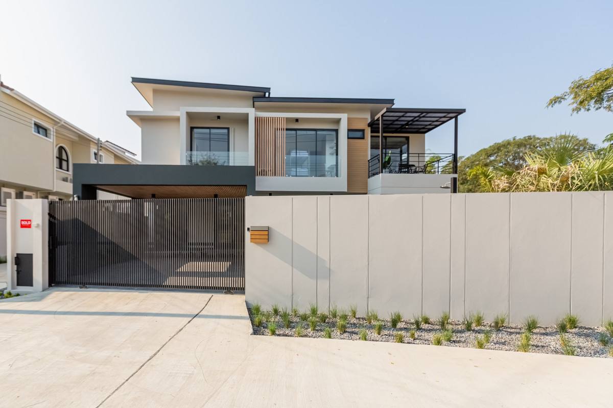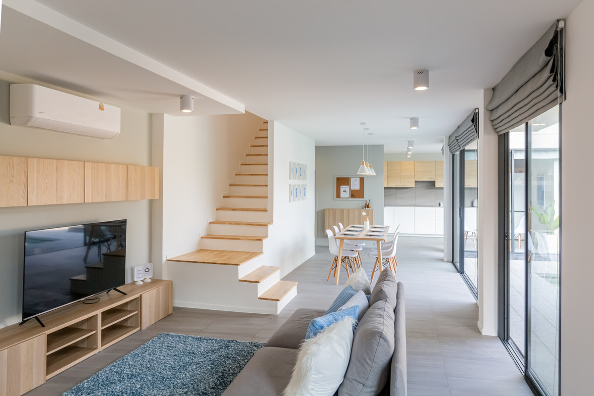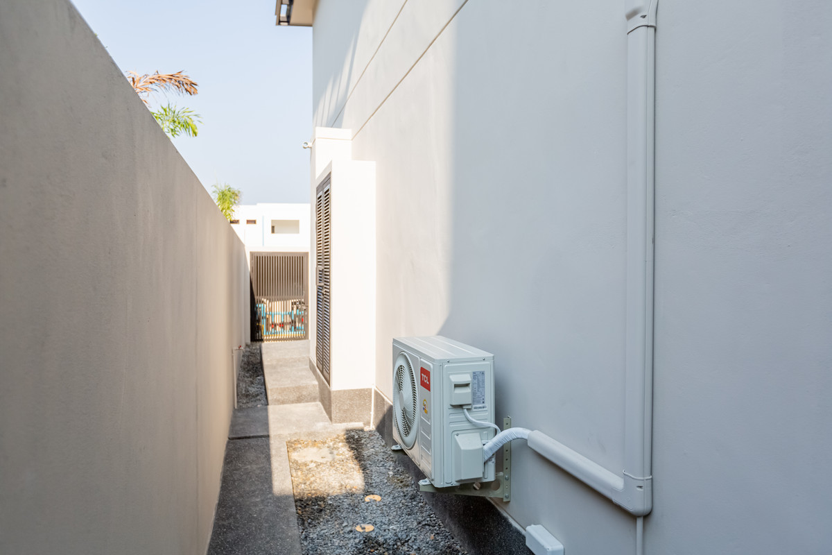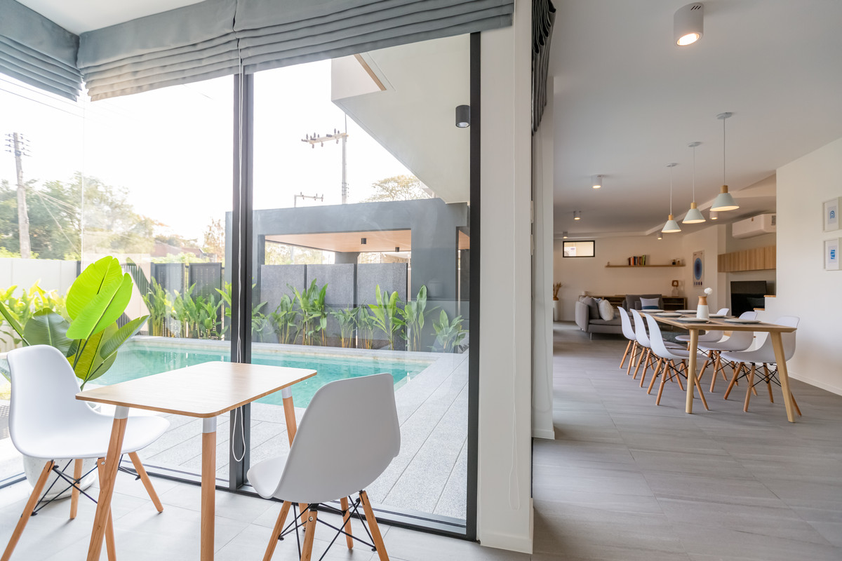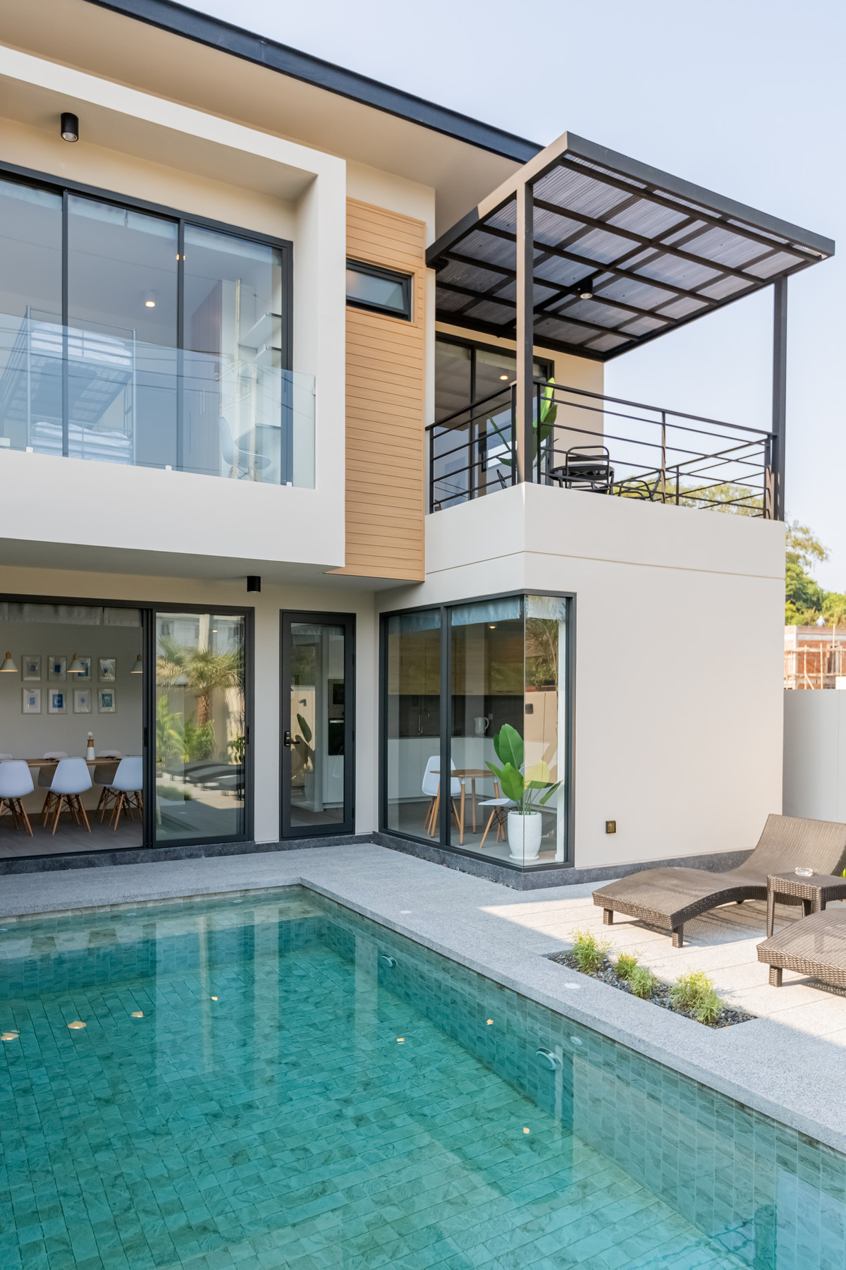 This contemporary 220-square-meter residence in Hang Dong features a functional open-plan layout comprising three bedrooms, three bathrooms, and a integrated lounge and dining area. The architectural design prioritizes modern utility, incorporating a fully equipped kitchen, a dedicated laundry room, under-stair storage, and an additional external storeroom. High-end climate control is maintained through air conditioning throughout all interior spaces, while the master bathroom includes a full-sized bathtub. The exterior grounds consist of professionally landscaped gardens and a private saltwater swimming pool, with covered parking provided for two vehicles. This property allows for pet ownership, including dogs, and the rental rate includes internet connectivity, regular pool servicing, and professional garden maintenance. Located in a quiet residential enclave directly behind Kad Farang Village, the home is a two-minute walk from Rimping Supermarket and the Premium Outlet mall. Its proximity to major educational institutions makes it highly practical for international families, situated within ten minutes of Lanna International School, SBS, Panyaden, Meritton International British School, and Grace International School. This location offers immediate access to private healthcare and shopping facilities while maintaining a peaceful environment away from main road nois