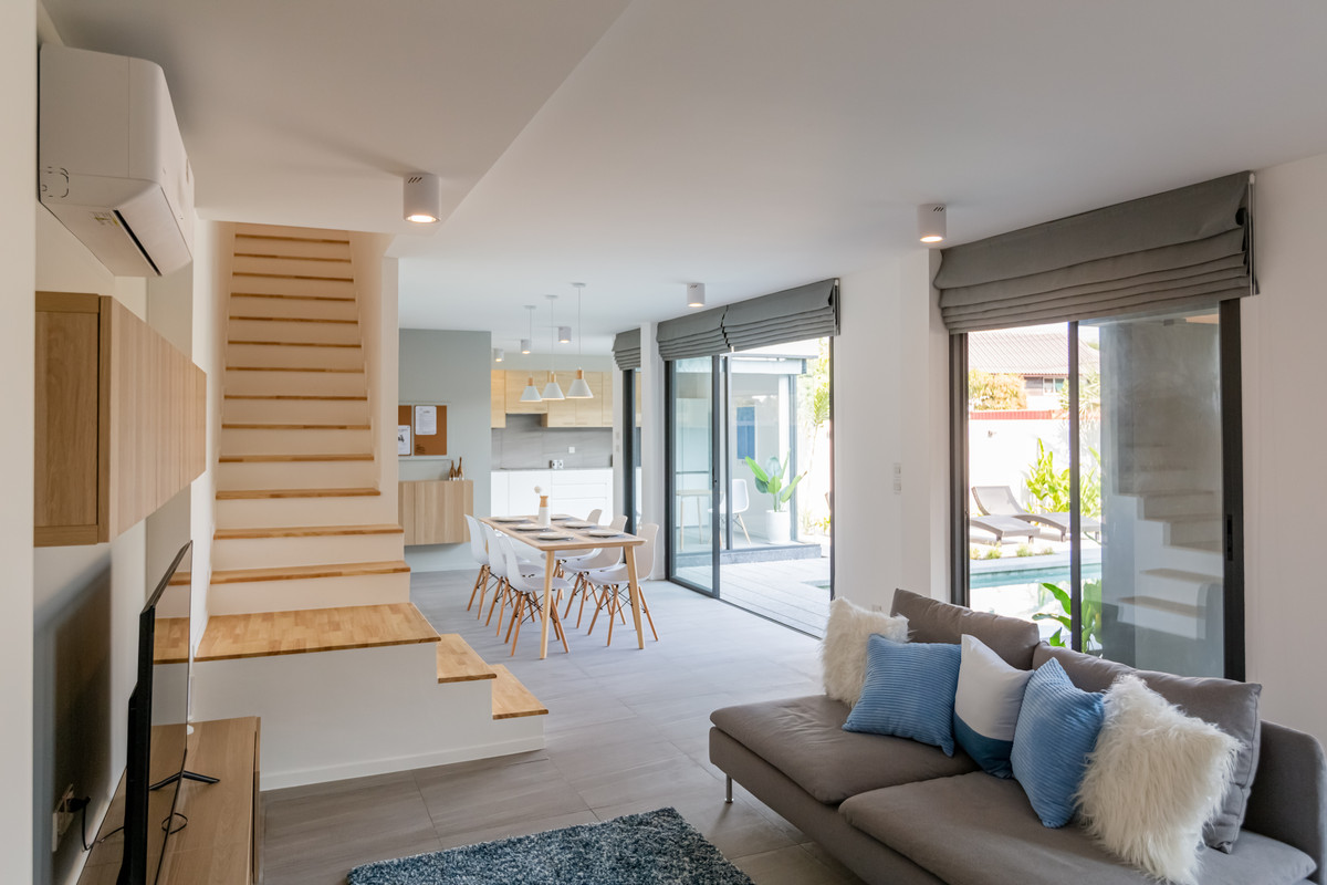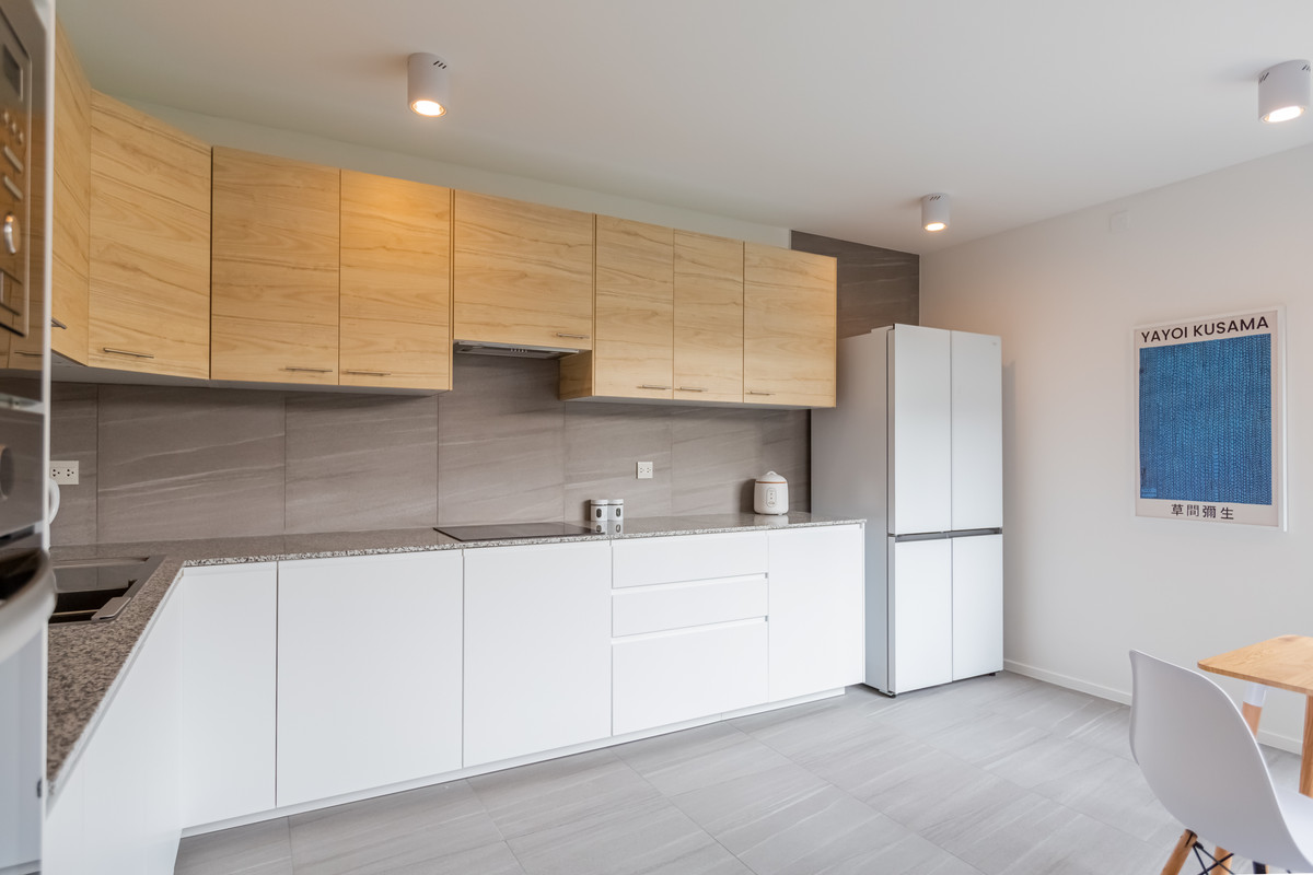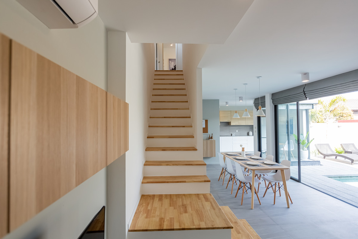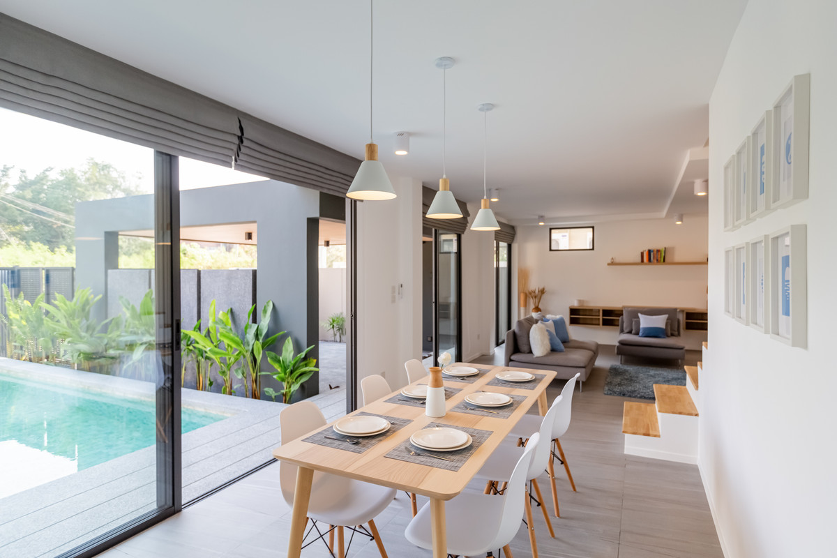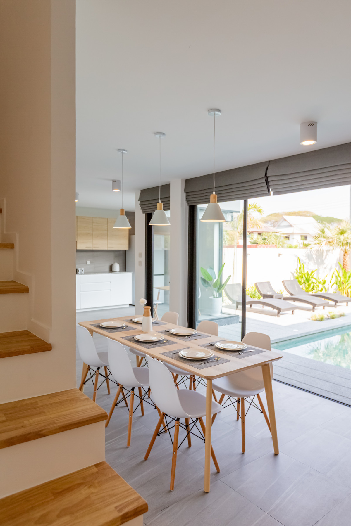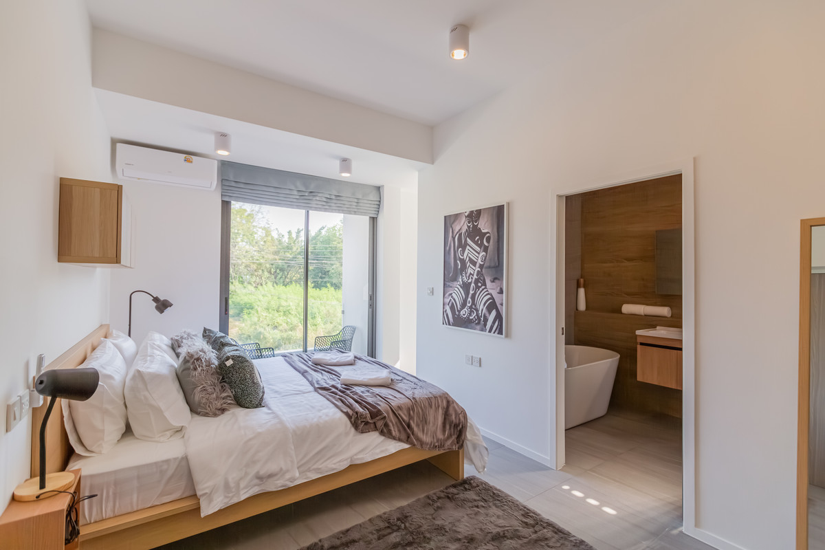 This contemporary 220-square-meter residence in Hang Dong features a functional open-plan layout comprising three bedrooms, three bathrooms, and a integrated lounge and dining area. The architectural design prioritizes modern utility, incorporating a fully equipped kitchen, a dedicated laundry room, under-stair storage, and an additional external storeroom. High-end climate control is maintained through air conditioning throughout all interior spaces, while the master bathroom includes a full-sized bathtub. The exterior grounds consist of professionally landscaped gardens and a private saltwater swimming pool, with covered parking provided for two vehicles. This property allows for pet ownership, including dogs, and the rental rate includes internet connectivity, regular pool servicing, and professional garden maintenance. Located in a quiet residential enclave directly behind Kad Farang Village, the home is a two-minute walk from Rimping Supermarket and the Premium Outlet mall. Its proximity to major educational institutions makes it highly practical for international families, situated within ten minutes of Lanna International School, SBS, Panyaden, Meritton International British School, and Grace International School. This location offers immediate access to private healthcare and shopping facilities while maintaining a peaceful environment away from main road nois