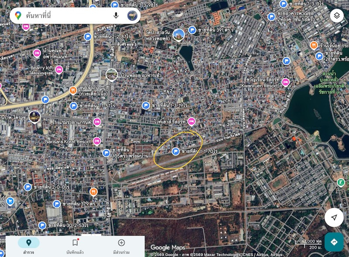 Land for sale in Korat city. Next to Ruam Reng Chai Road, area 1-1-70 rai, suitable for building a house for living in the city, hotel, apartment, department store, showroom, commercial location near Bung Ta Lua.