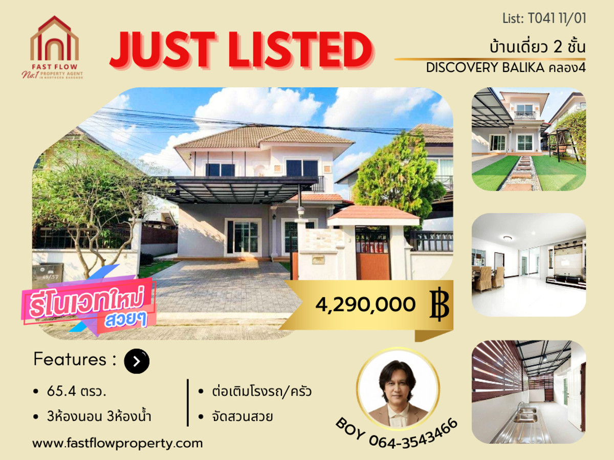 Single house for sale, Lam Luk Ka Khlong 4, Discovery Balika Rangsit Khlong 4 Village. Newly renovated. Includes extended garage, kitchen, and side awning. Located on Sai Pracharat Road, Phra Ong Chao Sai Road. Contact: Thanabodee (Boy) Fast Flow Property Contact number Line ID: boykrub15 Listing no: T041 Property Detail: - 2-story single house for sale, Discovery Balika Rangsit-Khlong 4 project. - House located in Soi 2. - Land size: 65.4 square wa. - Total usable area including extended garage and kitchen: approximately 200 square meters. - South-facing house, good ventilation. - Front yard landscaped with a relaxation garden. - 3 bedrooms, 3 bathrooms, 1 living room, 1 family room, 2 kitchens. - Fully extended Thai kitchen at the back of the house. - Extended garage with tiled floor. - Covered parking for 2 cars. - Extended awnings around the house, tiled perimeter. - Granite tile flooring on the ground floor, laminate flooring on the upper floor. - House sold with furniture (2 sofa sets, 2 TV stands, 1 dining table set, curtains throughout the house, 4 air conditioners, 1 swing, water pump, remote control gate). - Newly renovated, ready to move in. Project and Facilities: - Discovery Balika developed by Tara Property Co., Ltd. - Clubhouse/Fitness center/Public park - Monthly common area fee: 1,100 THB - CCTV and 24-hour security. - Easy Pass access to the village. Nearby Places: - Beacon House School - Near Yaem Sa-ard Rangsit School, Chokchai Rangsit School - Near Paolo Hospital, Sinphet Hospital, Saimai Hospital - Near Lad Sawai Central Market, A.C. Khlong 4 Market - Near Big C, Lotus, HomePro, Market Village Khlong 4 - Near BTS Green Line, Kukot Station, Kanchanaphisek Ring Road, Lam Luk Ka Road, Rangsit-Nakhon Nayok Road Location: https://maps.app.goo.gl/Bm44JmsMfirVjwjTA Price: 4,290,000 THB Free bank loan assistance! Viewing available daily. Interested? Price is negotiable. Contact: Mr. Thanabodee (Boy) Contact number Line ID: boykrub15 Contact Fast Flow Property Office Tel: Contact number Line id: @fastflow FB page: facebook.com/fastflowproperty www.fastflowproperty.com We offer free advertising for all types of real estate sales and listings.