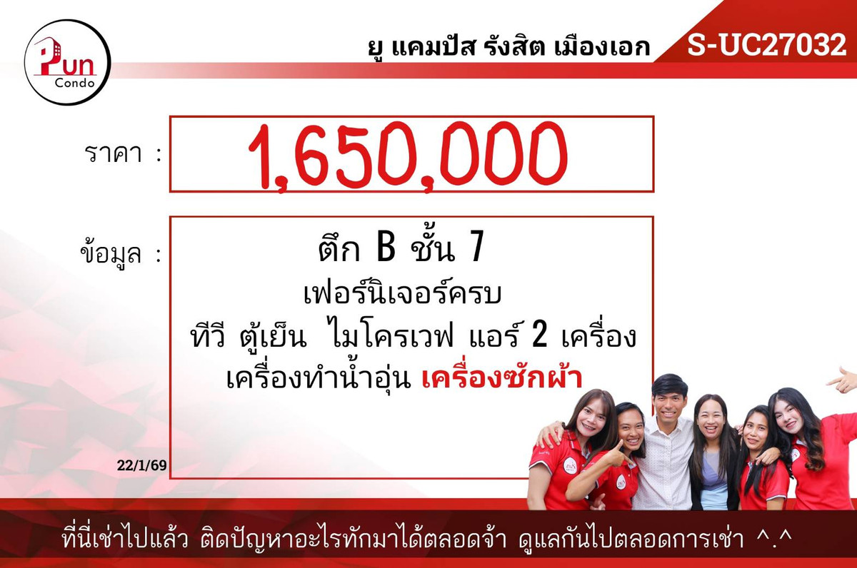 ✅ Selling 𝙐 𝘾𝙖𝙢𝙥𝙪𝙨 𝙍𝙖𝙣𝙜𝙨𝙞𝙩-𝙈𝙪𝙖𝙣𝙜𝙖𝙠𝙚 (U Campus Rangsit) #and every condo in the Rangsit area 🏠 Cute price room Complete functions Very worthwhile ❄️ Special "2 air conditioners" Cool throughout the room 🚗 Good location near Rangsit University & near the Red Line BTS, convenient travel Buy to live in yourself, great value 🌟 Buy and rent, very good value #Condo for sale at Rangsit University 🏖️ Price only 1,650,000 baht | (S-Uc27032) 🏖️ Building B, 7th floor | Size 27 sq m. ——————————————————————— ✅ Room price lower than market 10%–15% available periodically. Anyone waiting to buy? You can inform the admin 🌟 There are many types of rooms, many buildings #every project in the Rangsit area > If you want to see more rooms, you can talk to us. 💬 📲 Line: @pcondo (with @) 📞Welcome to give advice on buying and selling Ms. Kat: Contact number Ms. Pream: Contact number 📝 Credit counseling service until the loan is passed 📑 Take care of all documents in every step until the transfer day ——————————————————————— #Condo for sale Rangsit #Condo for sale near Rangsit University #Condo U Campus Muang Ake #Condo for sale with tenant #UCampusRangsit #Condo for sale U Campus Muang Ek #Puncondo #agent #Rangsit condo deposit #investment #real estate broker #Condo in the Rangsit area
