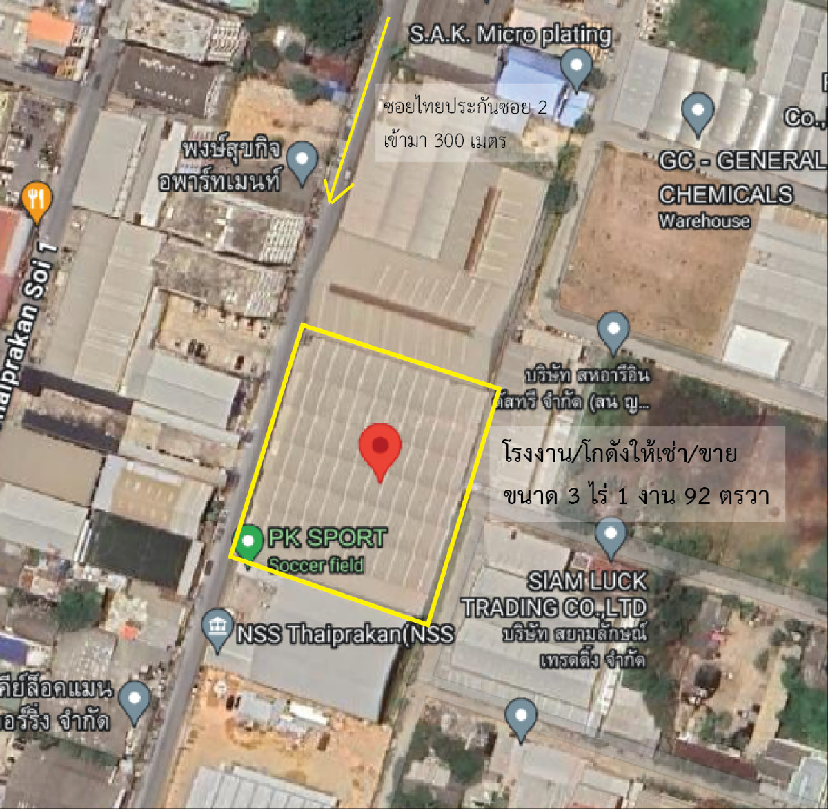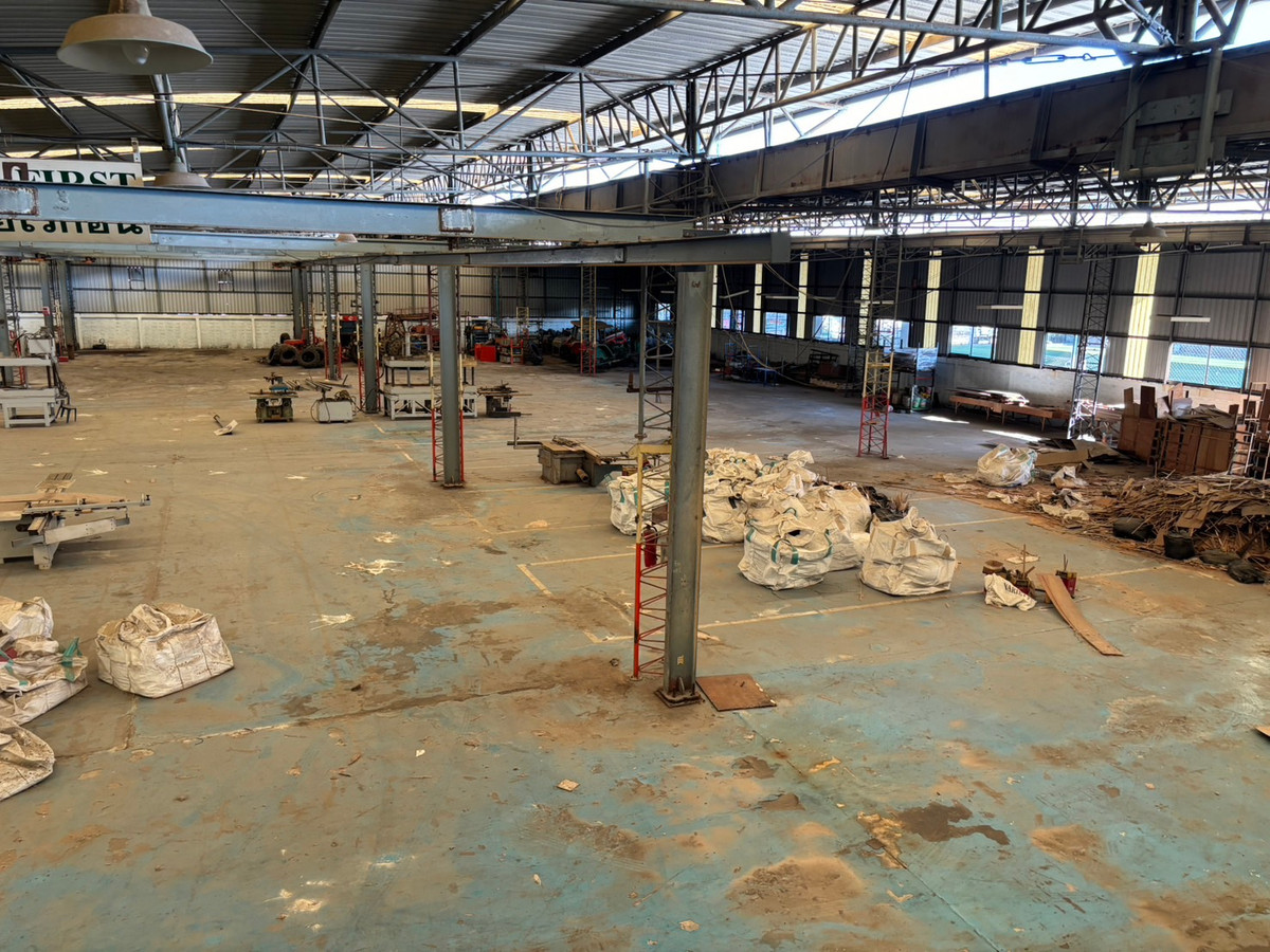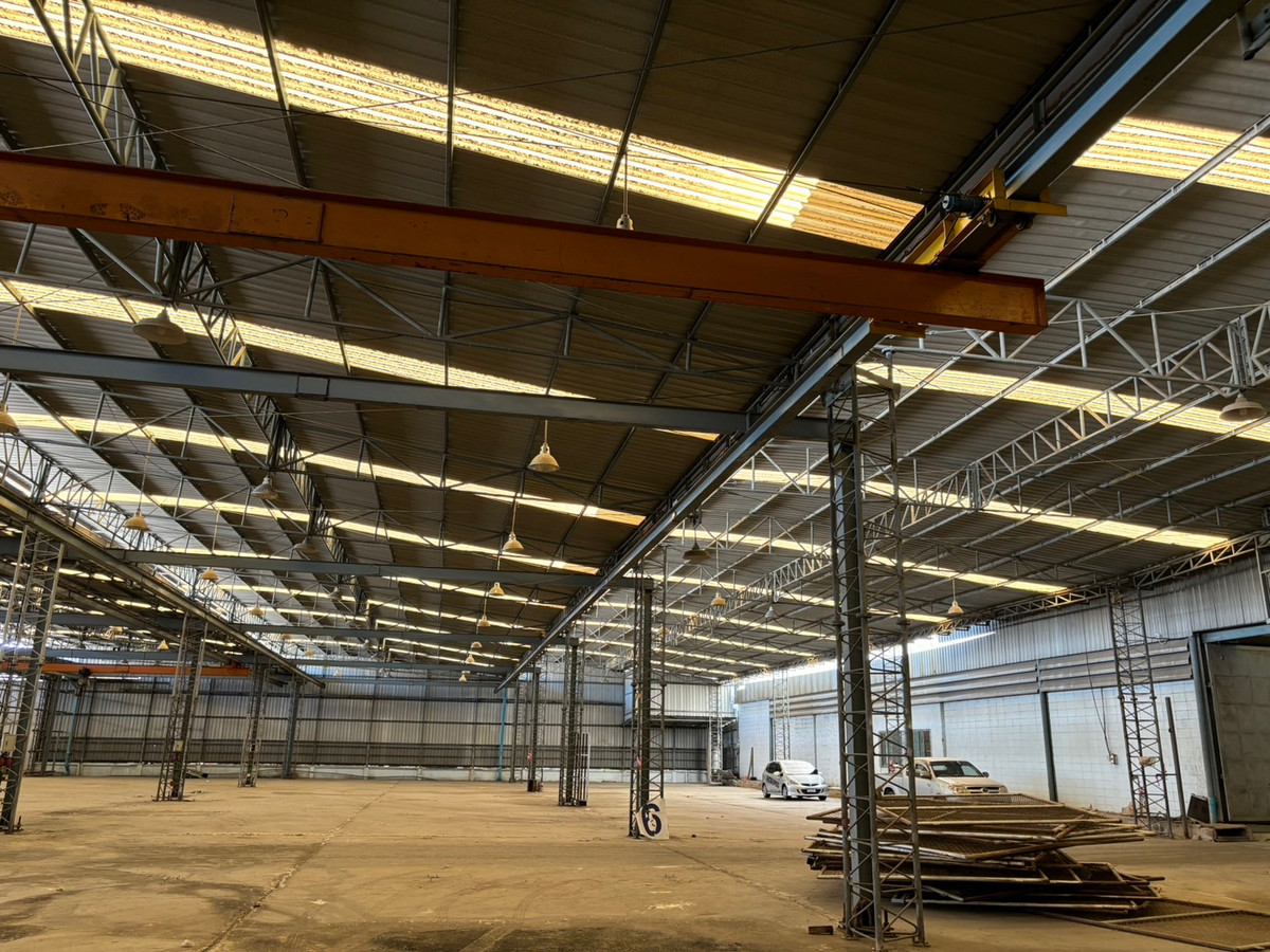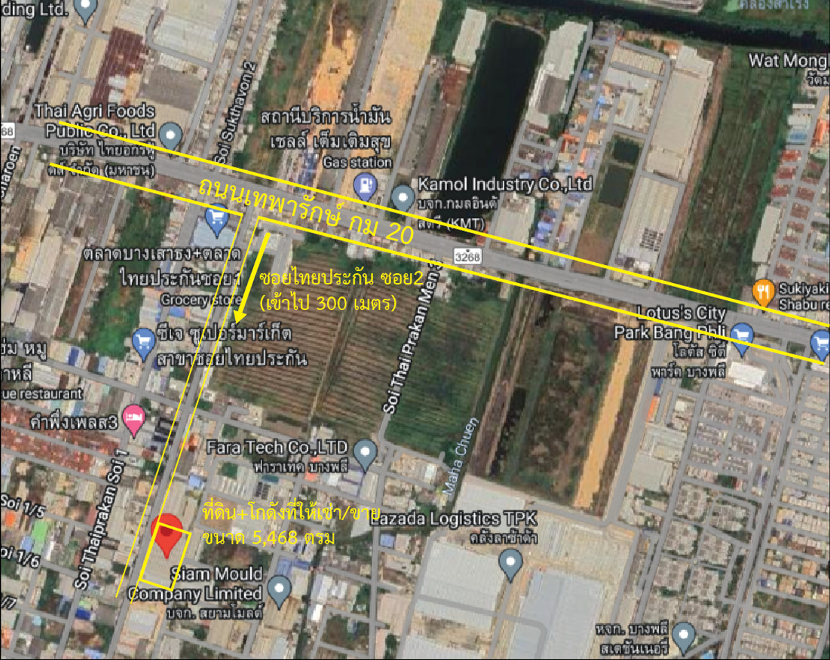 Warehouse/factory for rent, size 4,000 sq m. (2 and a half rai) located 300 meters from the entrance of Soi Thai Prakan 2 Located on Thepharak Road, km 20 Height 5 meters - 6 meters For rent at 100 baht/sq m ( 4,000 sq m) or for sale at 79 million (total 5,468 sq m) The area can be split to be rented (Can be rented less than 4,000 sqm). Willing to zoning/ adjusting/ modifying to fit your desire. Minimum rental period 1 year, deposit 2 months in advance, pay 1 month in advance The warehouse structure covers almost the entire area. Can store almost the entire space. There is a small office and building ready to use. The floor is the floor of an old tractor factory. Able to support weight very well. This property is in Purple Area and be able to make factory. There is a structure for attaching the crane. If interested, contact Line Id : @630gttxz