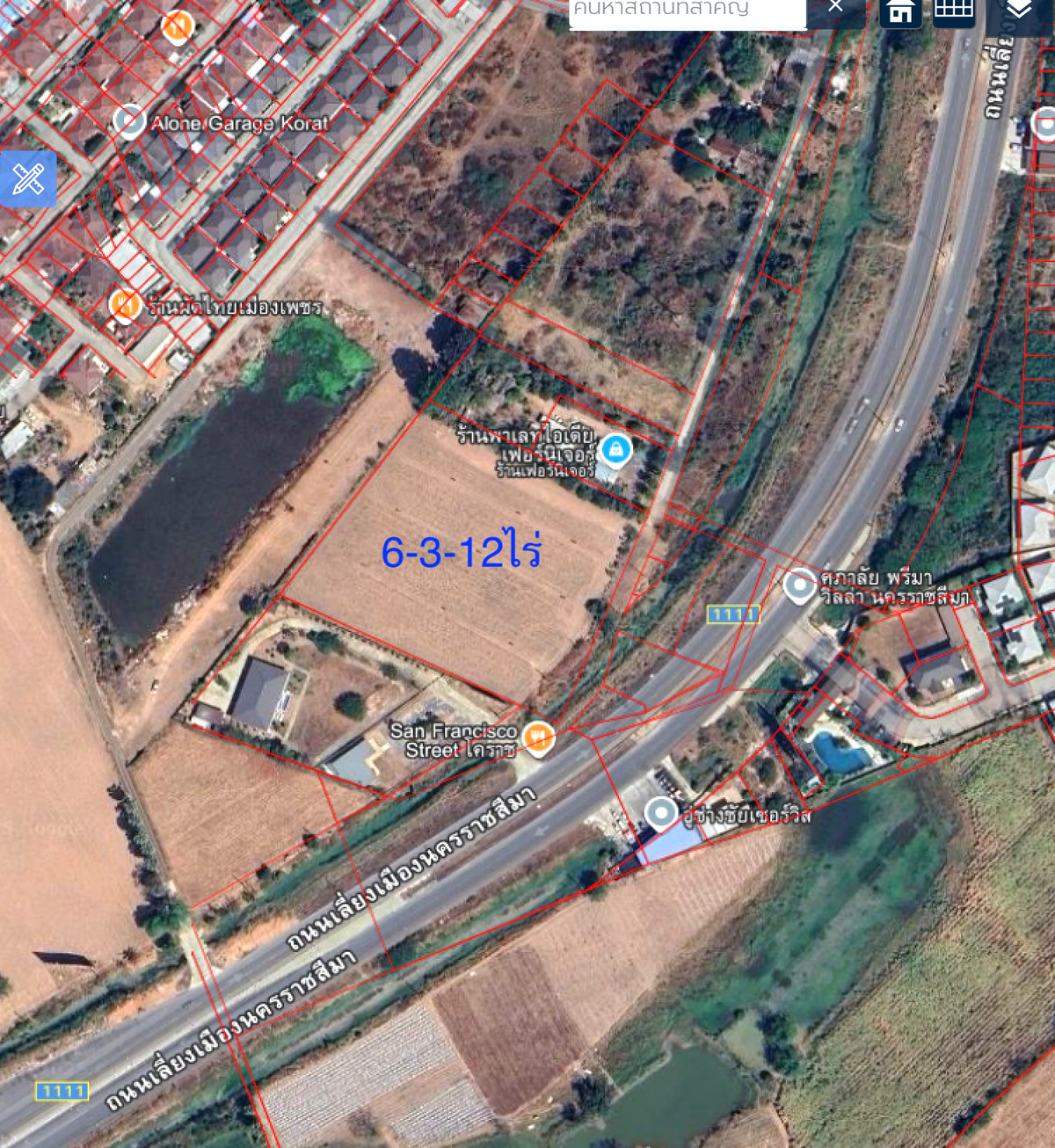 Land for sale next to the bypass road, bypassing the city, area 6-3-12 rai, opposite Supalai Village, near Makro, near Do Home, near Suranaree Industrial Zone. The location is suitable for development