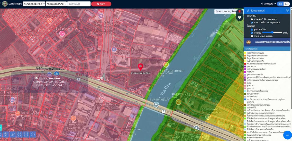 Land for sale next to the Tha Chin River. Width next to the river 135 meters, Sam Phran, Nakhon Pathom Area 16-0-68 rai (6,468 square wah) Width next to Phutthamonthon Sai 7 Road, approximately 12 meters Width next to the Tha Chin River, approximately 135 meters @noossaraland@Noossaraland and home