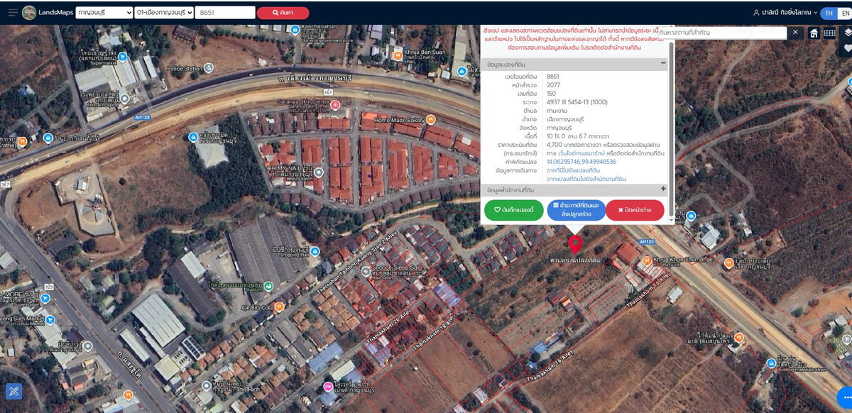 Rectangular land, width 70 meters, depth 235 meters front next to Kanchanaburi bypass road, line 367 nearby places - Kaeng Sian Market - Synphaet Hospital Kanchanaburi - Global House Kanchanaburi - Kanchanaburi Provincial Land Office - Sirikanchanaram Temple (Khao Phurang Bon Temple) - Khao Krachai Viewpoint, Kanchanaburi - Khao Borom Phothi Wihan Monastery Kanchanaburi Province Price 10 million baht per rai If interested call Contact number (Kae) Line ID: mangokay