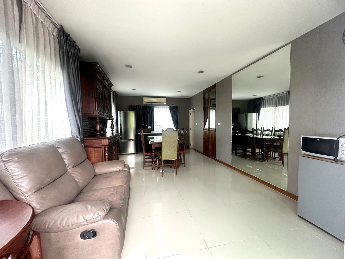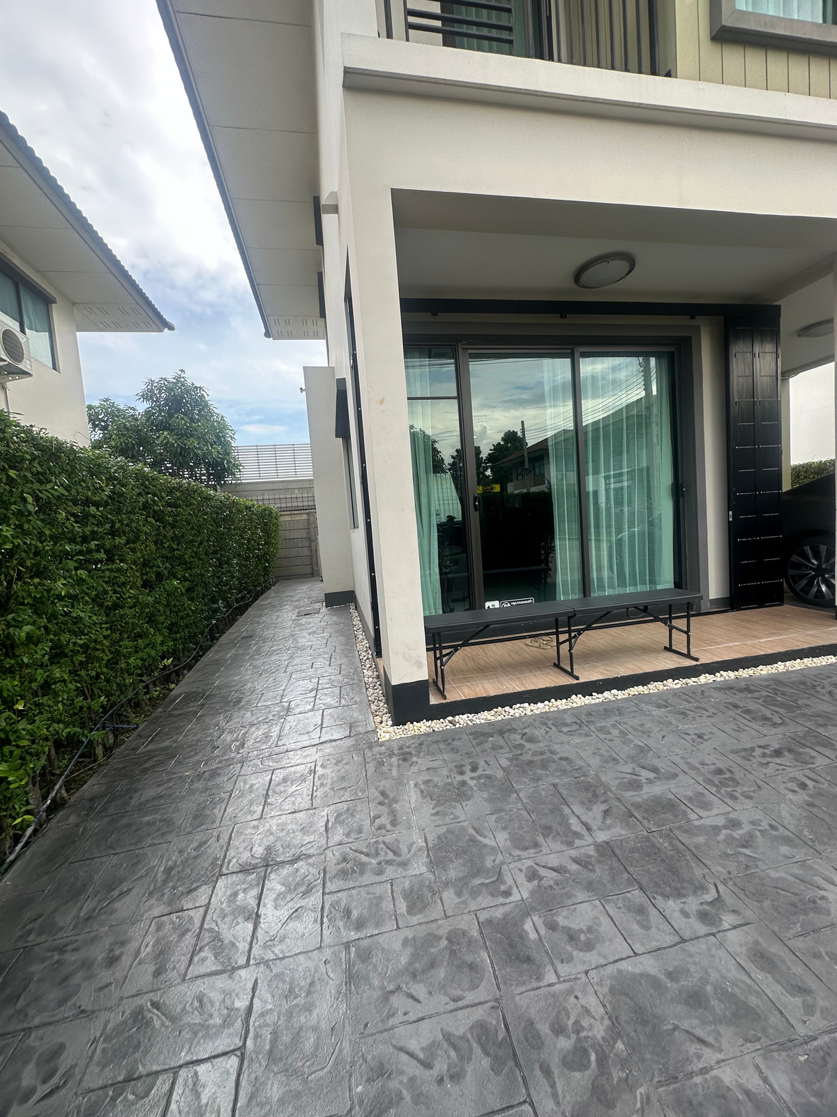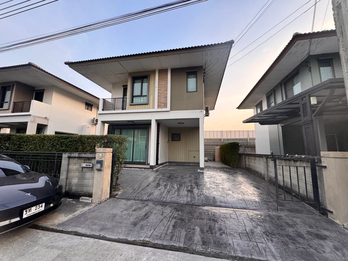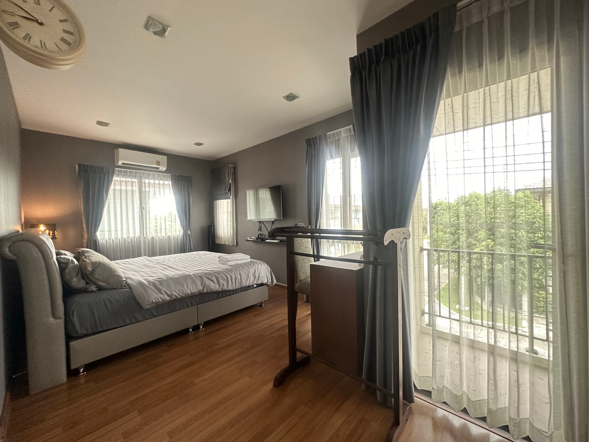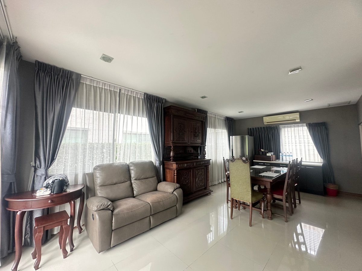 The entrance to the village is on the main King Kaew Road, convenient to travel, near Bangna-Trad Road. and Suvarnabhumi Airport House 41 square wah, usable area 158 square meters. 3 bedrooms, 2 bathrooms Bedroom 1 king size bed Bedroom 2 queen size bed Bedroom 3 extra bed Complete with a set of bedsheets Air conditioning throughout the house Dining table, 6 seats, refrigerator, microwave, electric stove Smoke hood, washing machine, TV, built-in wardrobe in every room. Free High speed internet AIS Fiber Free cleaning 1 time/month including changing bed sheets. Free gardening every 3 months Conditions of stay Pay insurance for 2 months Rent before staying for 1 month Line ID : junezzta