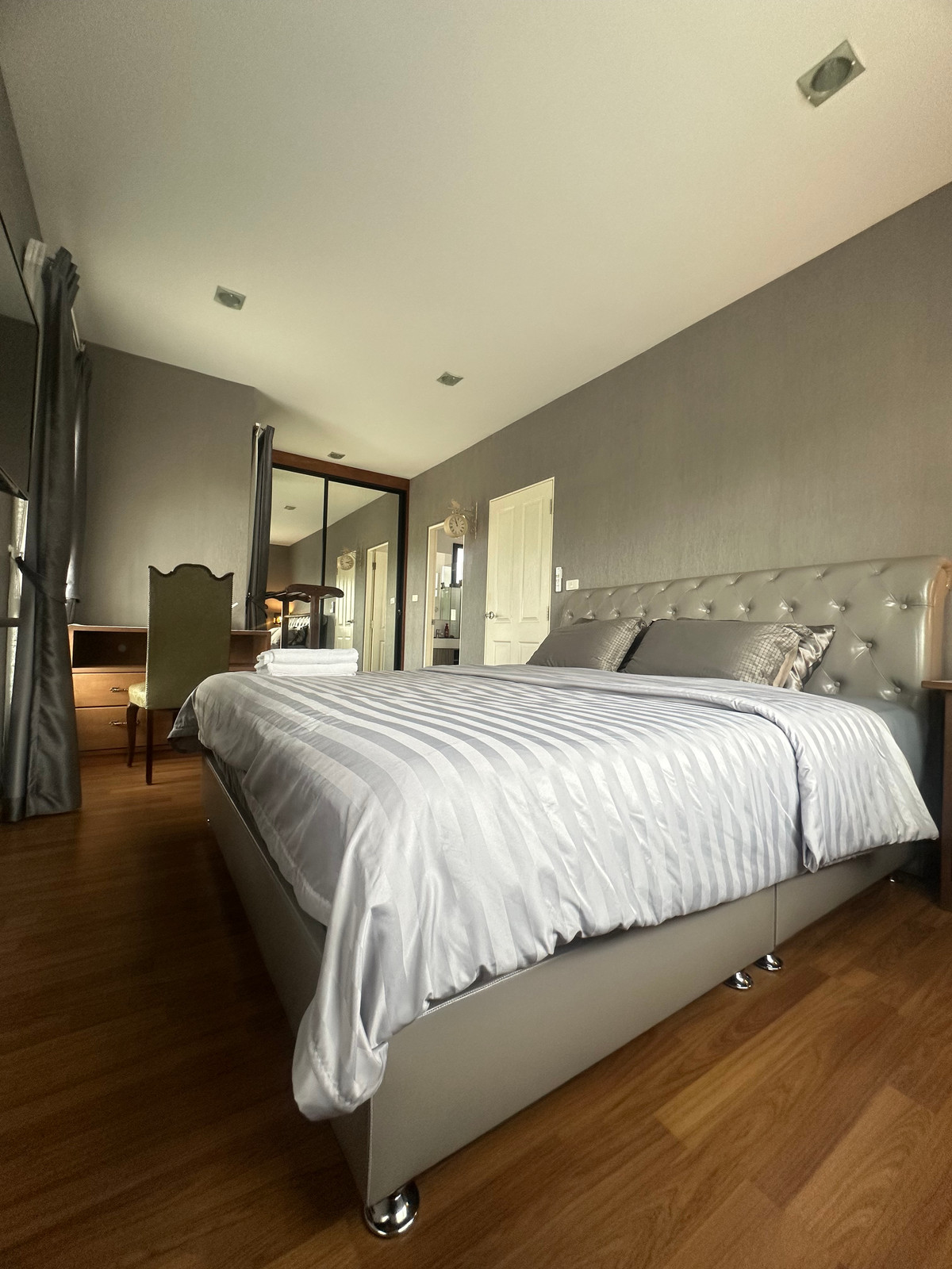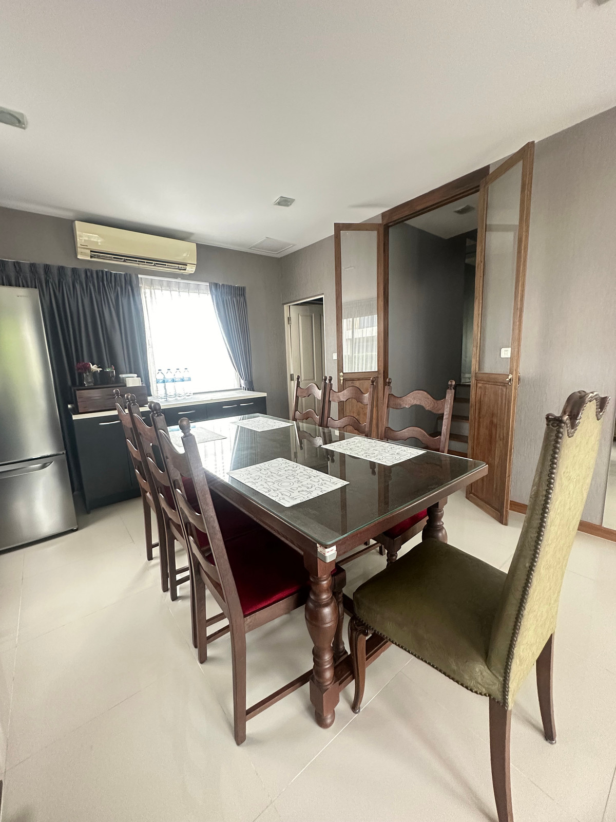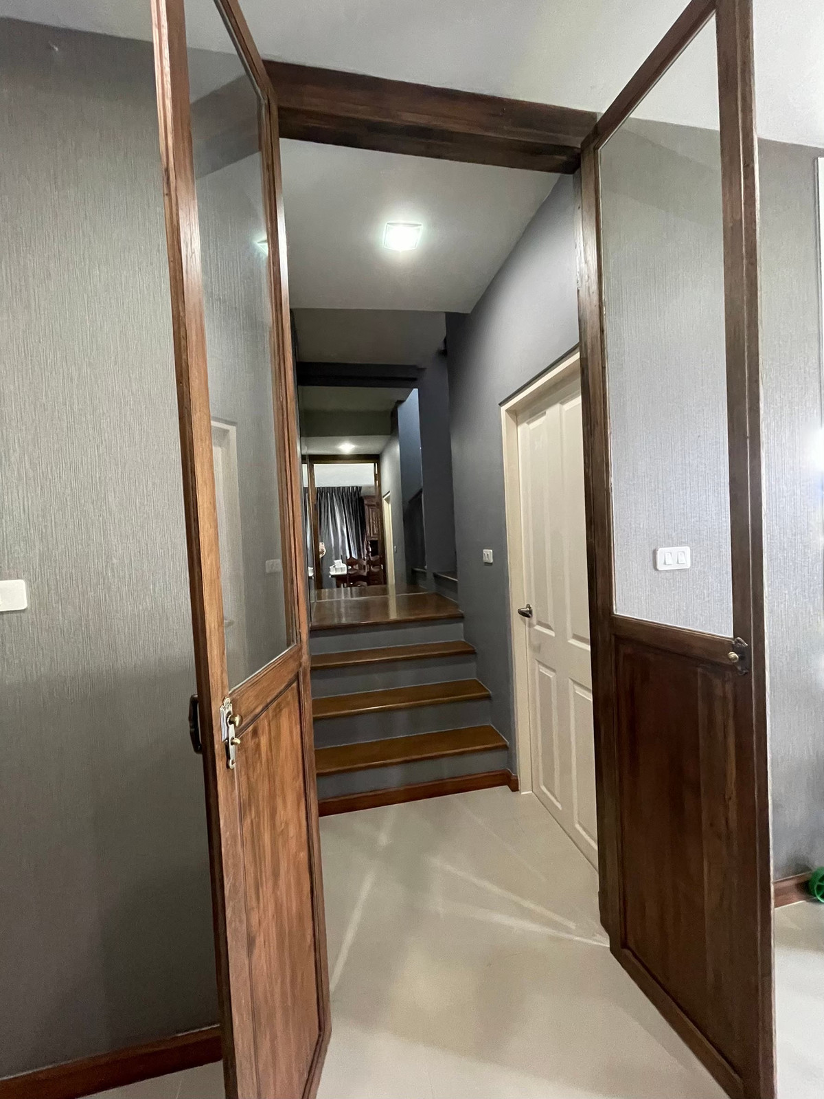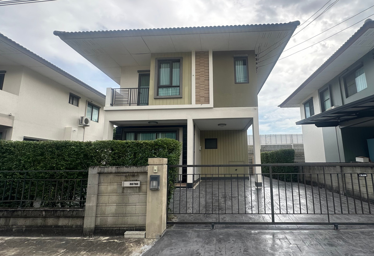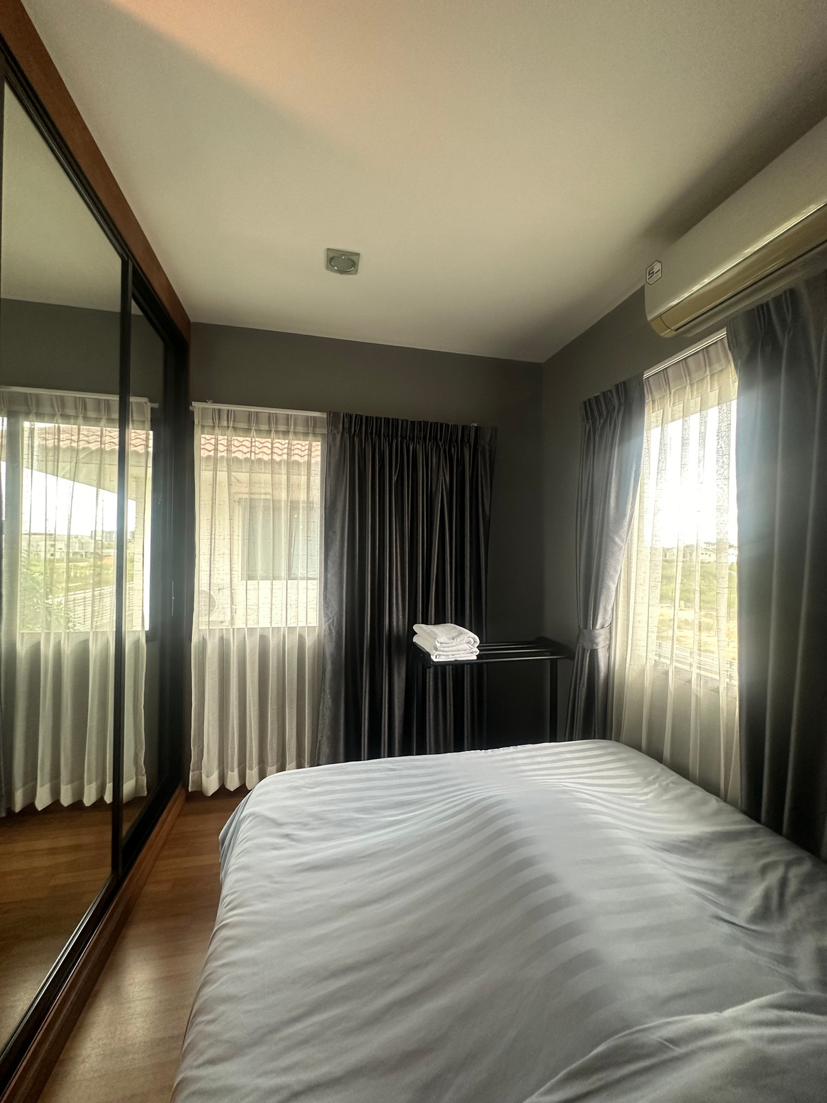 The entrance to the village is on the main King Kaew Road, convenient to travel, near Bangna-Trad Road. and Suvarnabhumi Airport House 41 square wah, usable area 158 square meters. 3 bedrooms, 2 bathrooms Bedroom 1 king size bed Bedroom 2 queen size bed Bedroom 3 extra bed Complete with a set of bedsheets Air conditioning throughout the house Dining table, 6 seats, refrigerator, microwave, electric stove Smoke hood, washing machine, TV, built-in wardrobe in every room. Free High speed internet AIS Fiber Free cleaning 1 time/month including changing bed sheets. Free gardening every 3 months Conditions of stay Pay insurance for 2 months Rent before staying for 1 month Line ID : junezzta