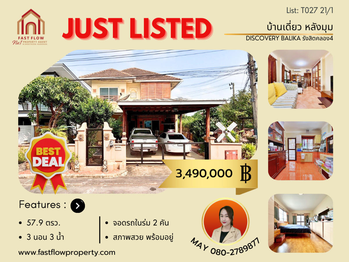 Bargain! Detached house, 57.9 sq.wah, corner unit, Discovery Balika, Lam Luk Ka, Khlong 4, Sai Pracharat Road, Phra Ong Chao Sai Road, Rangsit, Khlong 4. MAY Interested, please contact Supaporn, Fast Flow Property Contact number Line id: @fastflow Listing no : T027 Property Detail: - 2-story detached house for sale in Discovery Balika Rangsit-Khlong 4 project. - Good location, corner unit. - Land area 57.9 square wah. - Usable area, including garage extension, approximately 200 square meters. - South-facing house, good ventilation. - Quiet and peaceful, not crowded. - 3 bedrooms, 3 bathrooms, living room, prayer room, study room. - Garage extended and tiled. - Covered parking for 2 cars - Sold with furniture - Sold with 3 air conditioners Project and Facilities: - Discovery Balika project developed by Tara Property Co., Ltd. - Clubhouse/Fitness center/Public park - Monthly common area fee: 1,100 THB - CCTV and 24-hour security - Easy Pass access to the village Nearby Places: – Beacon House Yamsaard Rangsit School, Chokchai Rangsit School – Paolo Hospital, Sinphet Hospital, Saimai Hospital – Lad Sawai Central Market, A.C. Khlong 4 Market – Big C, Lotus, HomePro, Market Village Khlong 4 – BTS Green Line, Kukot Station, Kanchanaphisek Ring Road, Lam Luk Ka Road, Rangsit-Nakhon Nayok Road Location https://maps.app.goo.gl/7dRkuEmVxozSu6d29 Price: 3,490,000 THB Free bank loan assistance service! Viewing available daily. Price negotiable. Contact: Ms. Supaporn (May) Contact number Line ID: @fastflow Contact Fast Flow Property Office Tel: Contact number Line ID: @fastflow FB page: facebook.com/fastflowproperty www.fastflowproperty.com Real estate sales service for all types of properties. Free advertising.