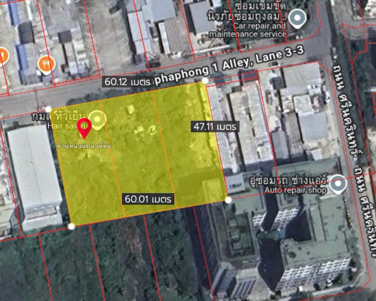 Srinakarin Land 42 suitable for building a residence / developing a housing project / condominium / office ðļInformation about land for sale - divided for sale in 3 title deeds - 231 sq m, 232 sq m, 233 sq m - Width per plot: ~ 20 m. - Depth per plot: ~ 47 m.- Plot shape: Rectangle âĻ 150,000 per sq m. Price 34,650,000 baht ð Location highlight - can enter and exit many routes Wachiratham / Sukhumvit 101/1 / On Nut 44 / Udomsuk 51 - From the main Srinakarin Road 400 m. - Only 450 m. from the Yellow Line, Suan Luang Rama 9 Station - Seacon Square, only 750 m. - Near Paradise Park Mall 750 m. - Near Thainakarin Hospital Interested, please make an appointment to see or ask for more information Meow Tel: Contact number line id: Contact number