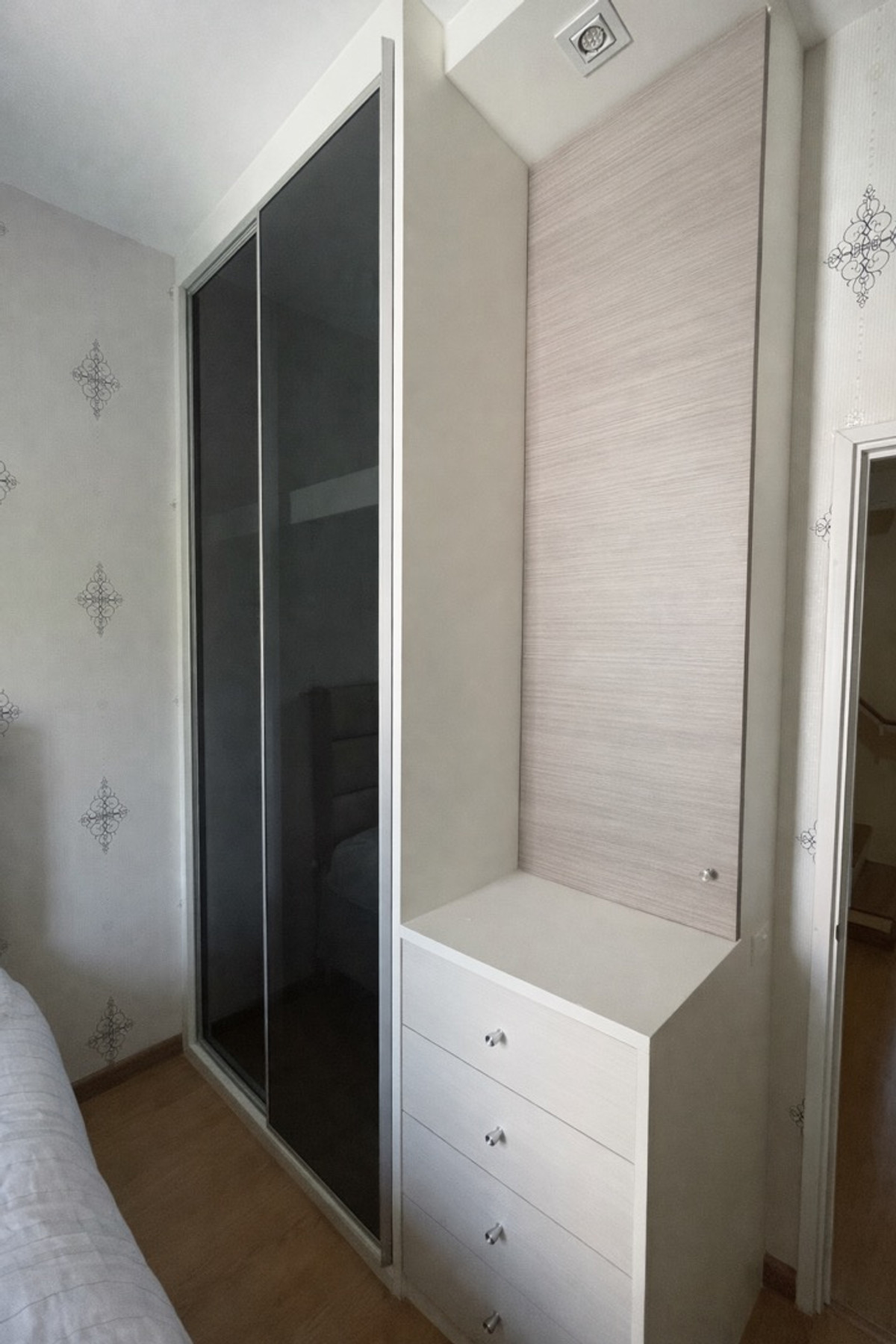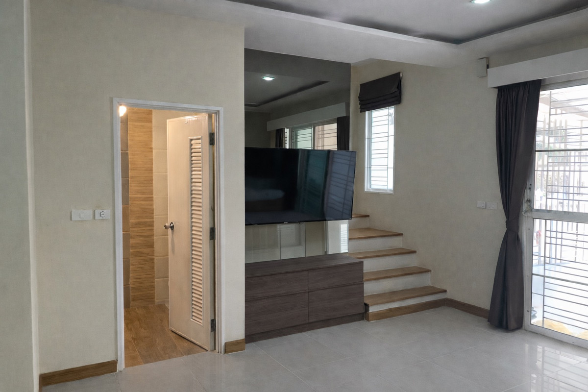 2-story townhome, corner unit, Golden Town (Goldenland) Land 27.8 sq m | usable area 111.2 sq m 4 bedrooms, 3 bathrooms, 2 parking spaces + parking next to the house House in good condition, ready to move in, built-in throughout Strong structure. There has never been a flood In front of the house is a garden. There are no houses , clear, open, good wind, light, comfortable living , private alley, only 4 houses, quiet, private, good neighbors near Si Rat Expressway | near MRT Purple Line near The Mall Ngamwongwan, Lotus, Big C project has 24-hour security guard, CCTV, club, fitness, swimming pool.